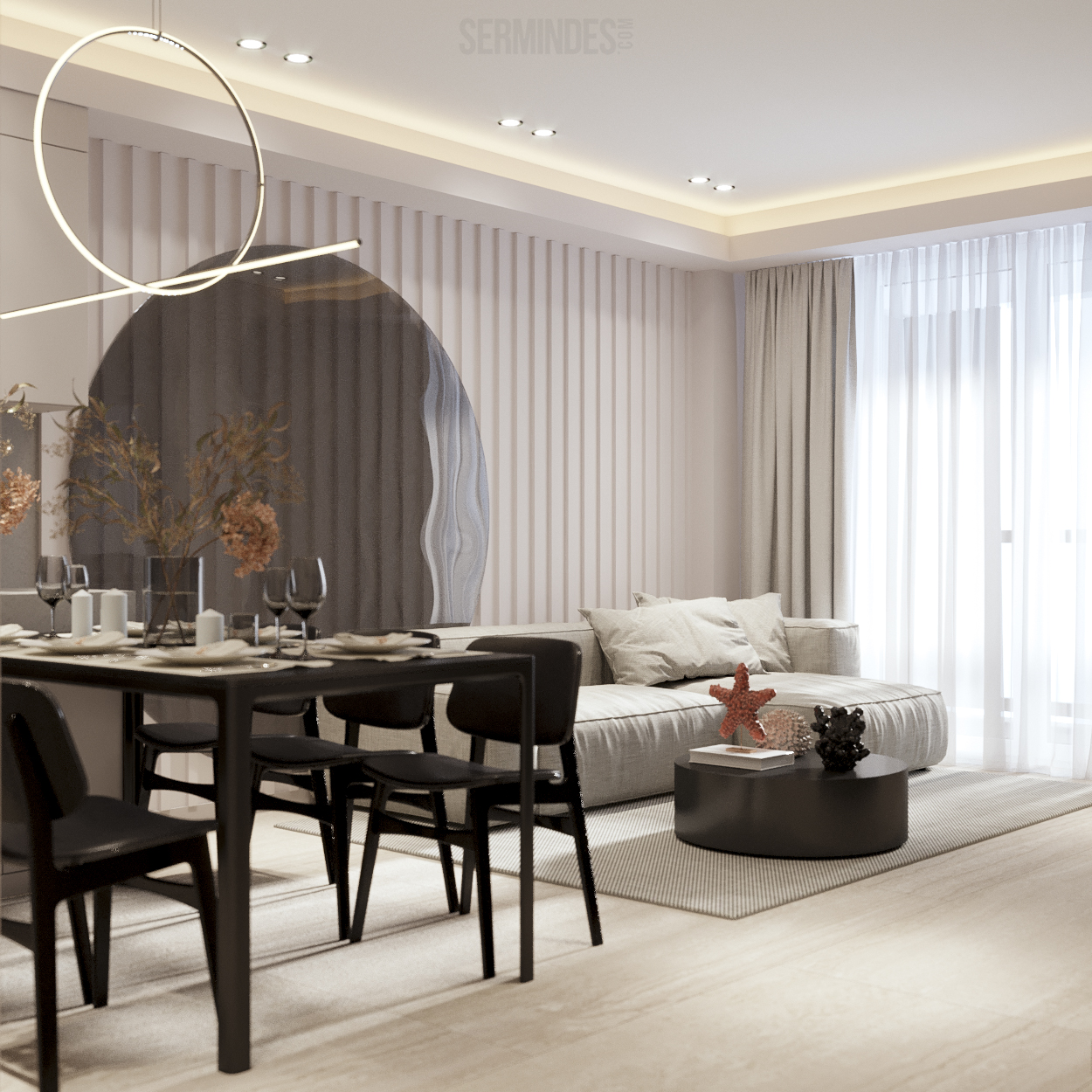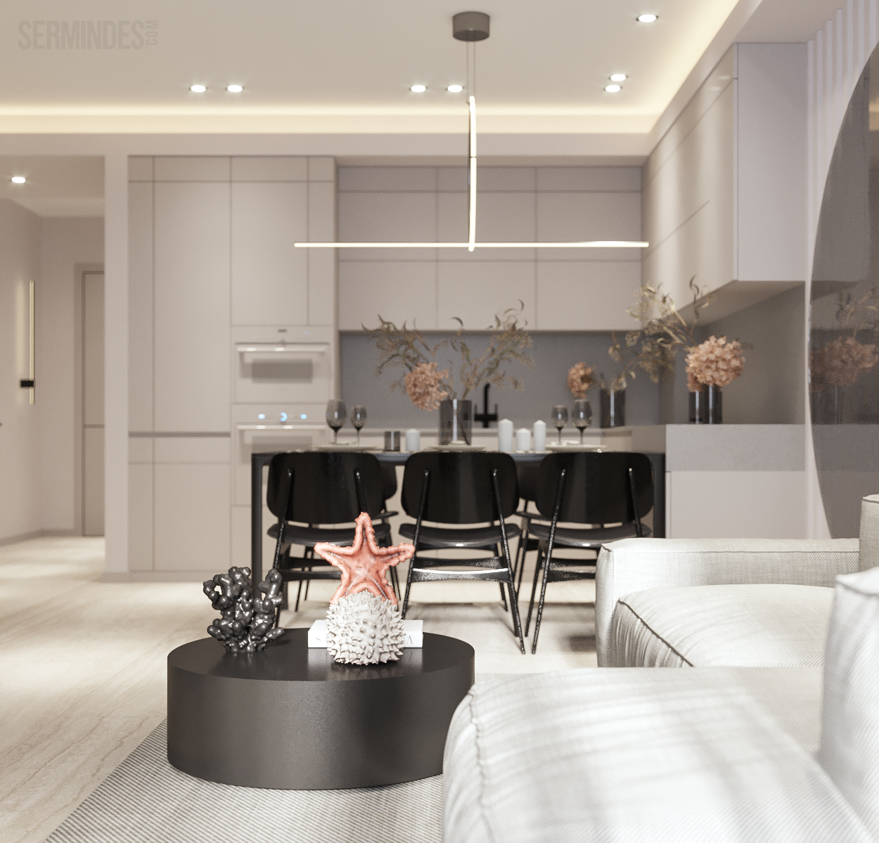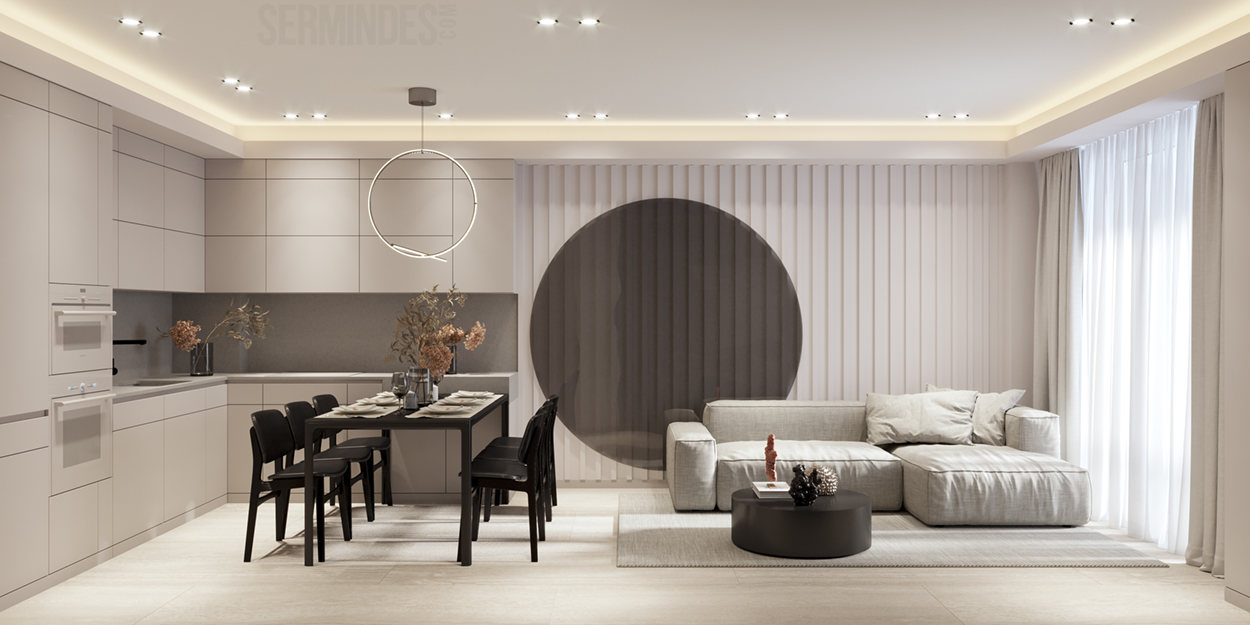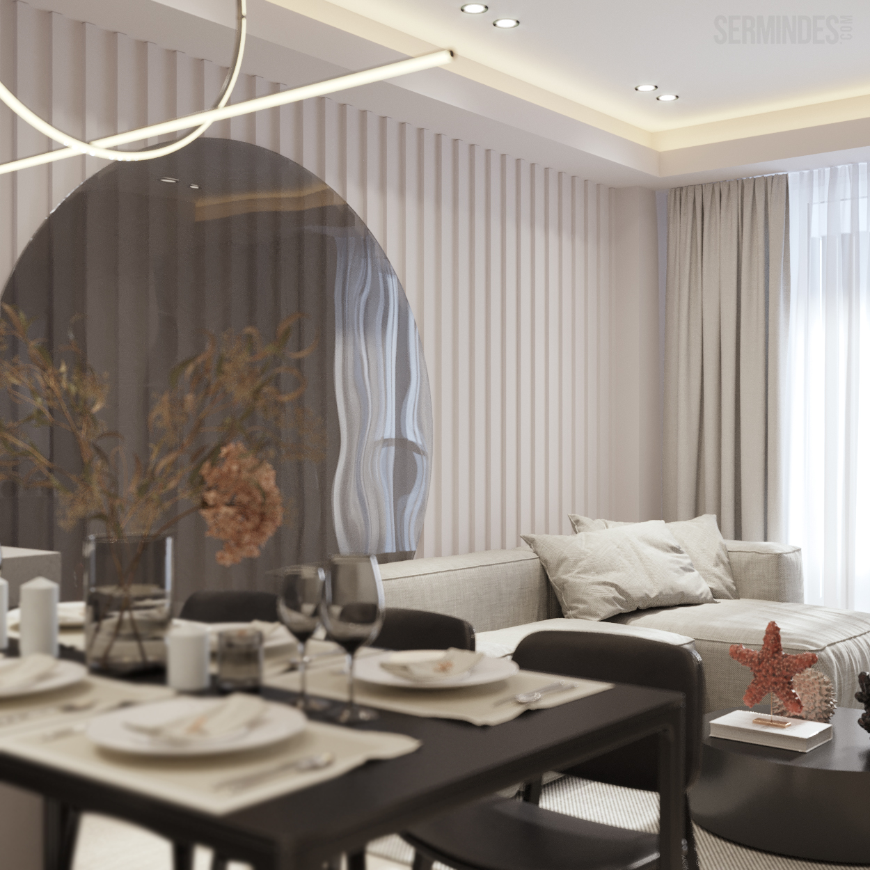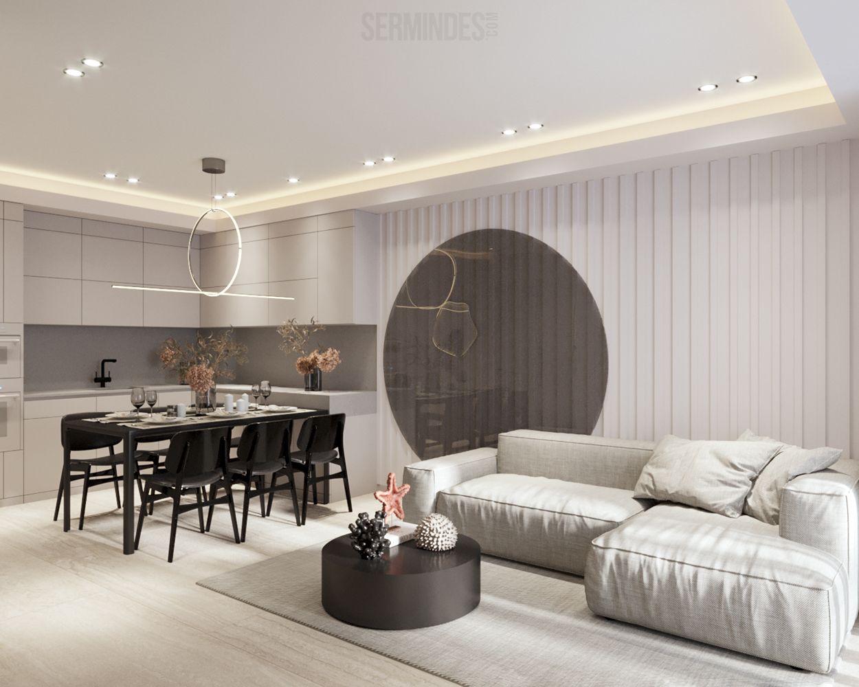 Interior design of an apartment, located in Chisinau, in the residential complex "OASIS". The apartment has an area of 100 square meters of floor space. The implementation of the project takes place in 2022. The contemporary-minimalist style was chosen. The color range in this project has the function of highlighting the travertine on the floor and supporting the open interior ambiance, but also a small contour-contrast is found in small areas with the function of accentuating and contouring.