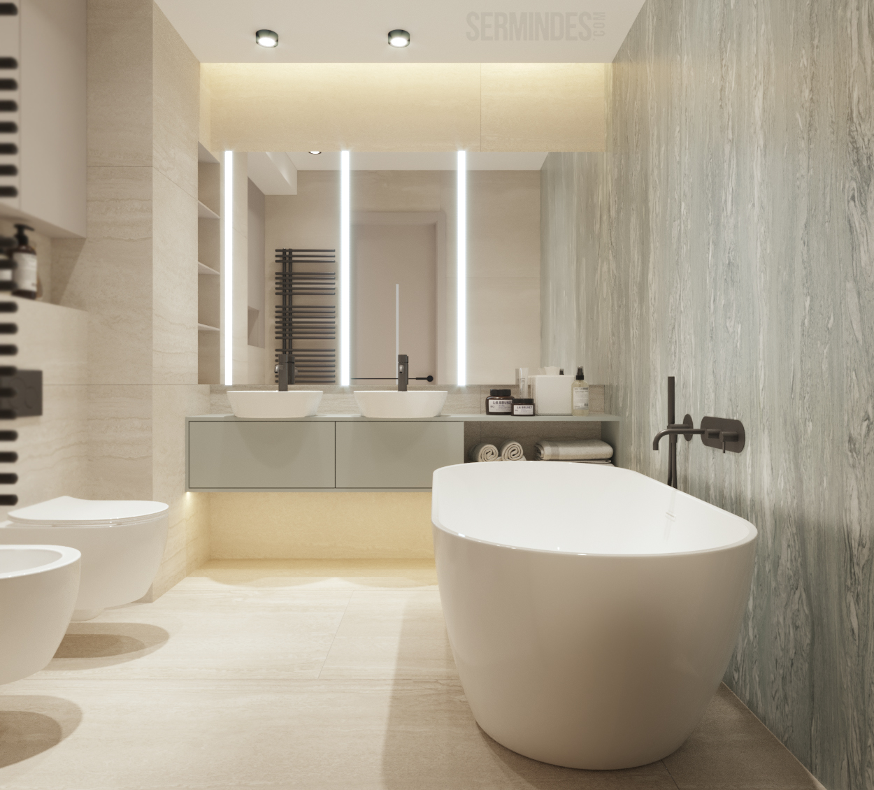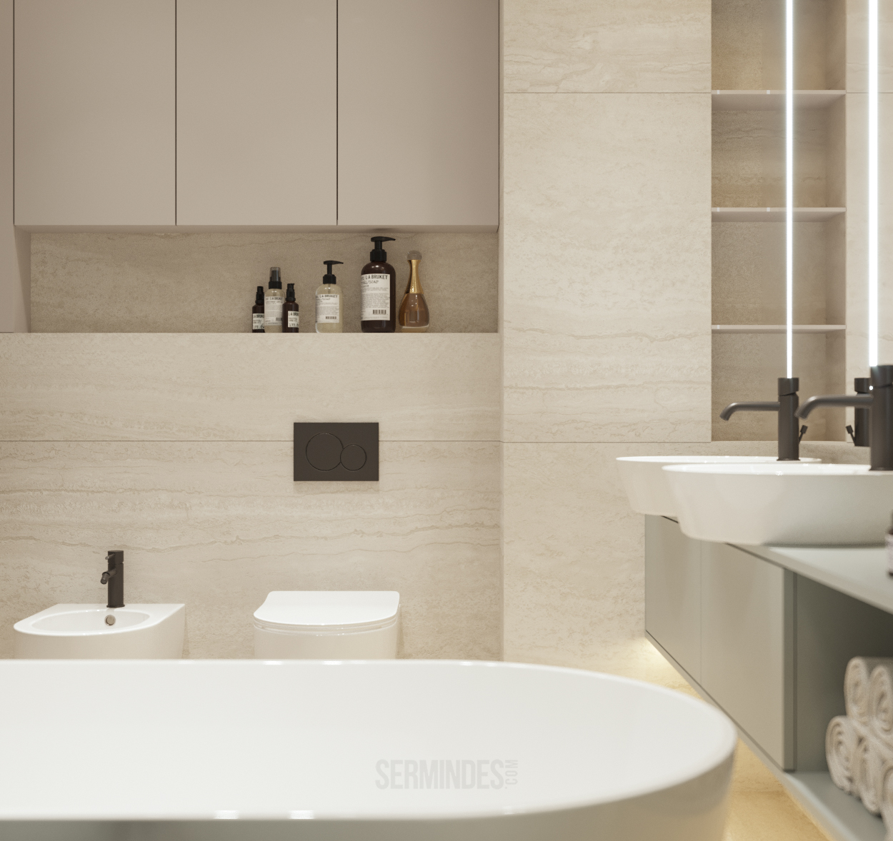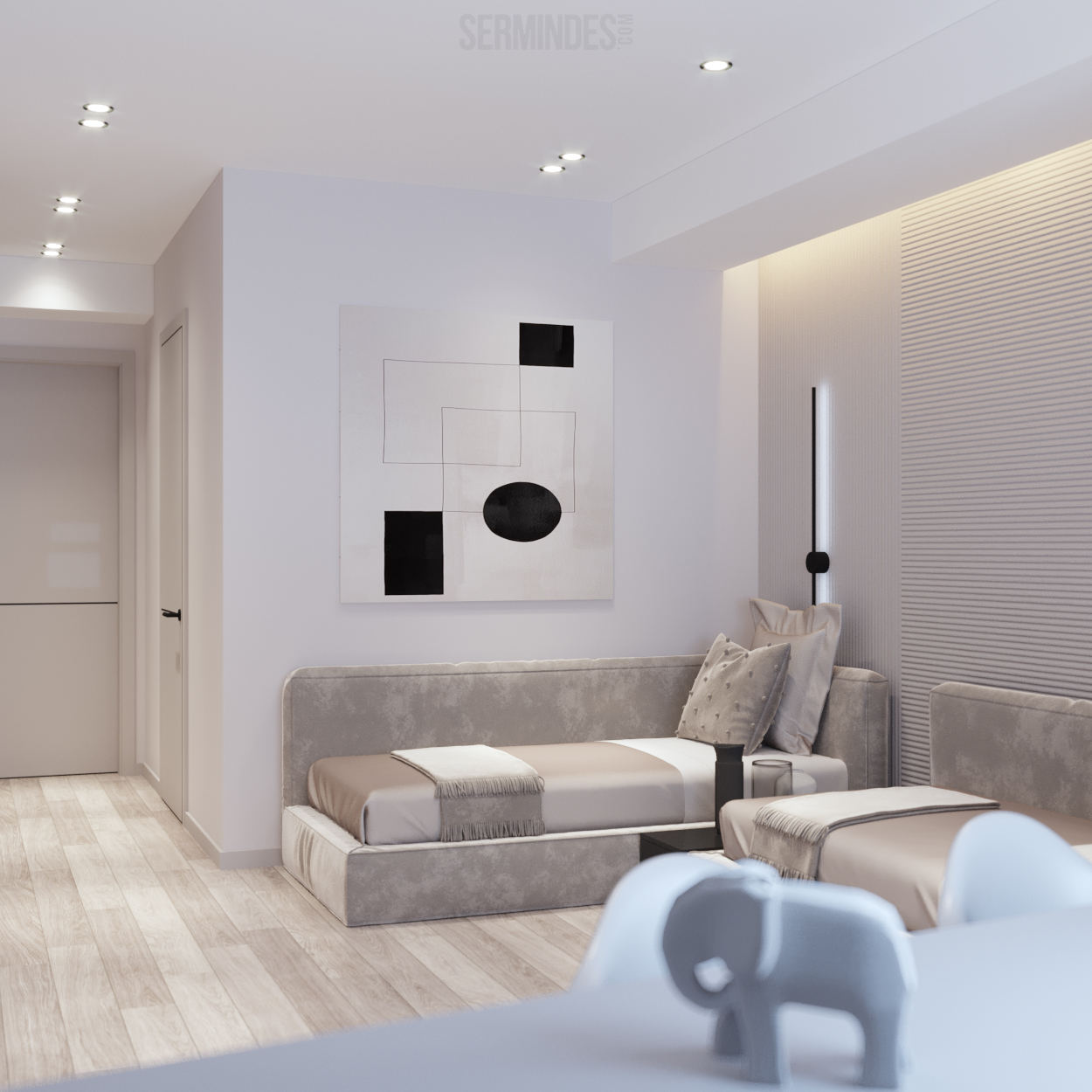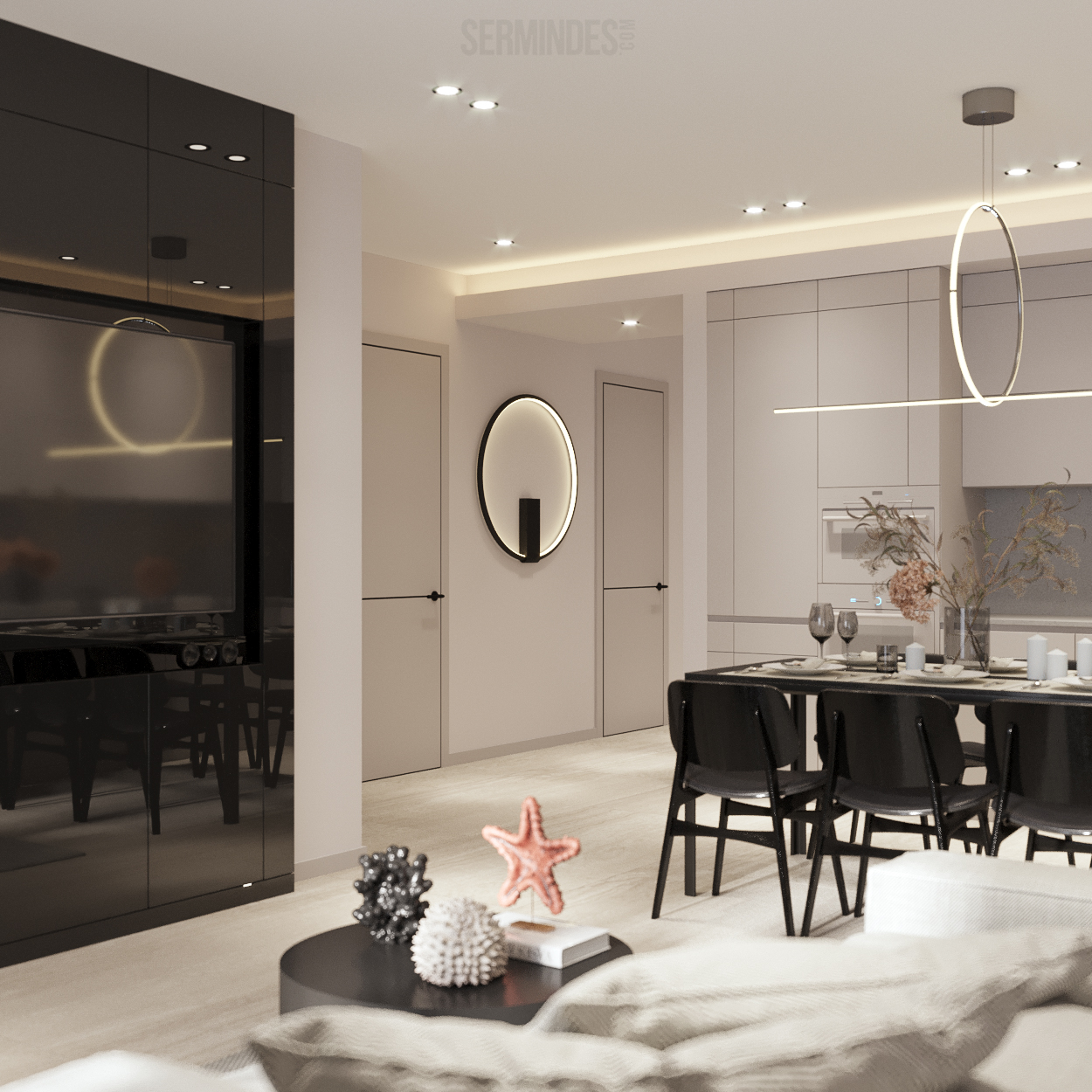 Interior design of an apartment, located in Chisinau, in the residential complex "OASIS". The apartment has an area of 100 square meters of floor space. The implementation of the project takes place in 2022. The contemporary-minimalist style was chosen. The color range in this project has the function of highlighting the travertine on the floor and supporting the open interior ambiance, but also a small contour-contrast is found in small areas with the function of accentuating and contouring.