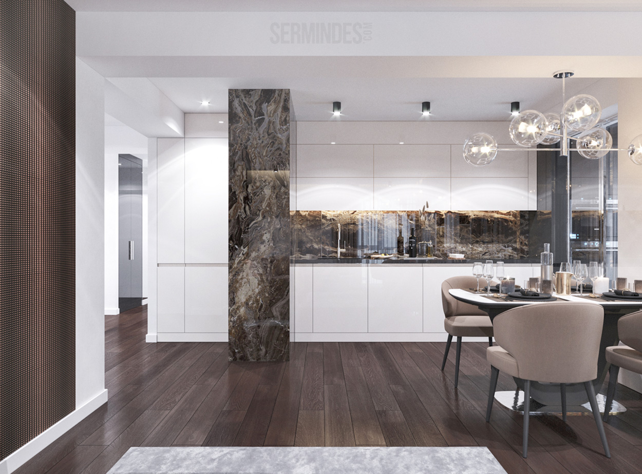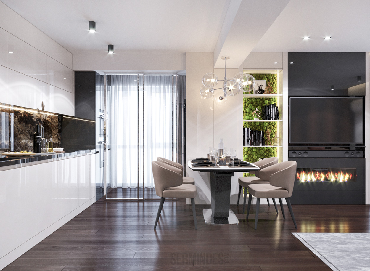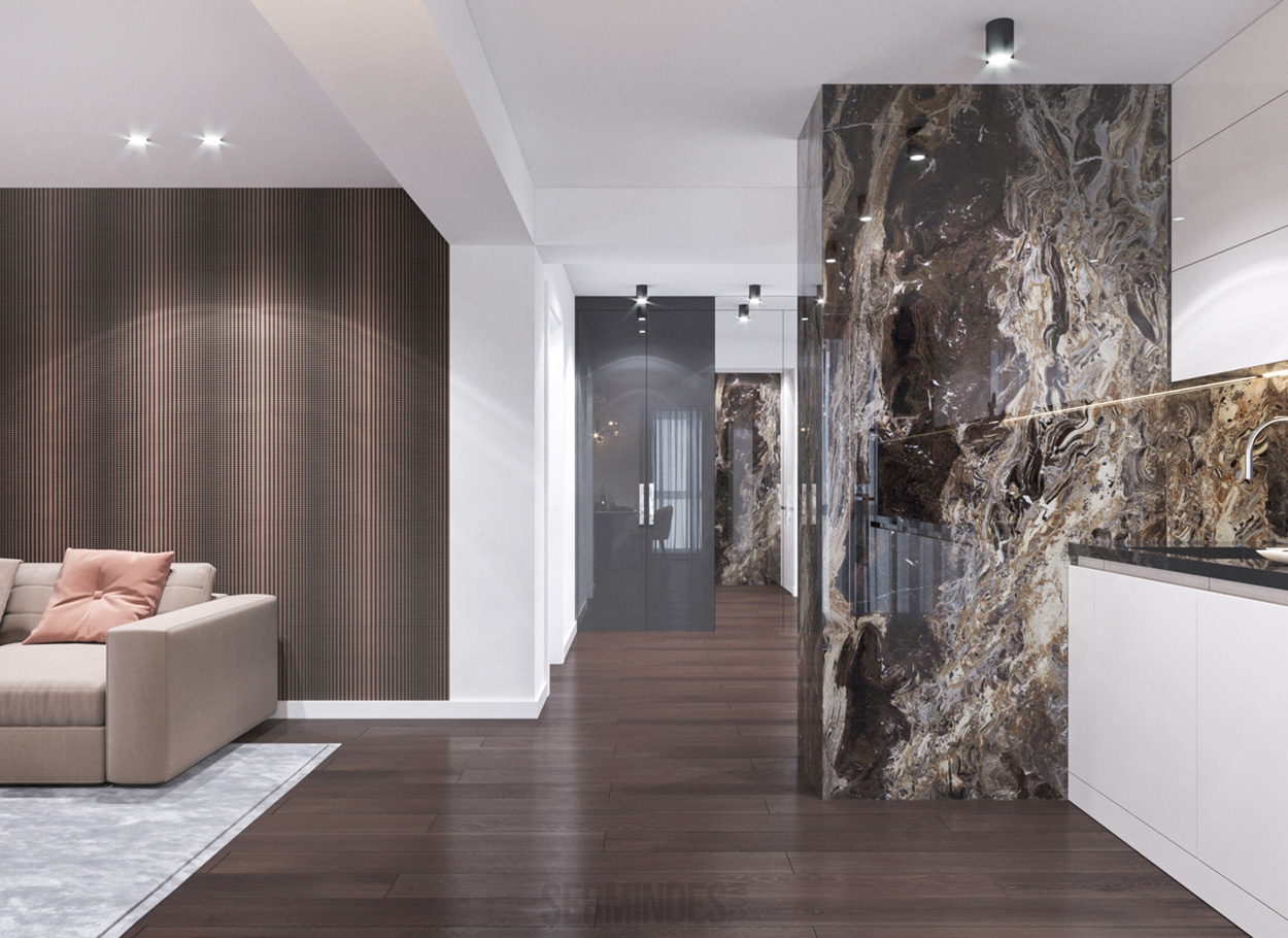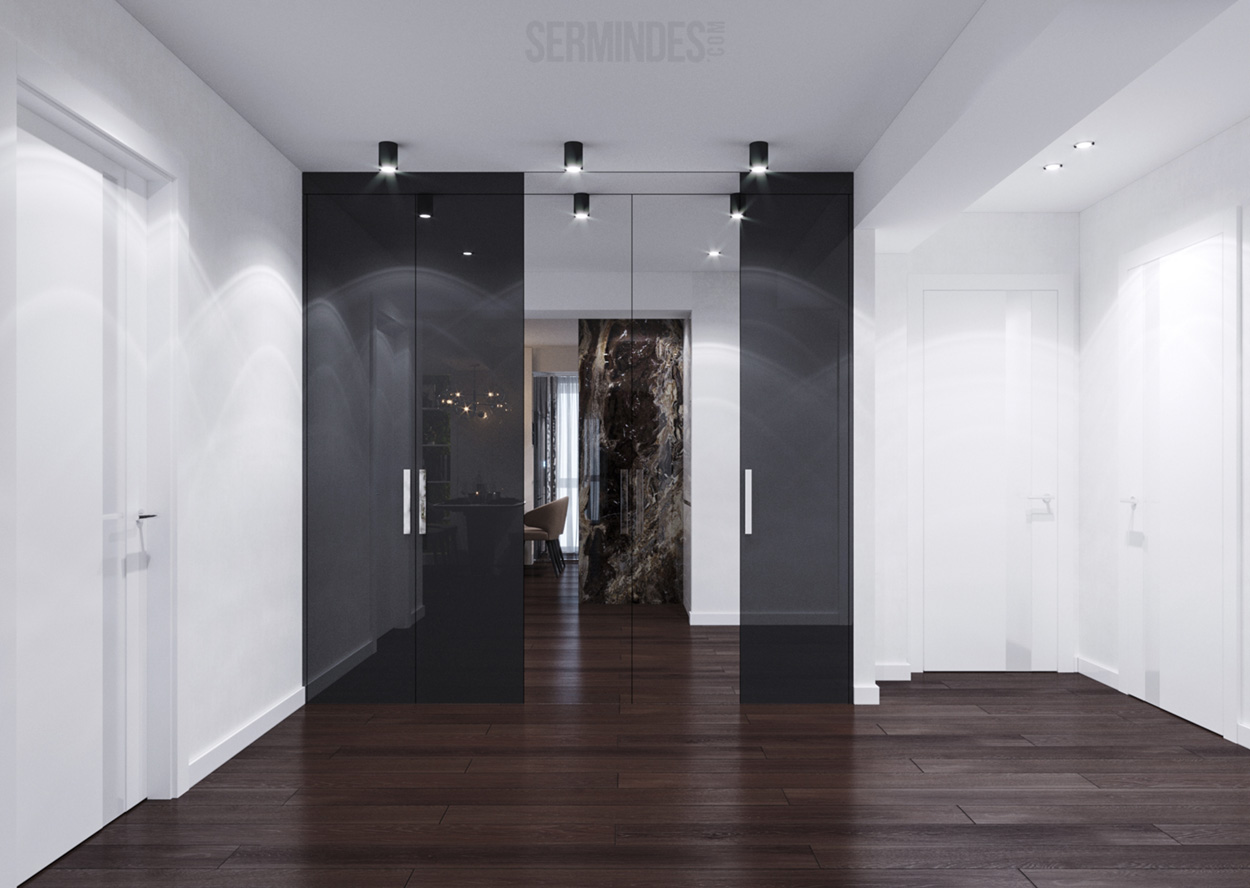 Apartment located in Chisinau, with an area of 89 m.p. Designed in a contemporary style, with a contrasting color effect. The project was developed in 2020.