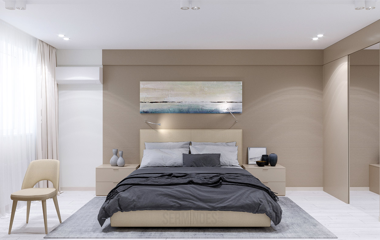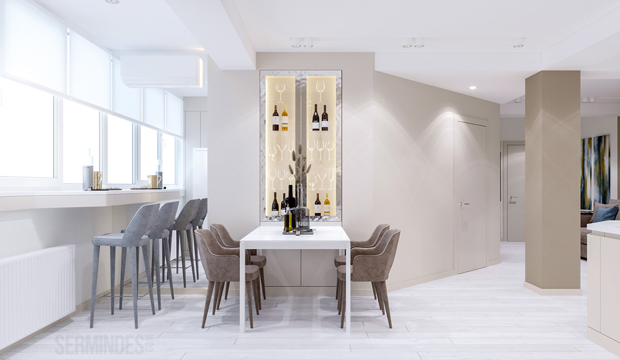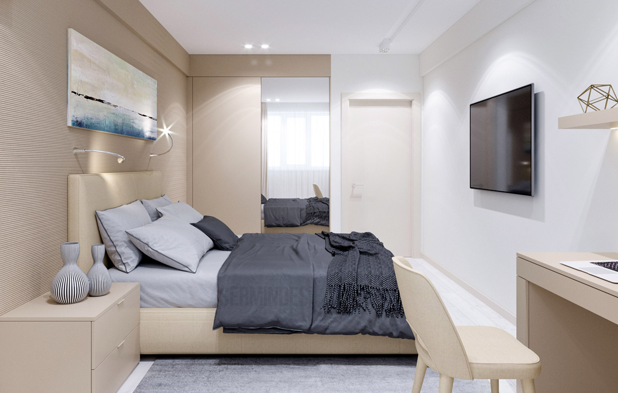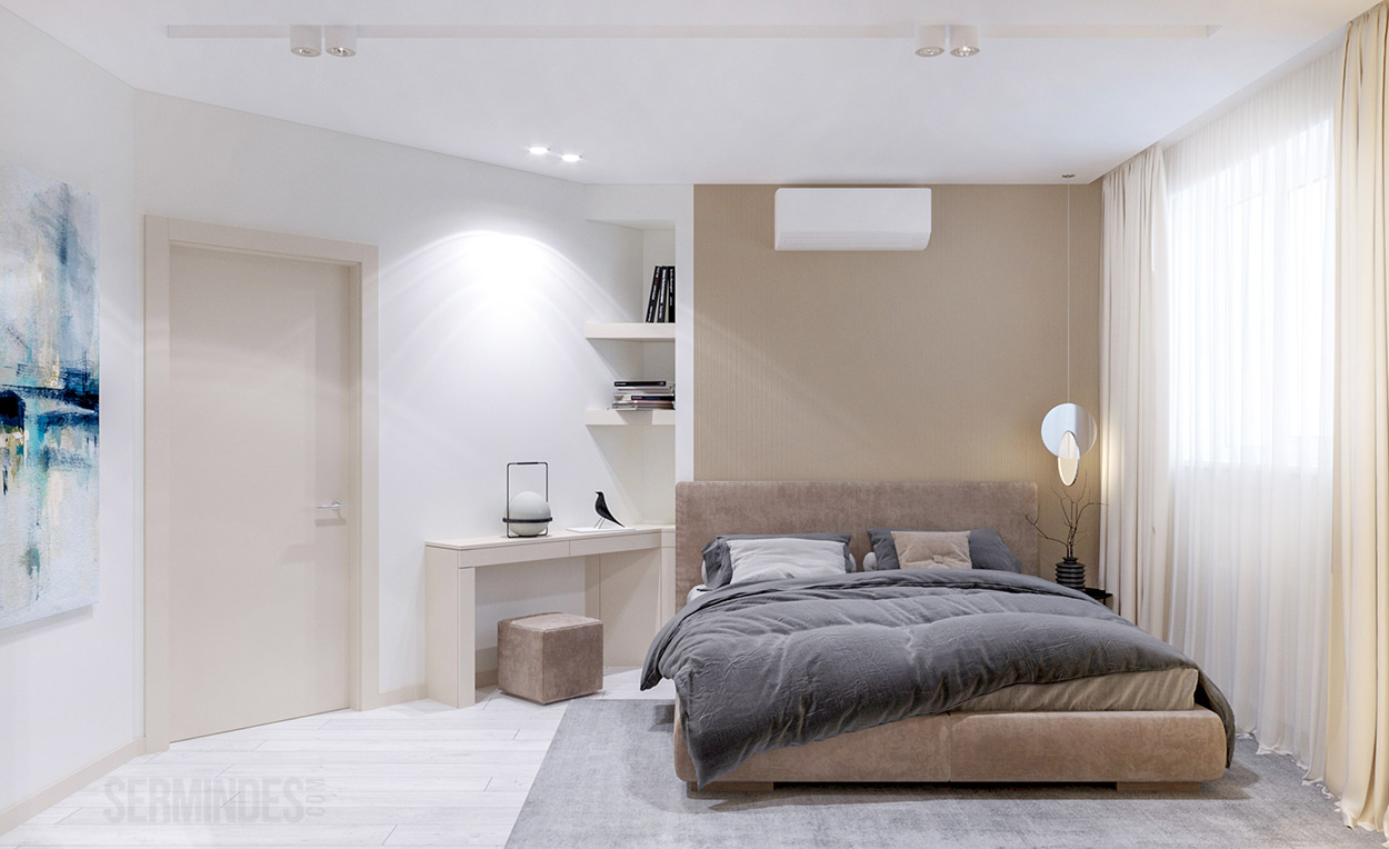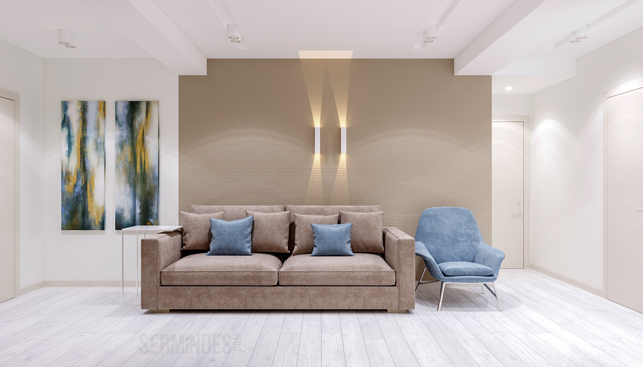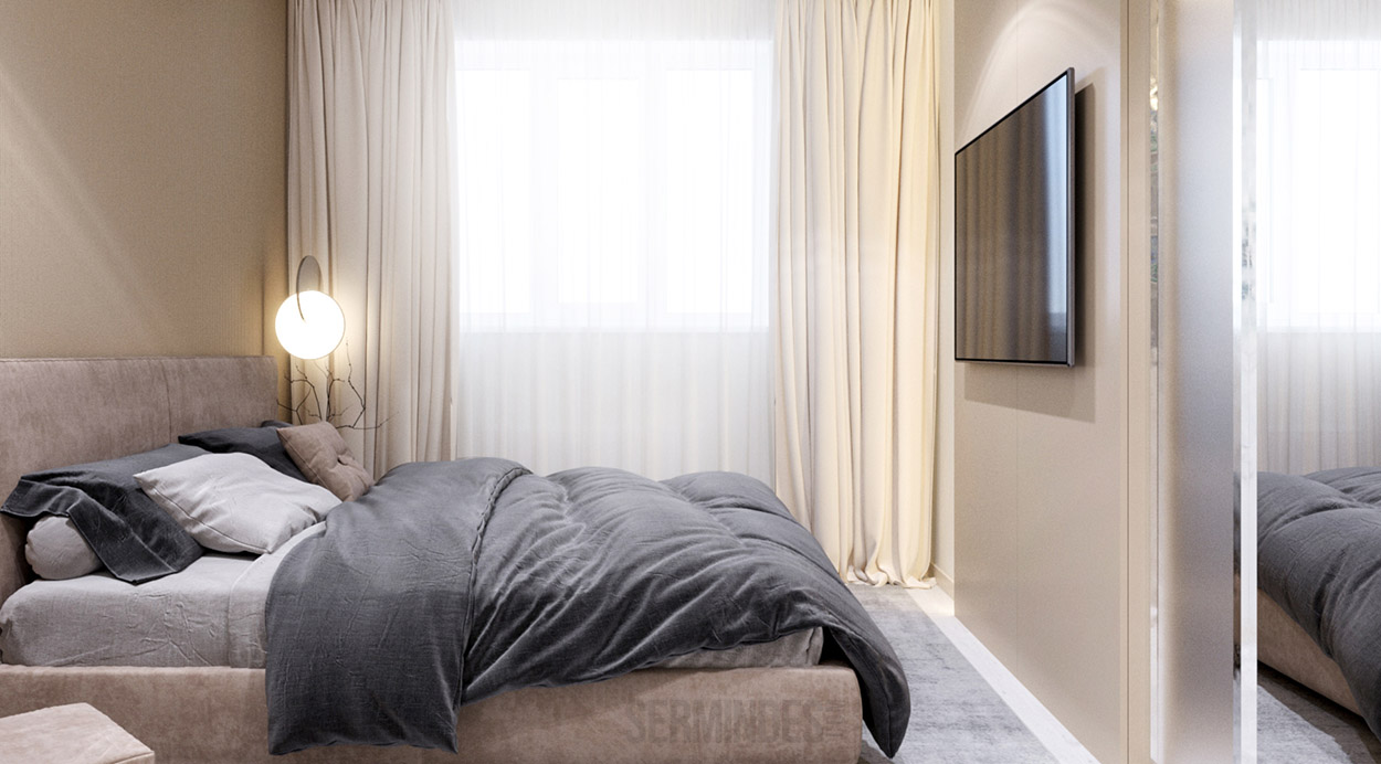 Interior design of a two-bedroom apartment. The layout is designed in a contemporary style. The total area is 82 square meters.