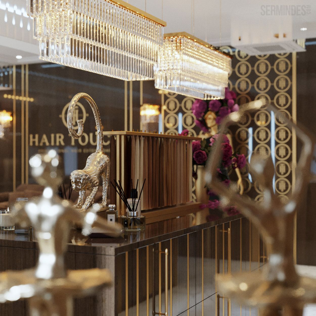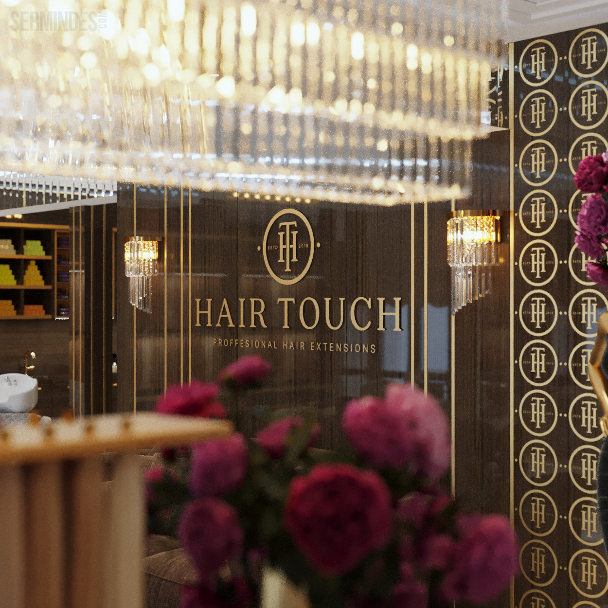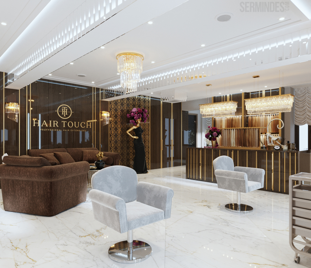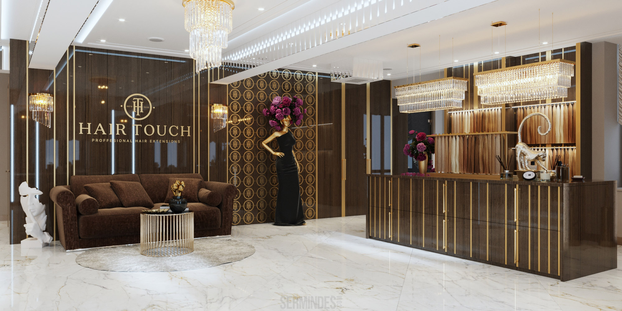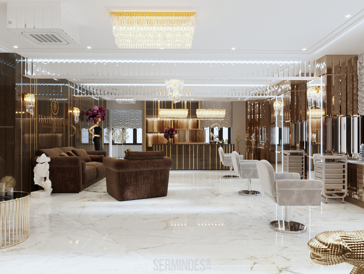 Interior design in Bucharest, of a beauty salon, with an area of 128 m.p. A contemporary style was chosen for the design of this salon, borrowing art-deco influences. HAIR TOUCH salon offers beauty services, hairdresser, sale of band extensions.