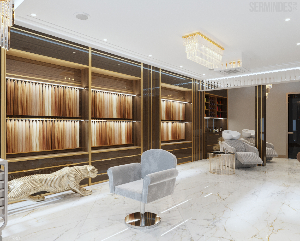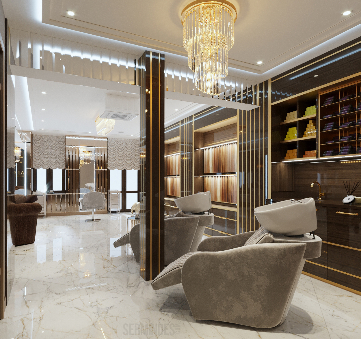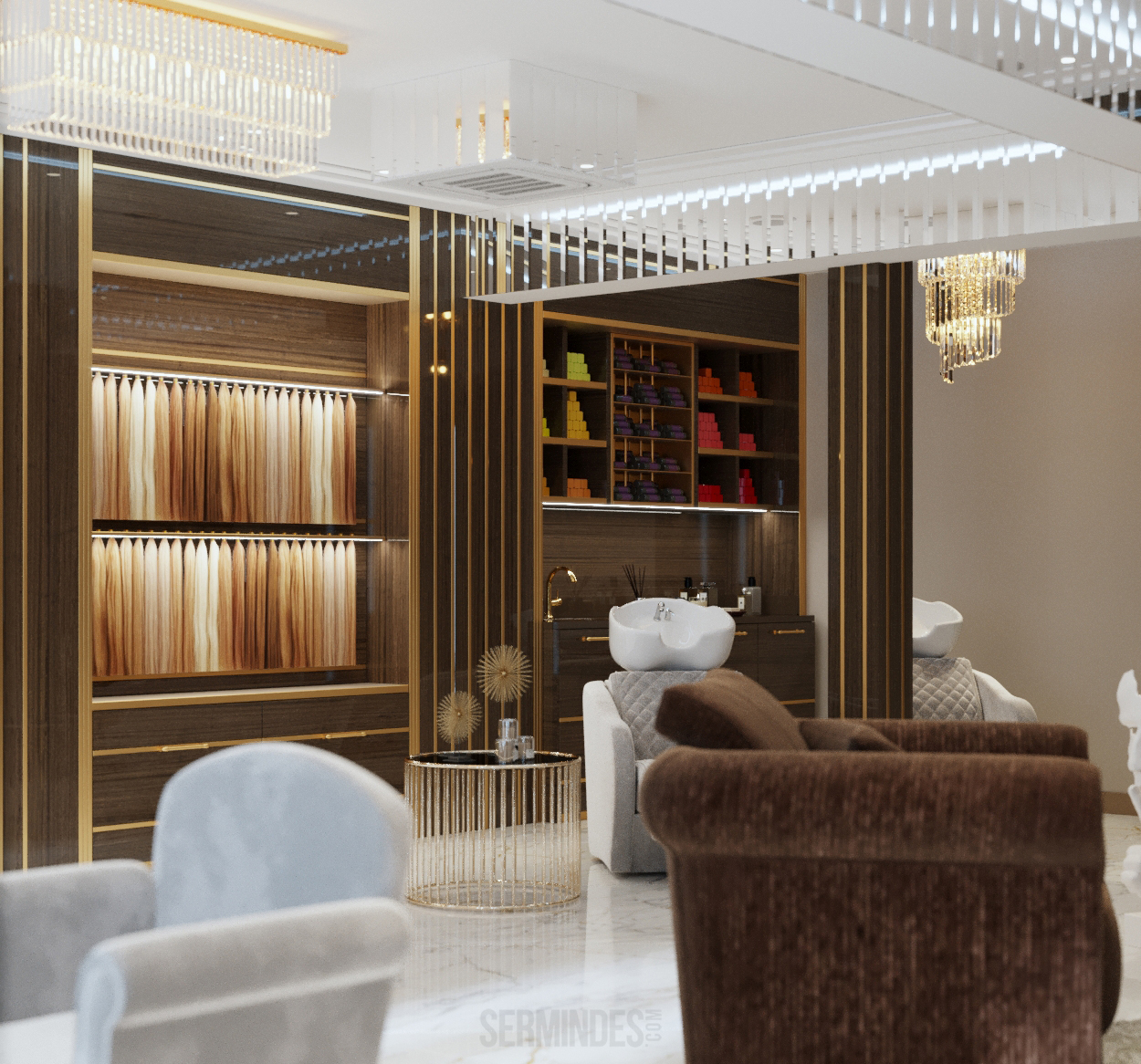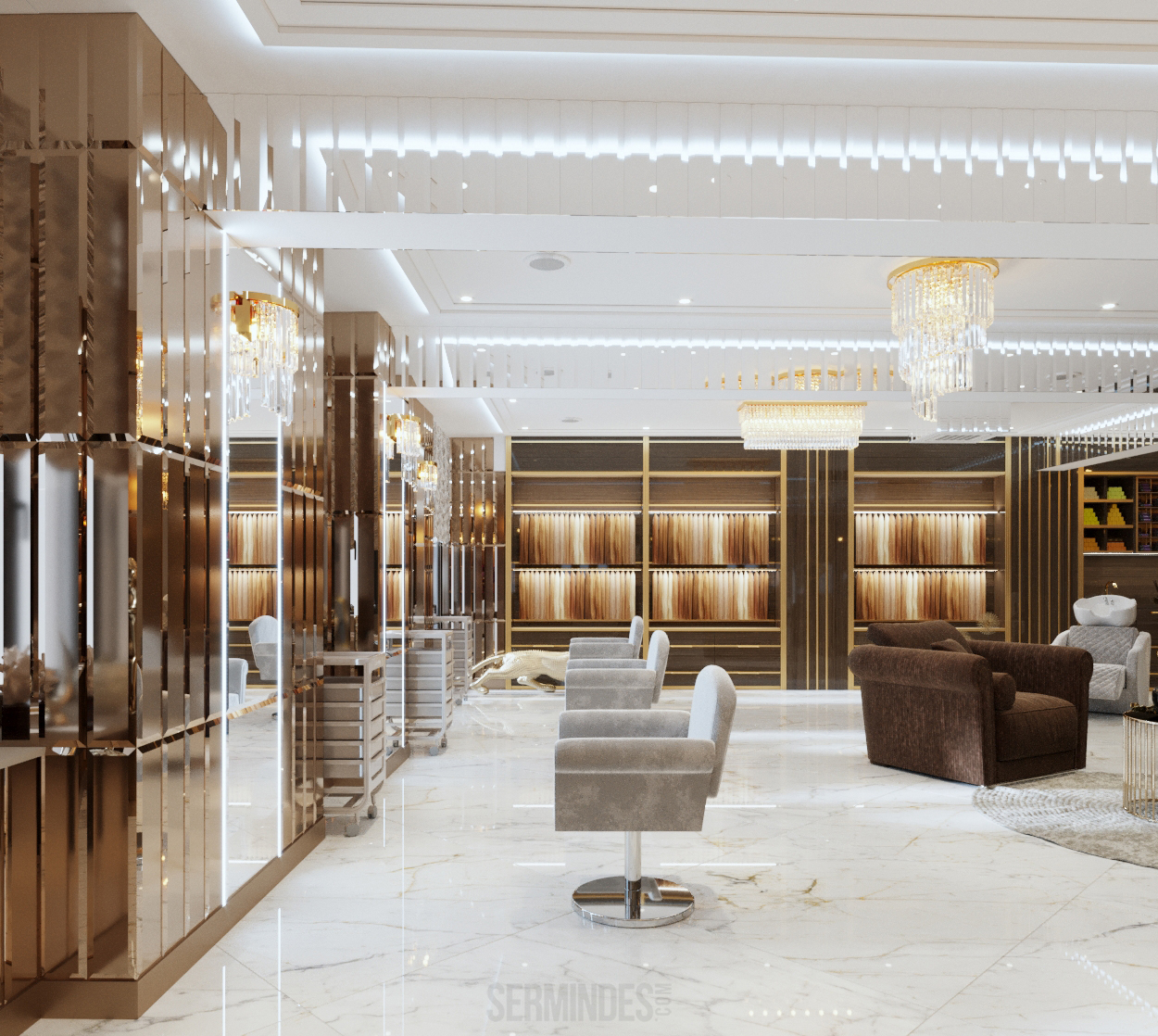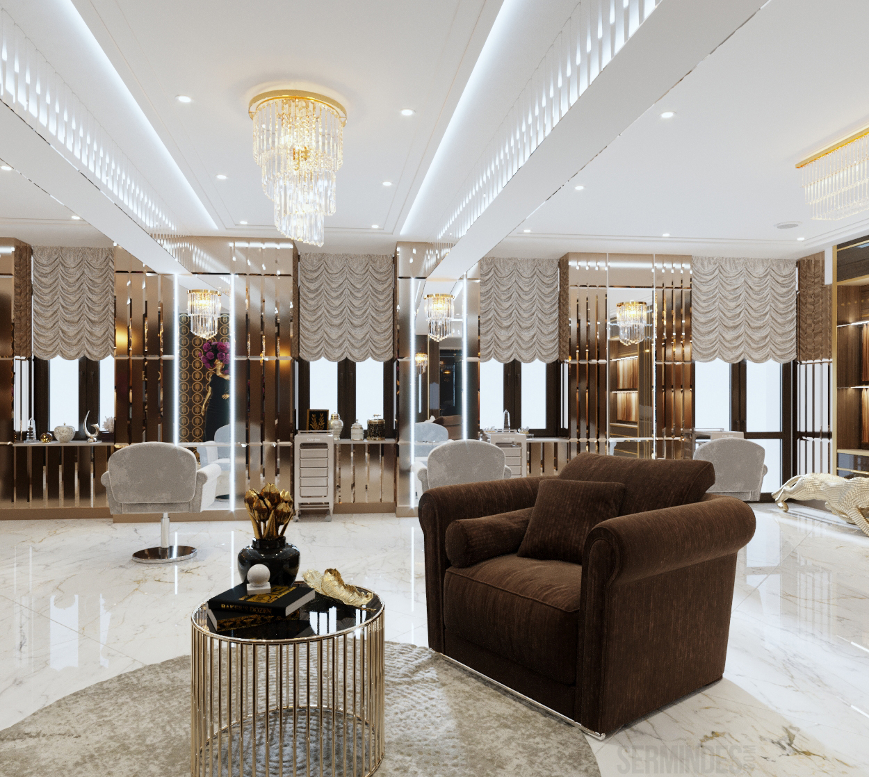 Interior design in Bucharest, of a beauty salon, with an area of 128 m.p. A contemporary style was chosen for the design of this salon, borrowing art-deco influences. HAIR TOUCH salon offers beauty services, hairdresser, sale of band extensions.