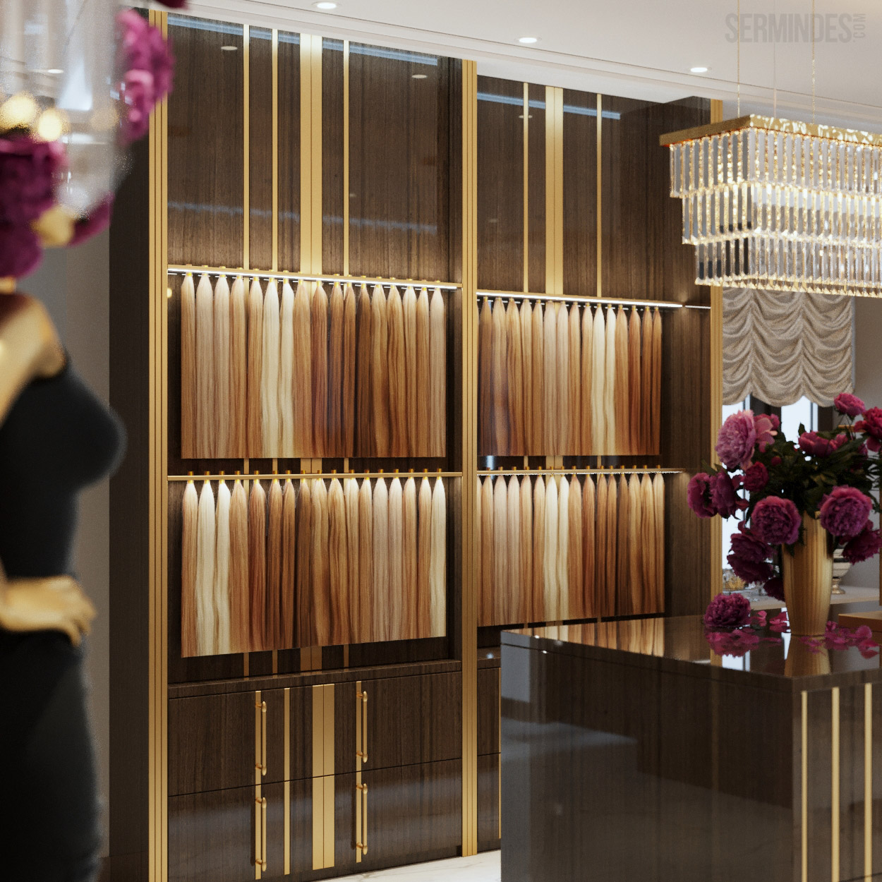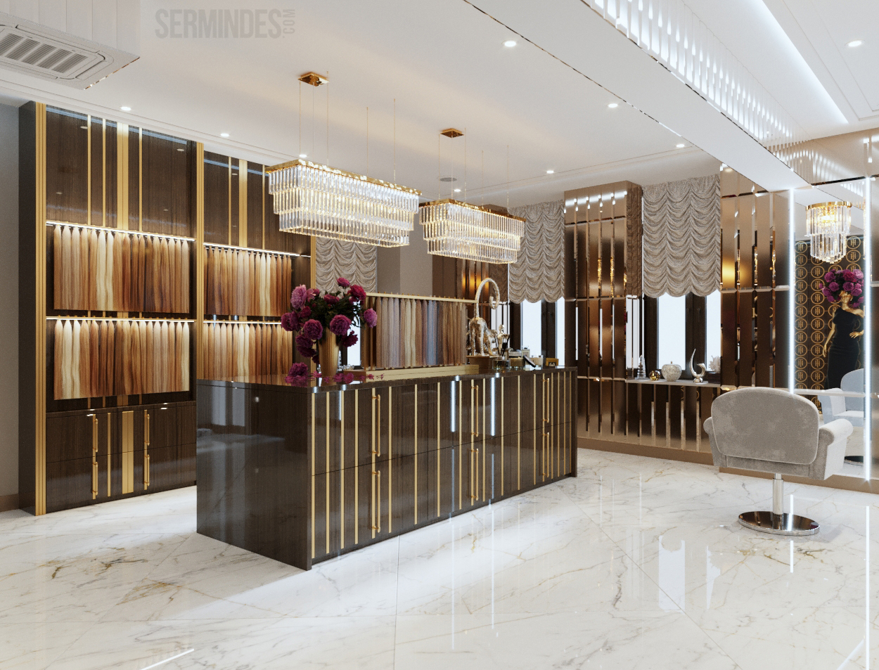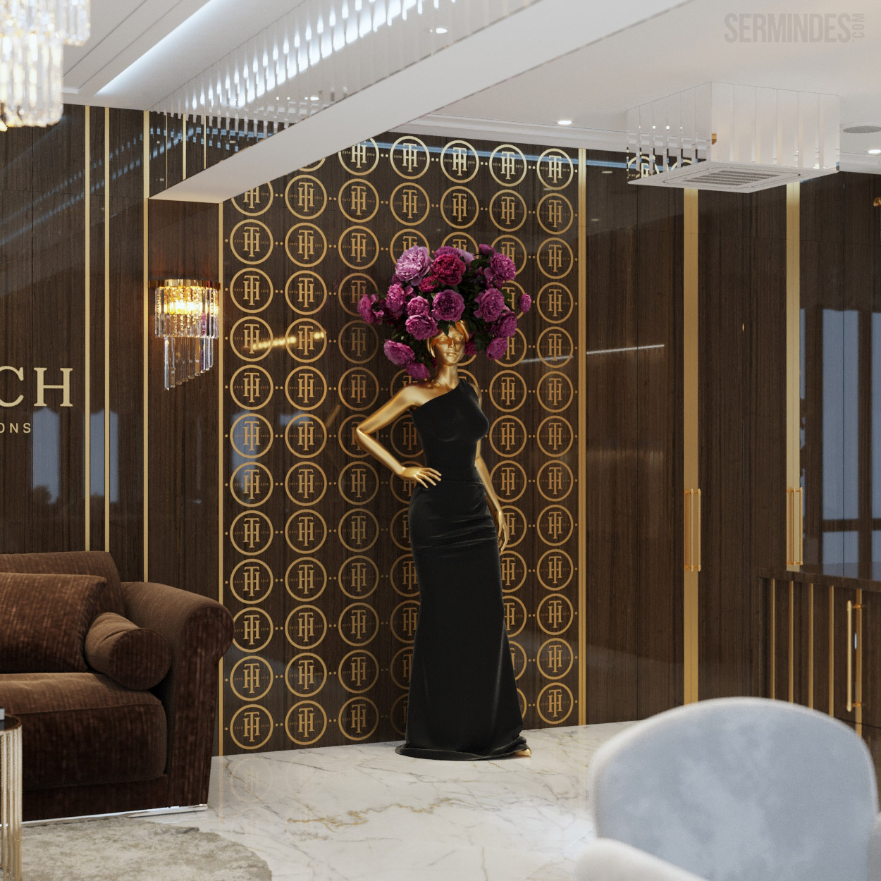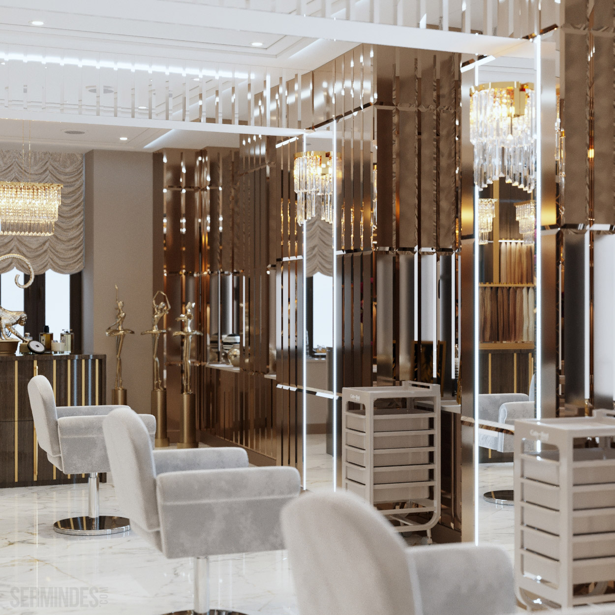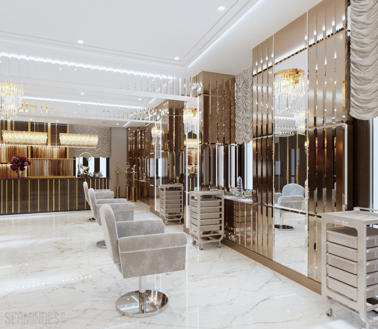 Interior design in Bucharest, of a beauty salon, with an area of 128 m.p. A contemporary style was chosen for the design of this salon, borrowing art-deco influences. HAIR TOUCH salon offers beauty services, hairdresser, sale of band extensions.