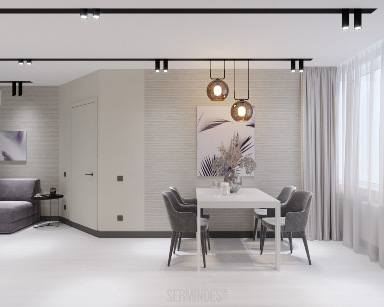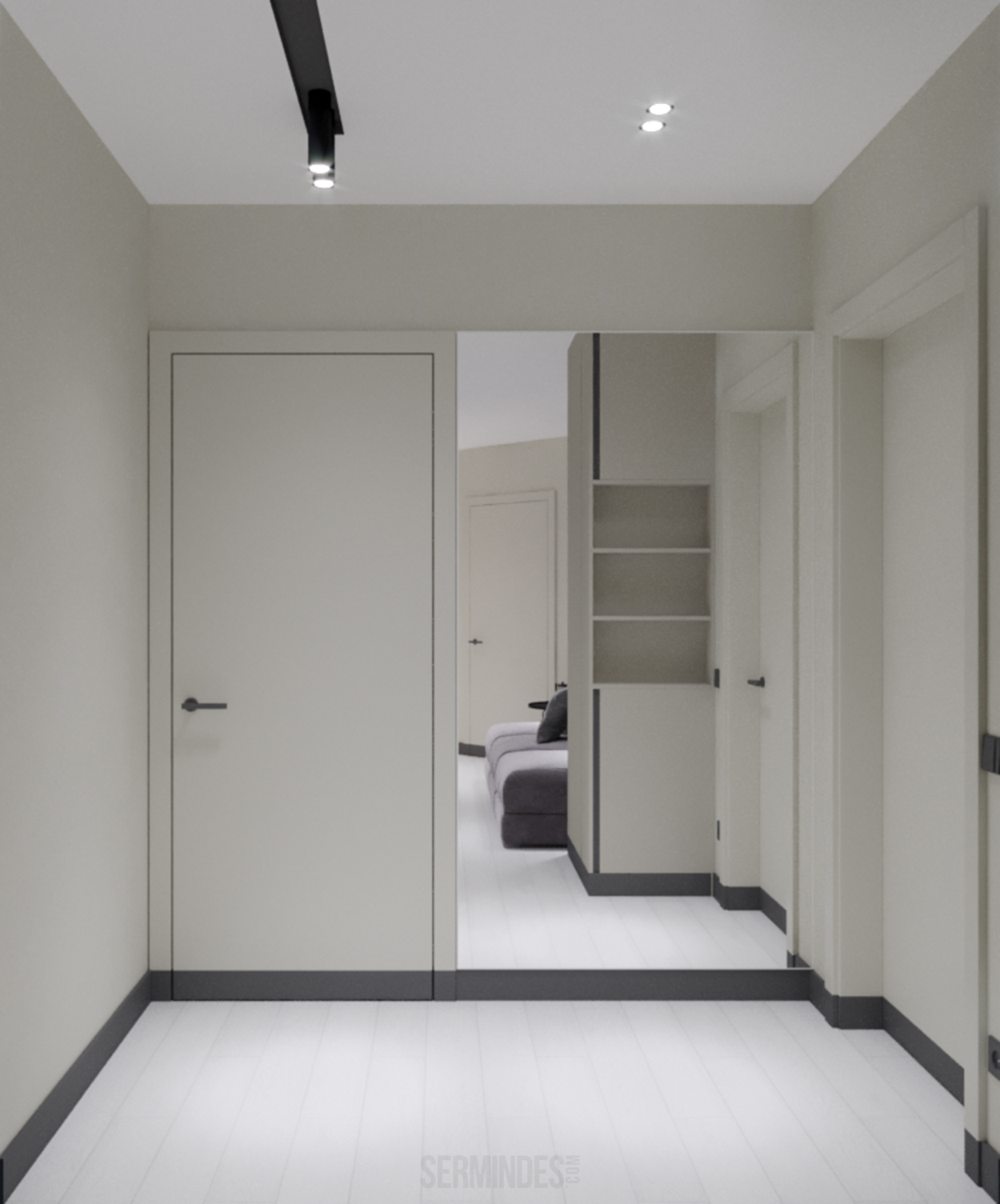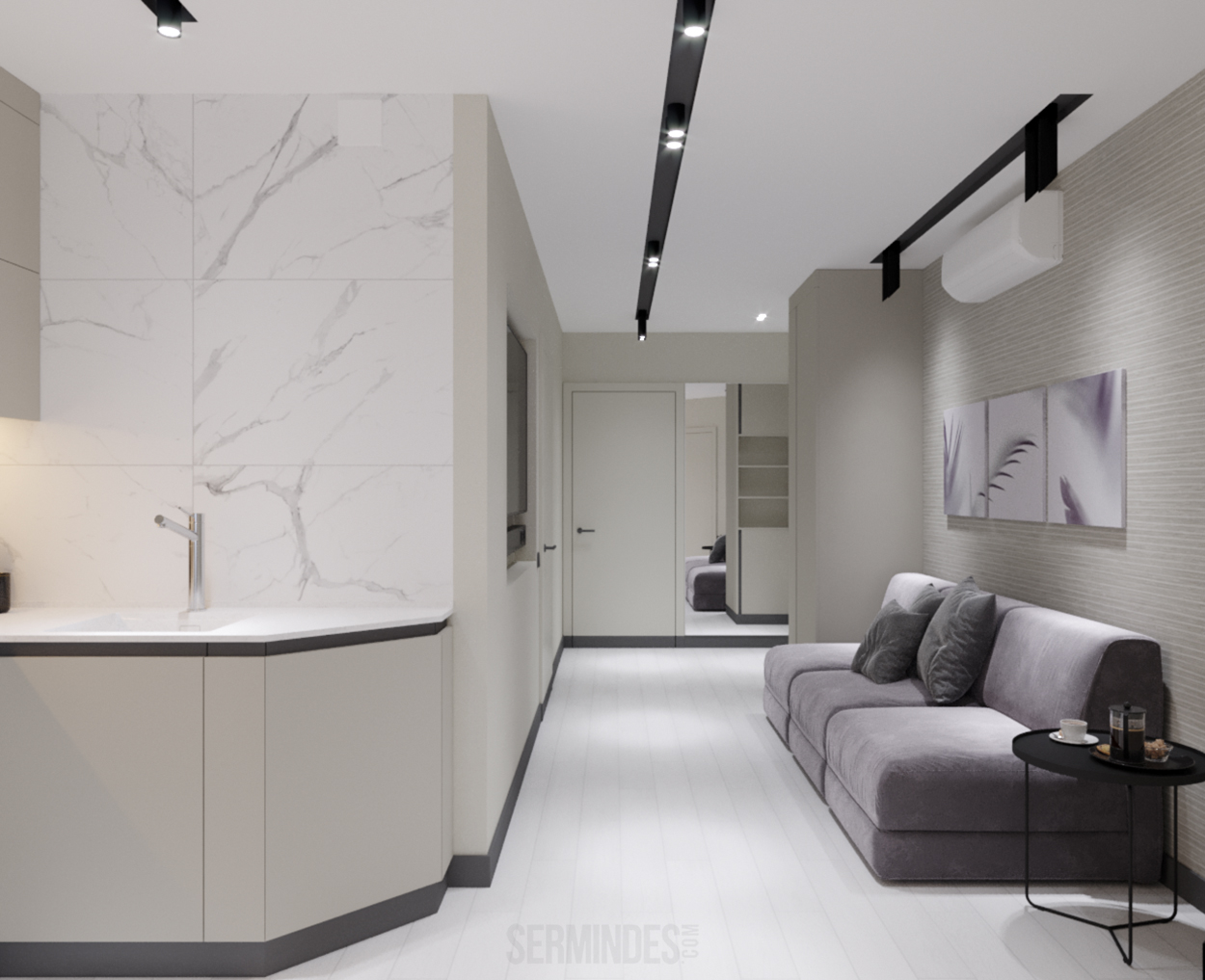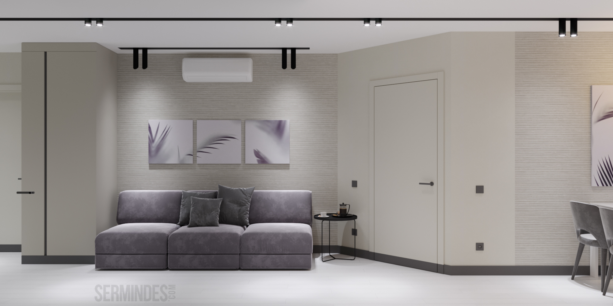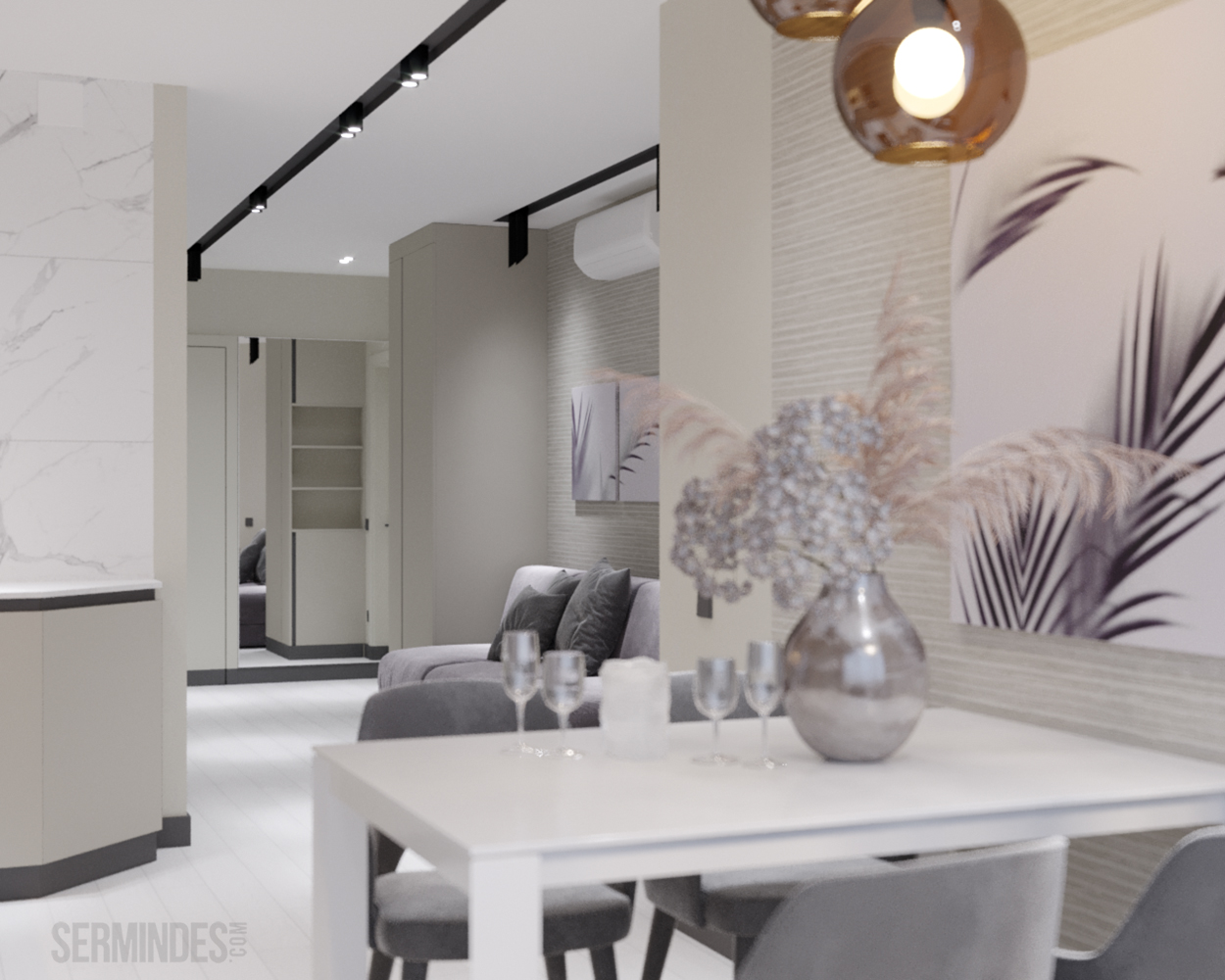 Interior design of an apartment with an area of 59 m.p. This apartment is designed in a contemporary style, with finishing materials with a natural-exotic look. The apartment is located in Chisinau.