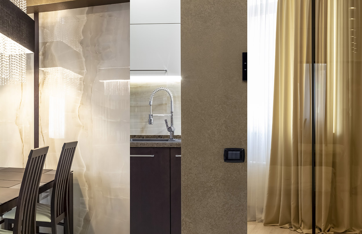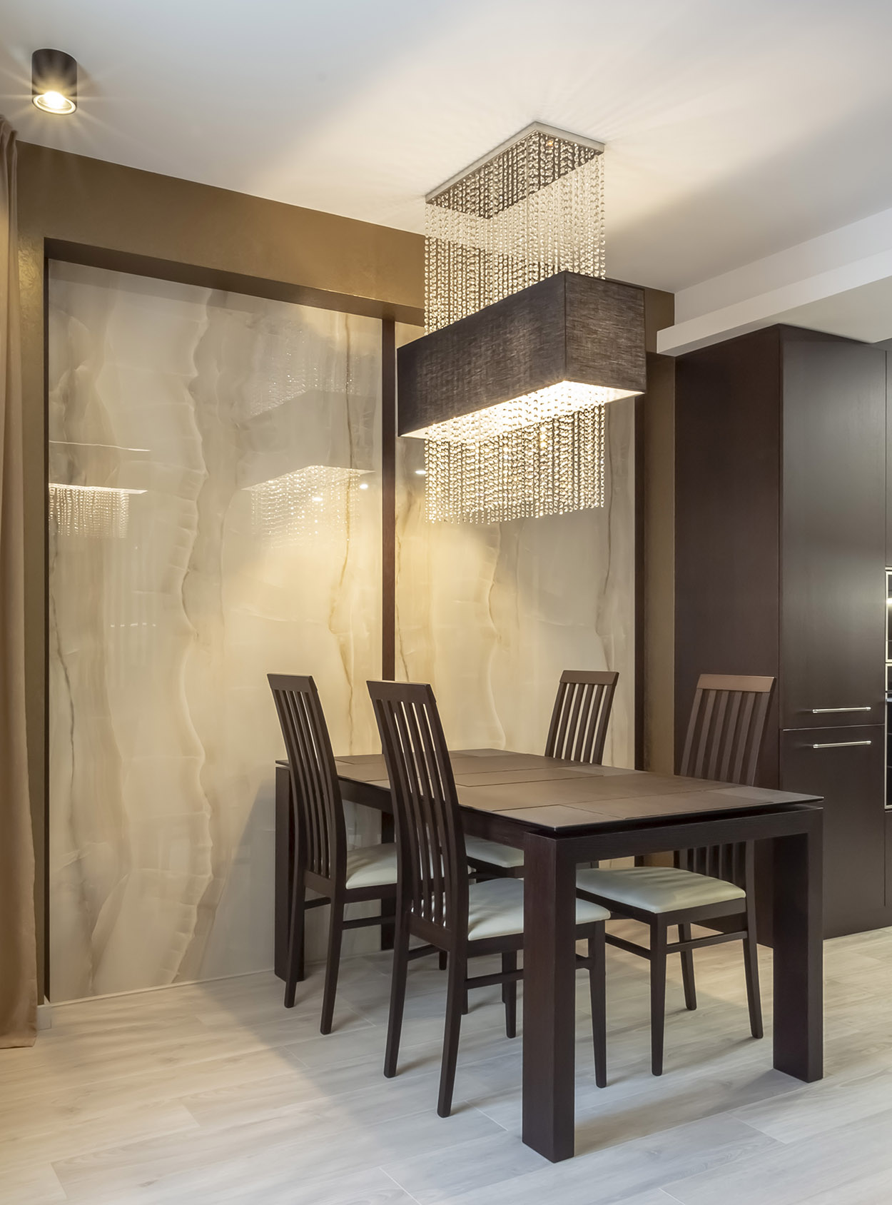 The dining room is visually separated from the living room by a decision with the help of light and also underlined by large-format decorative sandstone, which imitates the natural onyx stone. Tile in digital format - apparently wins due to the absence of seams and joints.