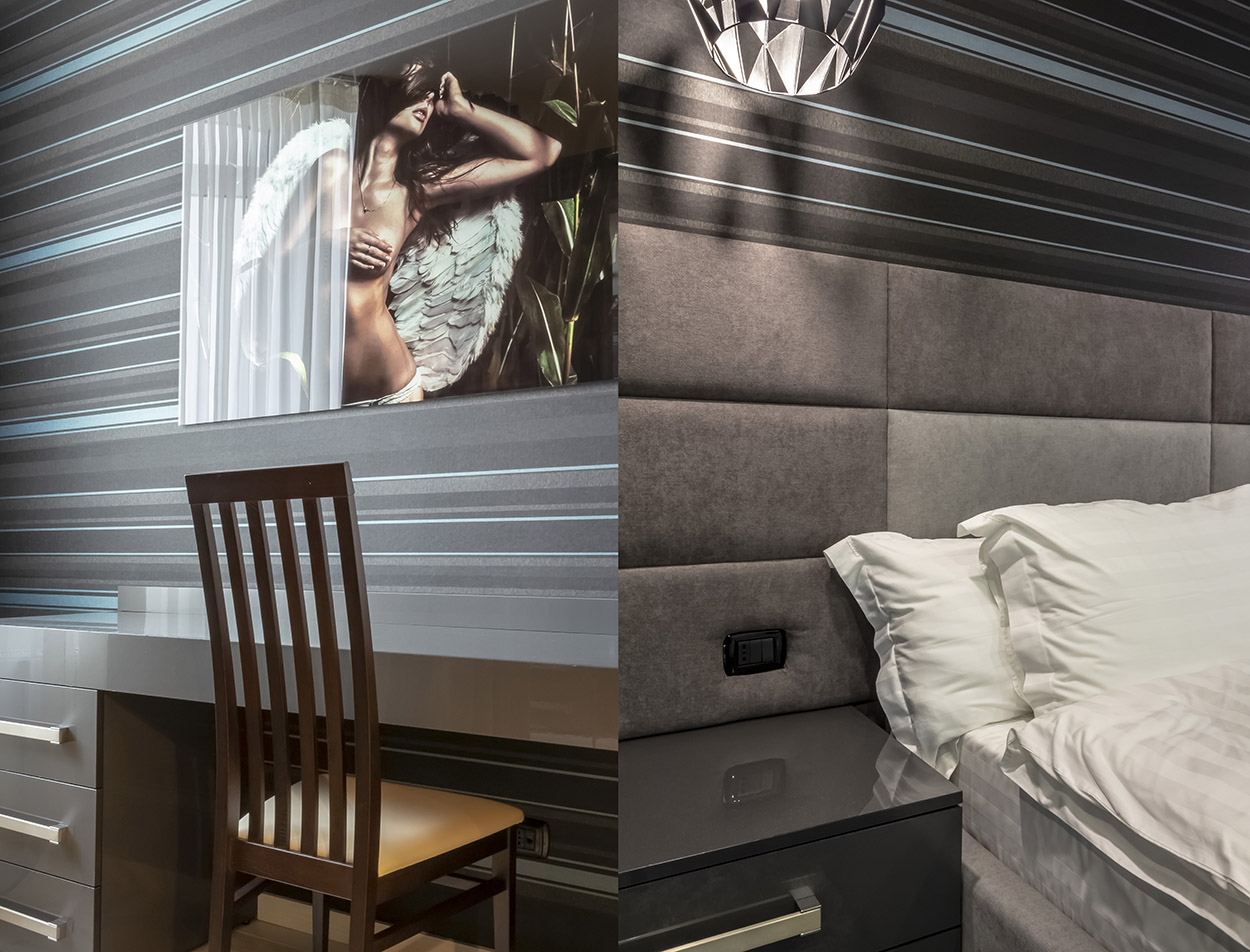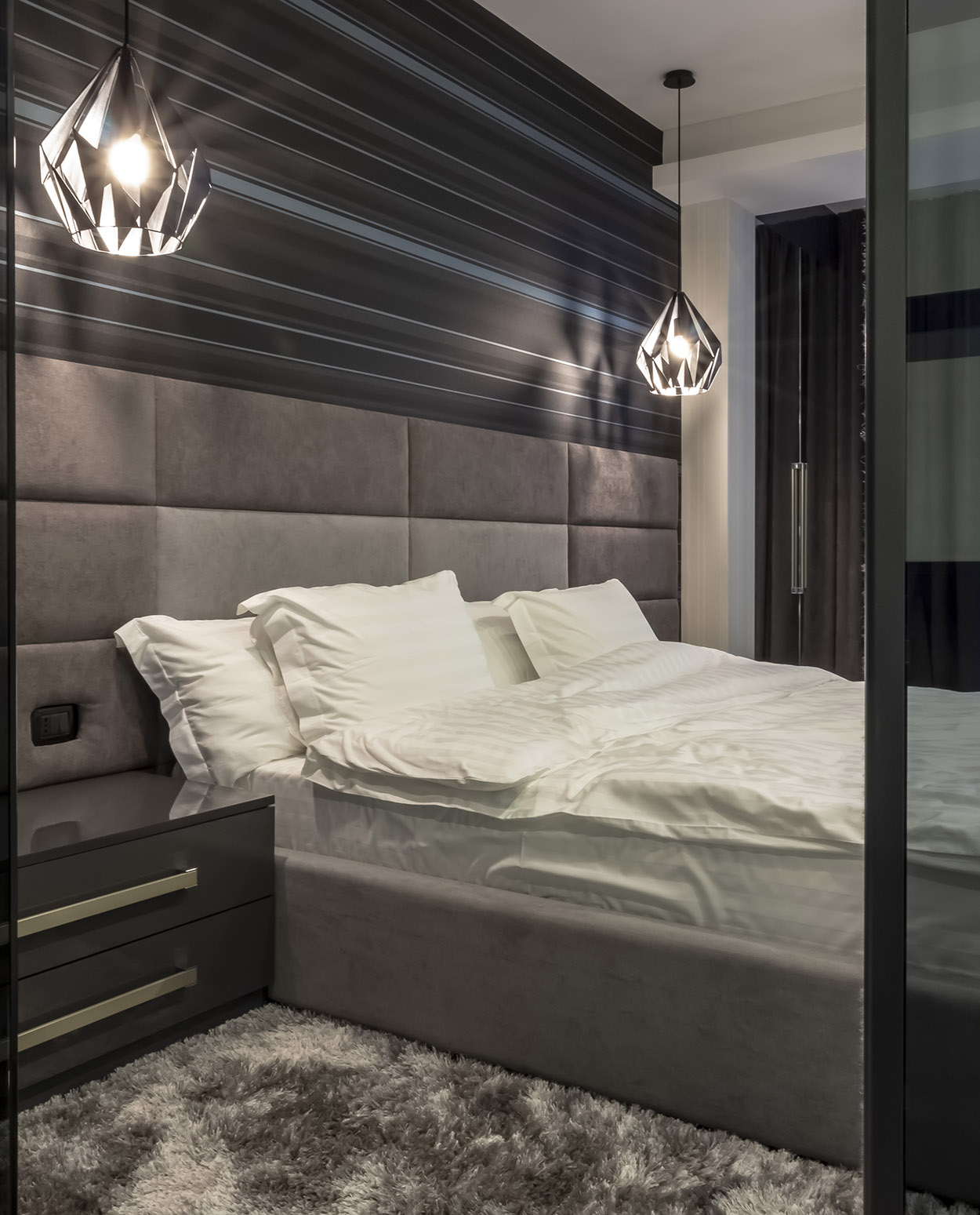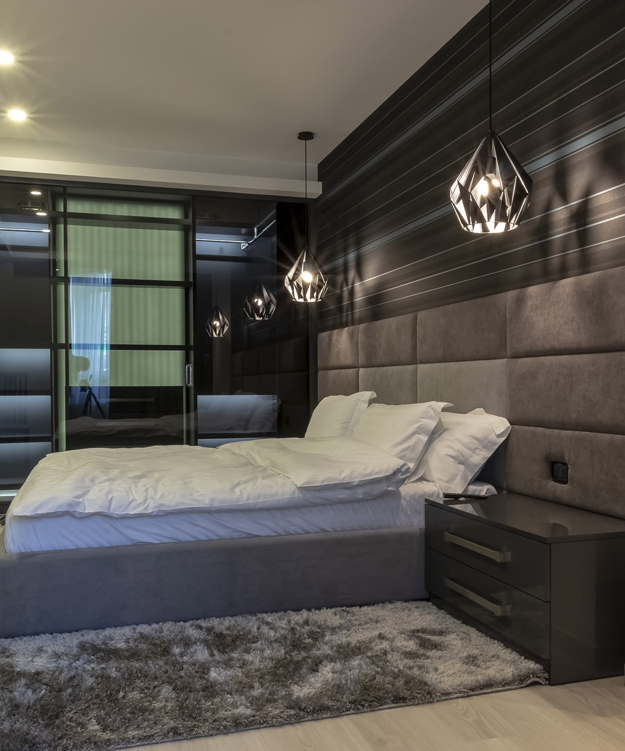 The dark color in which the bedroom is made is associated with silence and stillness. The dark color draws to sleep, at the same time accentuating the richness and elegance.