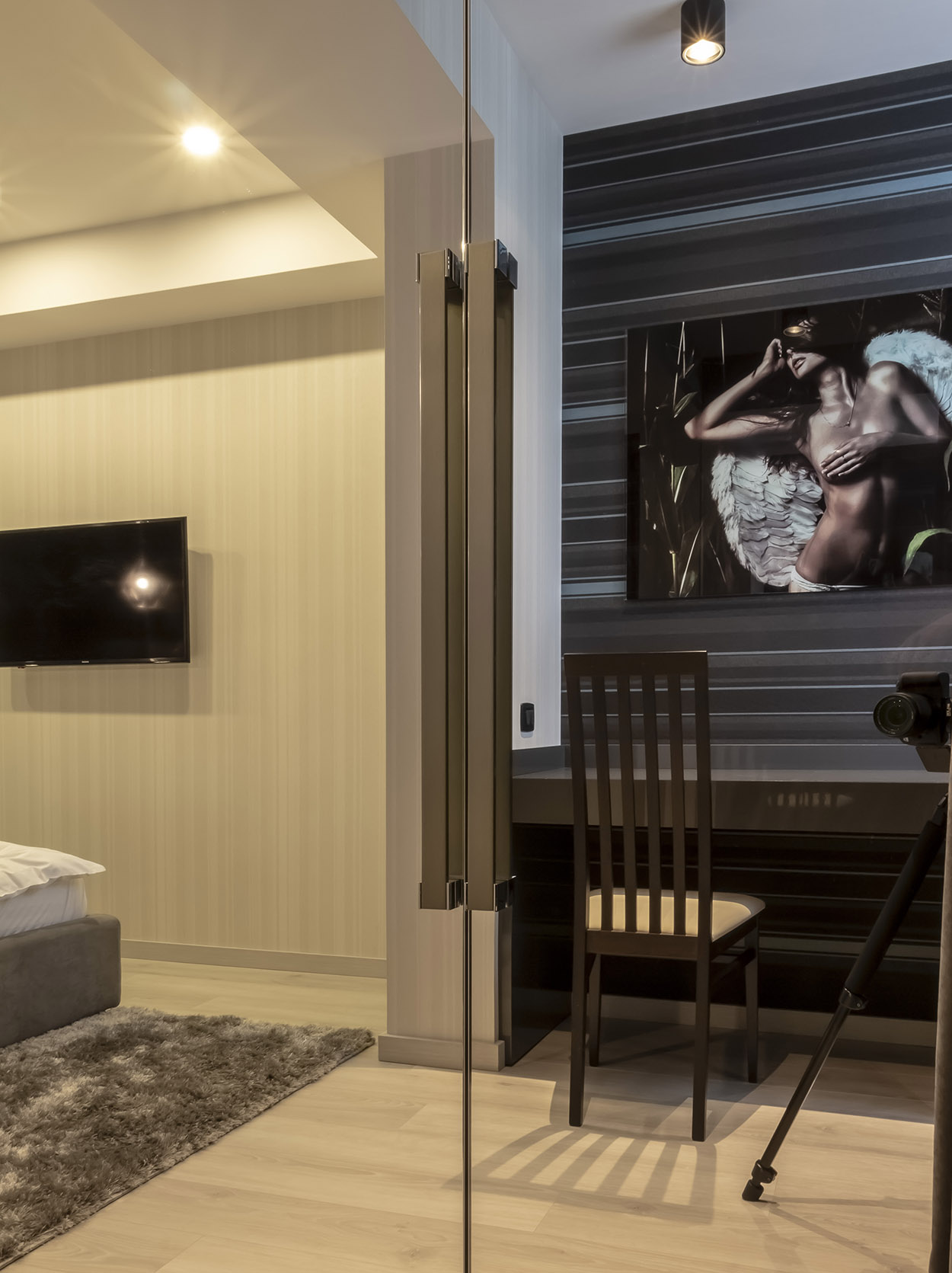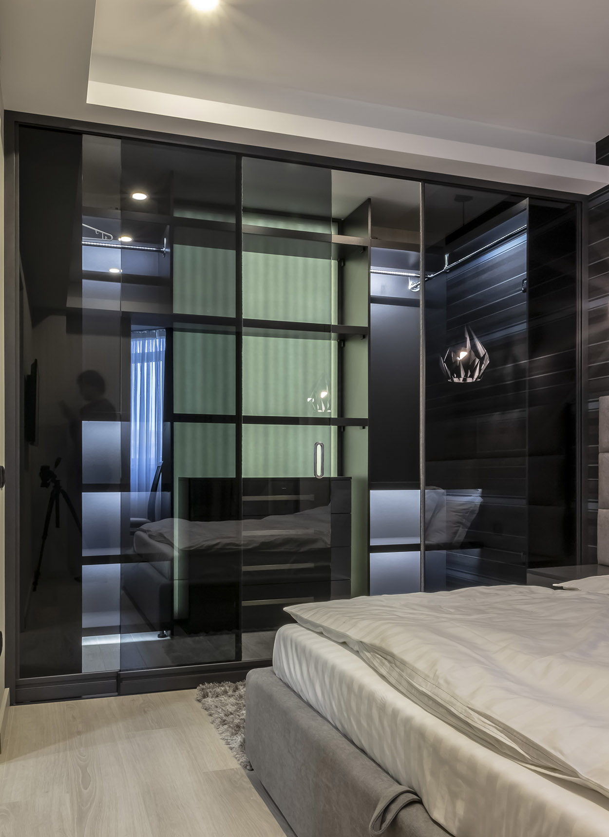 In the same place a wardrobe (walk in) made of glass. Glass coating today - a common solution that gives the interior salon a modern look.