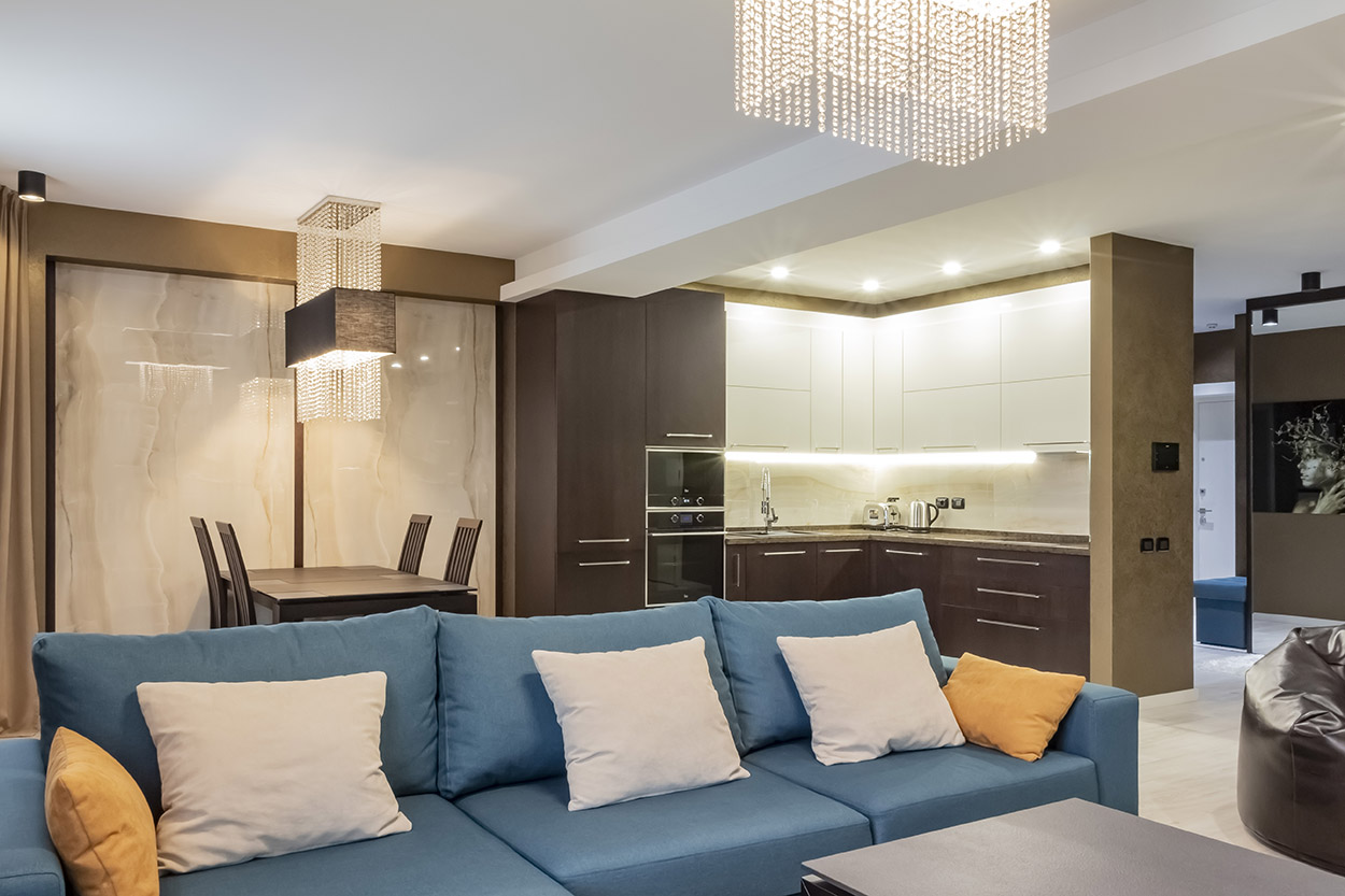 The structure of the apartment is designed so that the entrance hall, kitchen, dining room and hall are united in a single space.