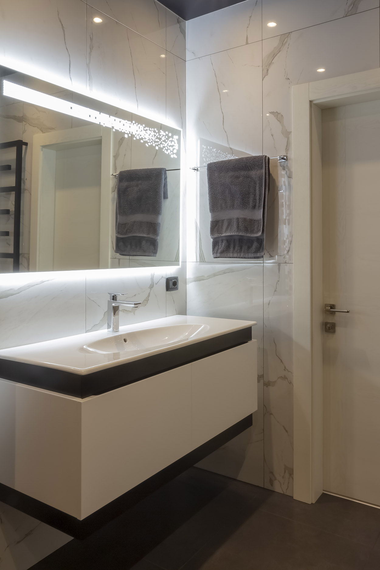 In the bathroom, I kept the contemporary style. We combined calm and dark colors, rich in contrast.