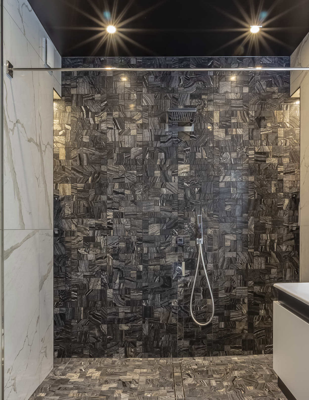 The wall (wall) of the shower cubicle is lined with a natural stone mosaic.
