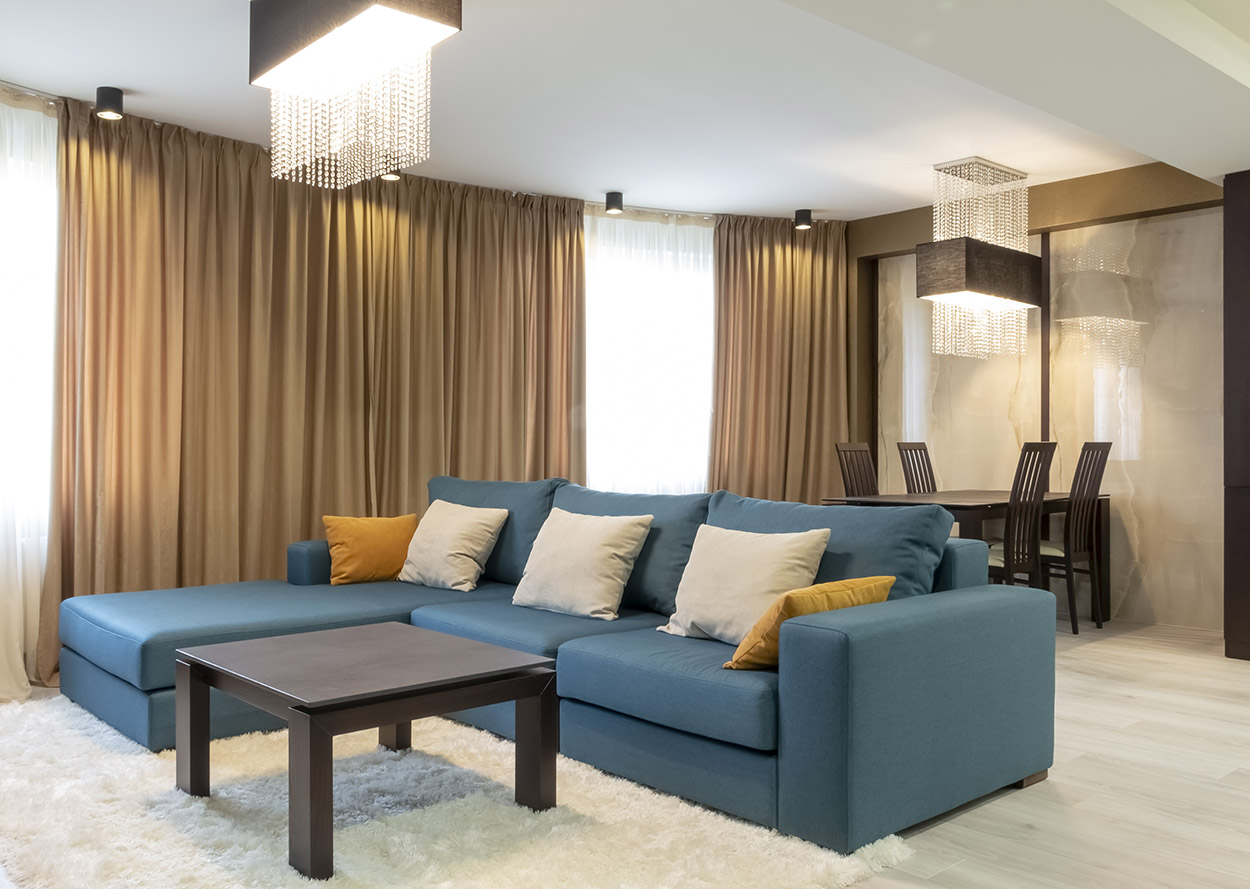 The gold walls, in the united area, fall lightly inside, adding luxury and also harmonize perfectly with the thick curtains in the lounge-hall area.