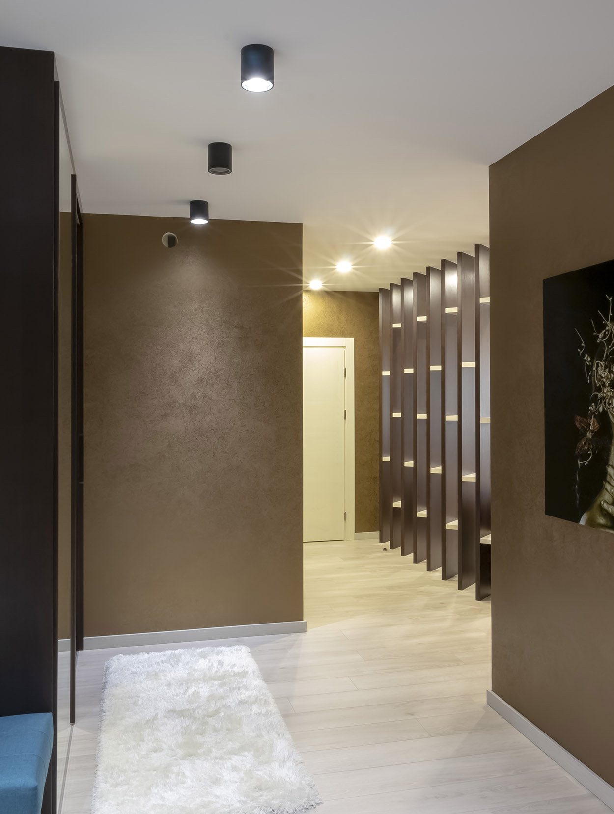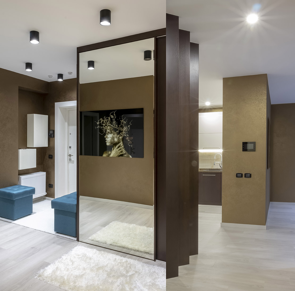 The vertical lines used divide the psychological space, visually separating the corridor and the hall bathroom.