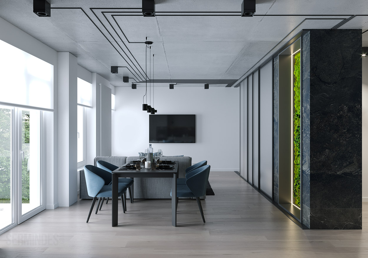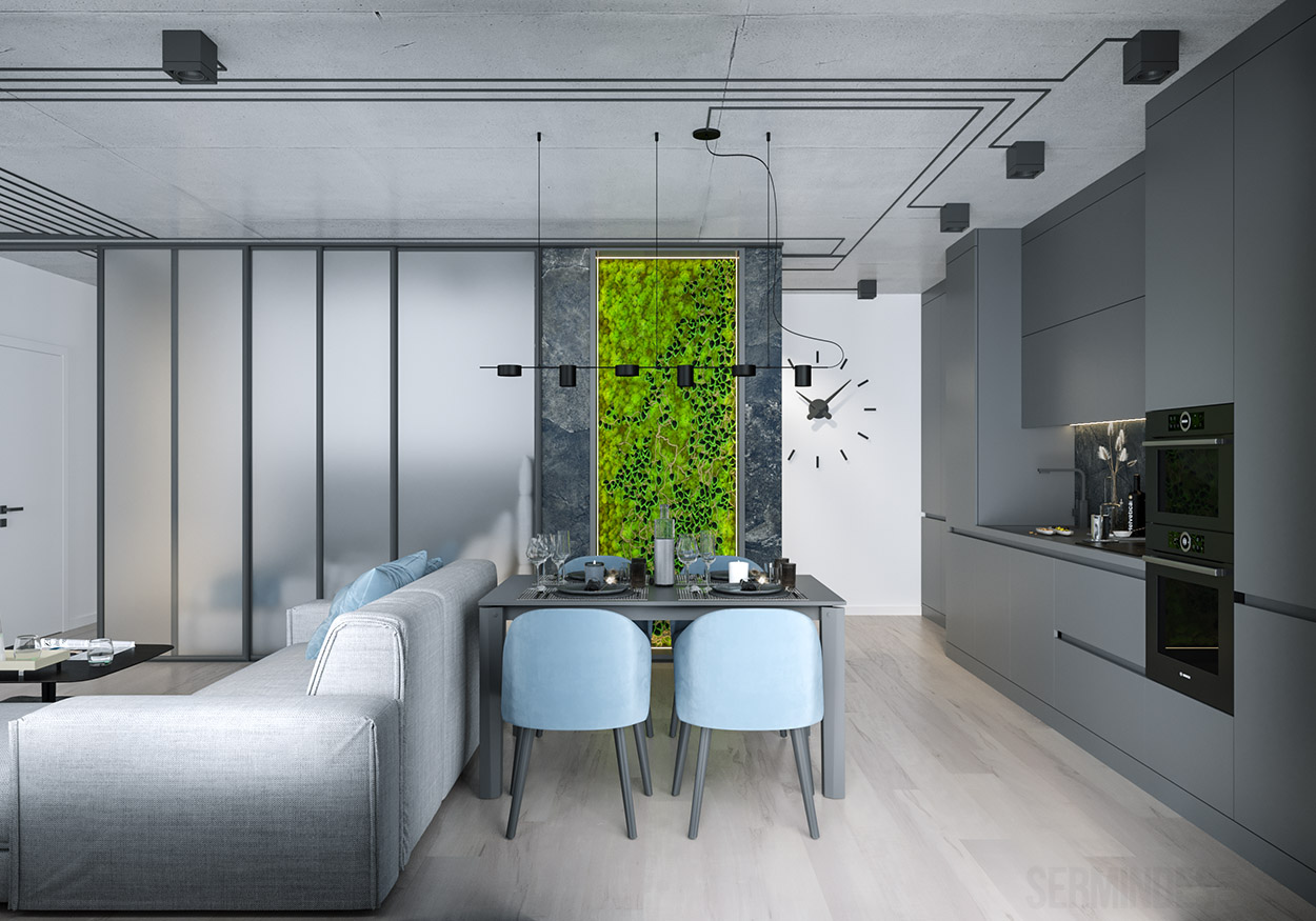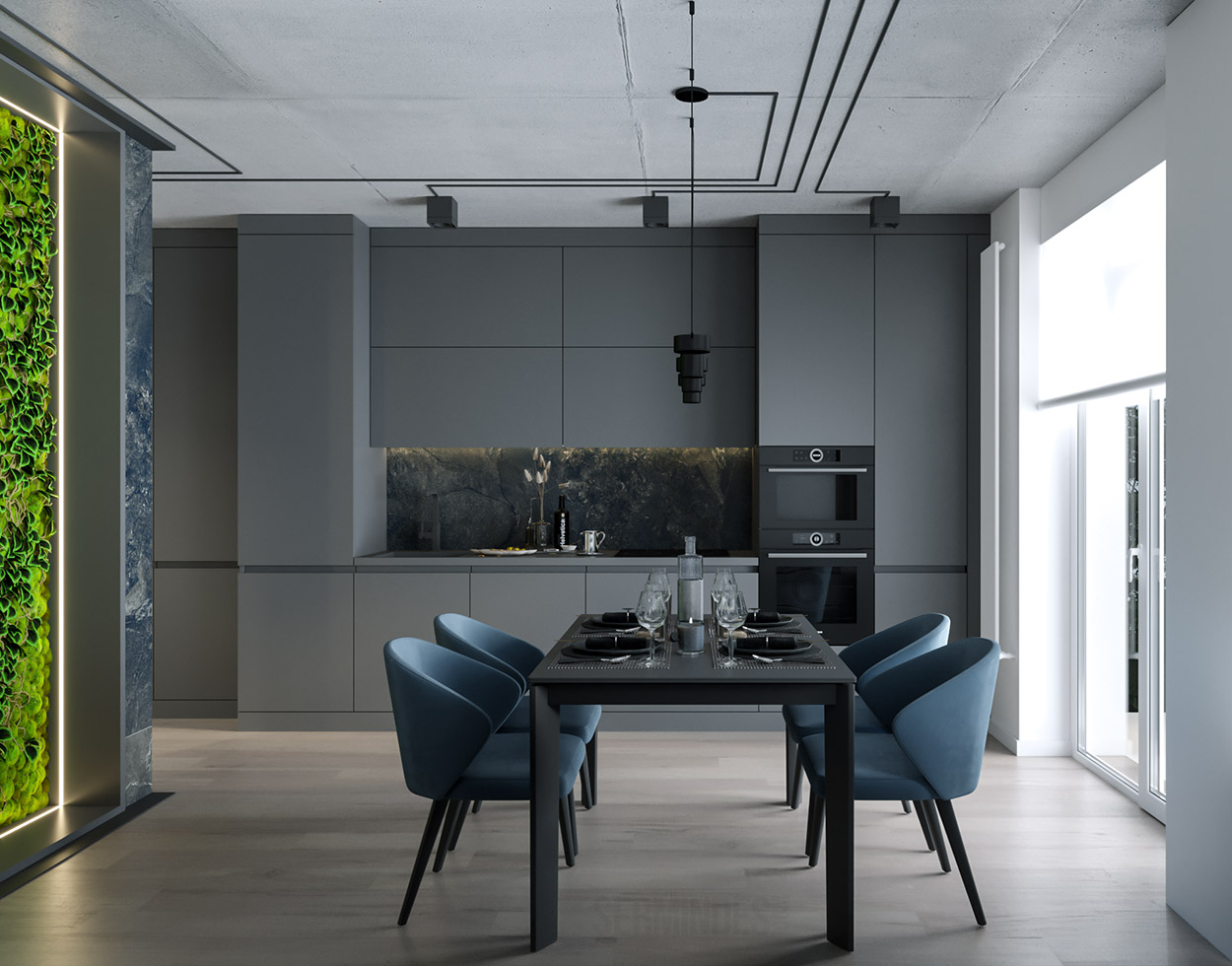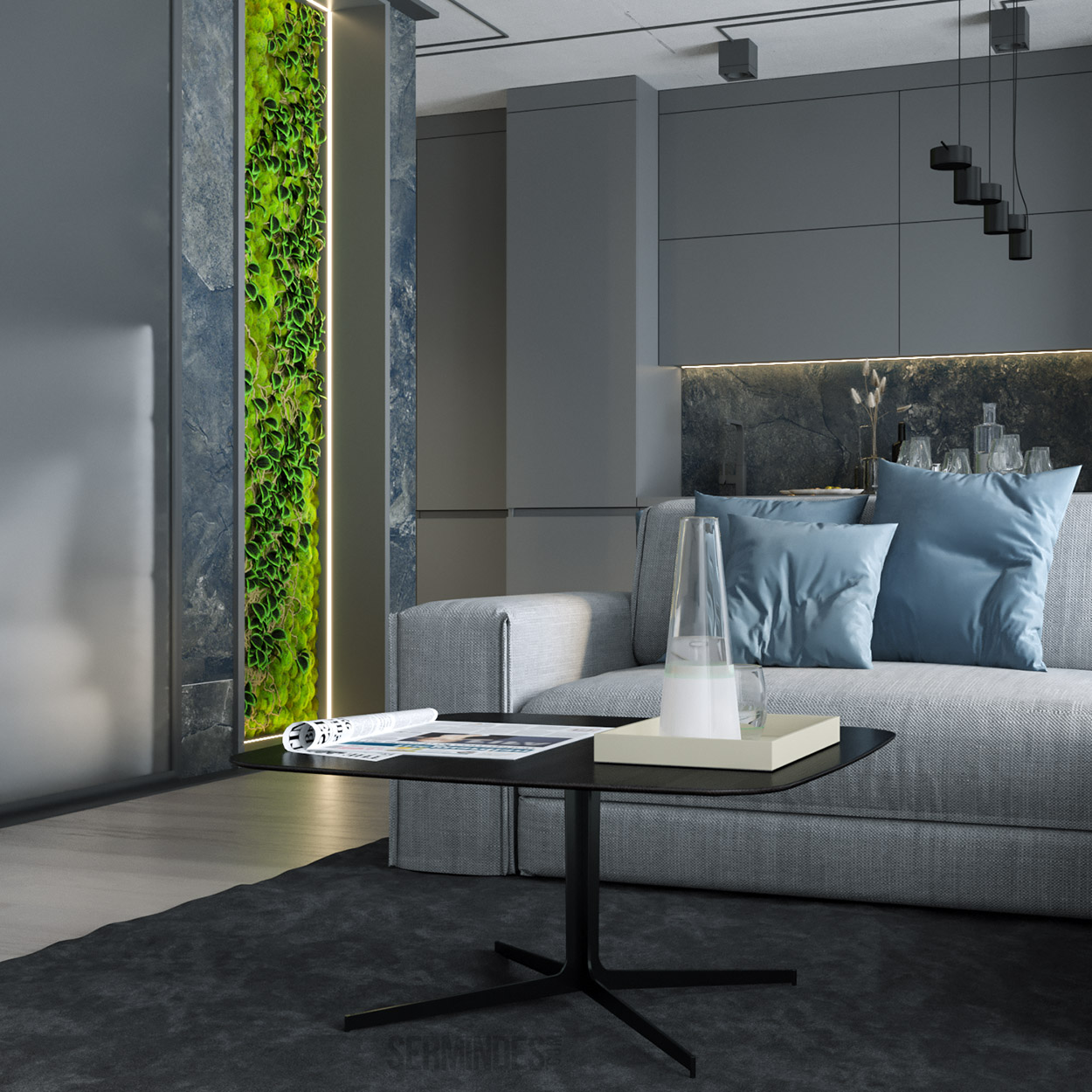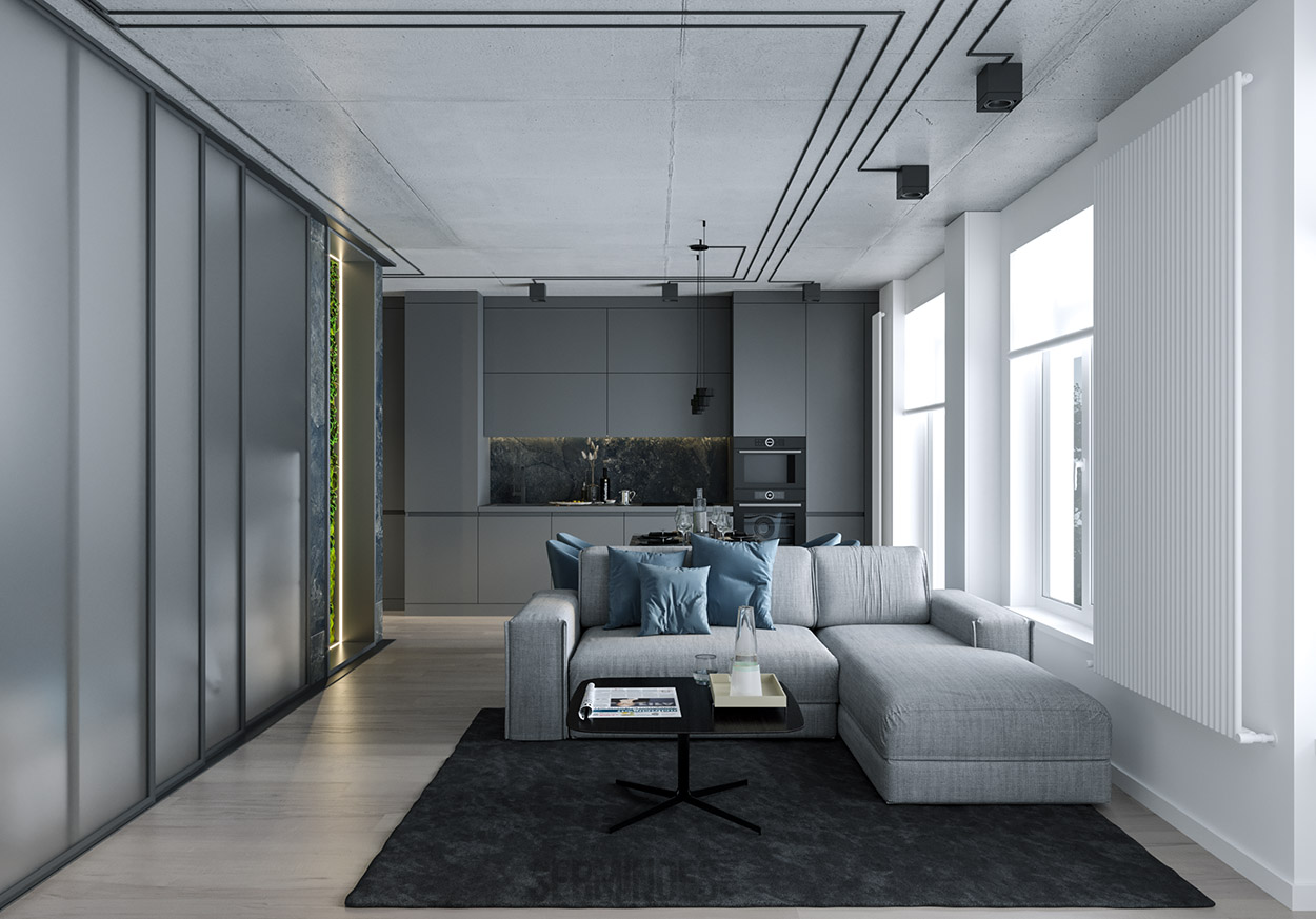 Interior design of a contemporary style apartment with an area of 65 square meters of floor. Studio apartment elaborated in gray colors and materials with natural textures, 2 types of marble and wood with natural concrete.