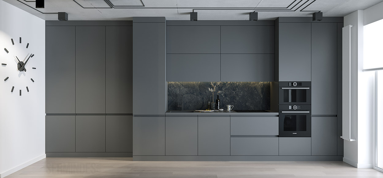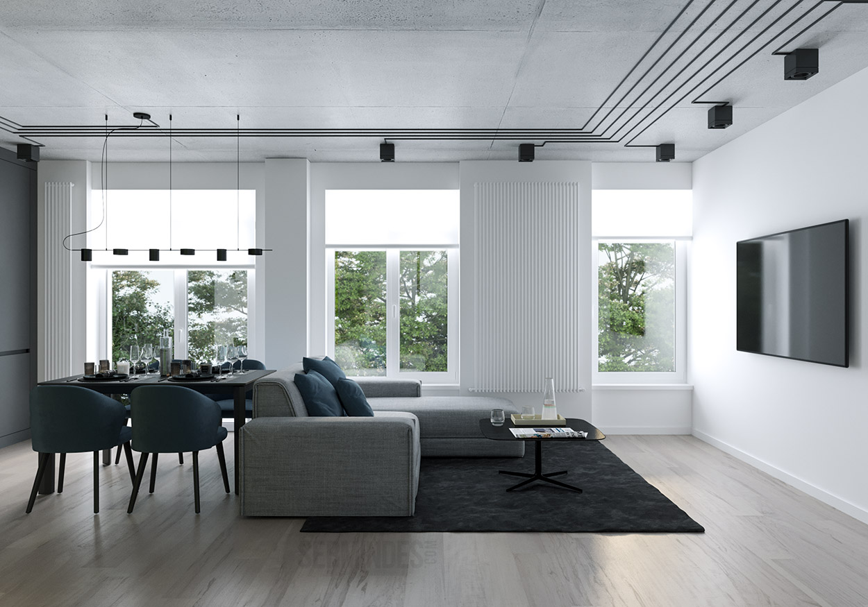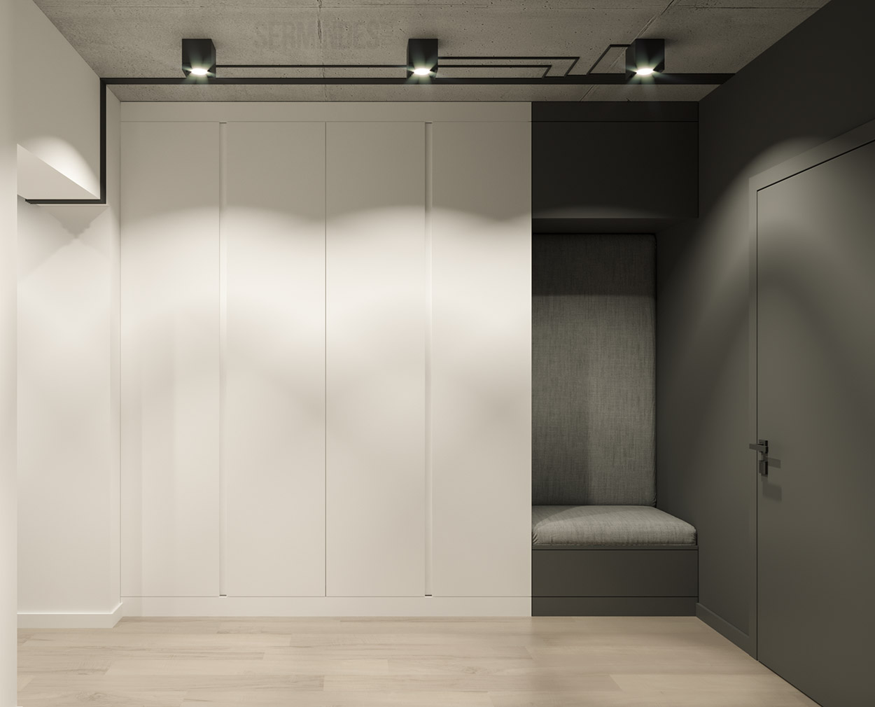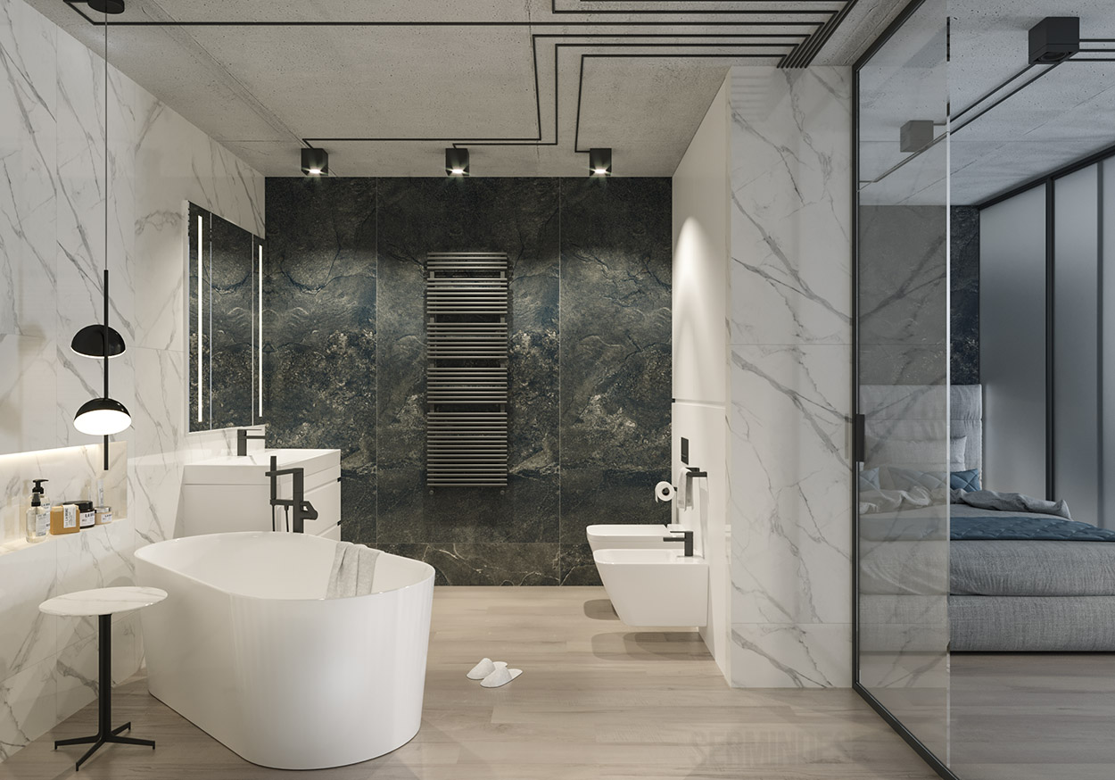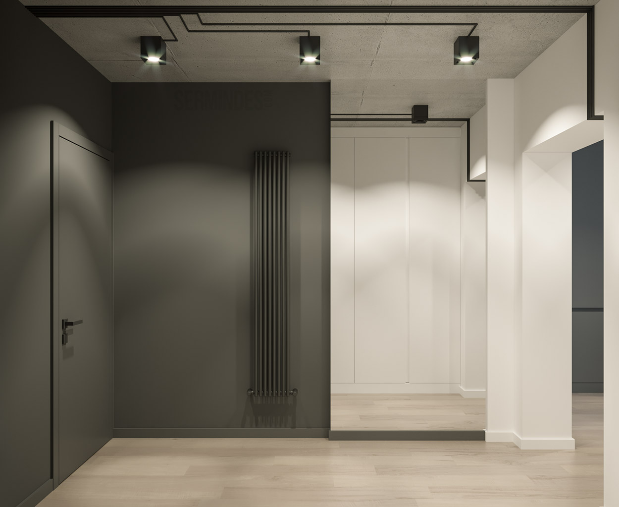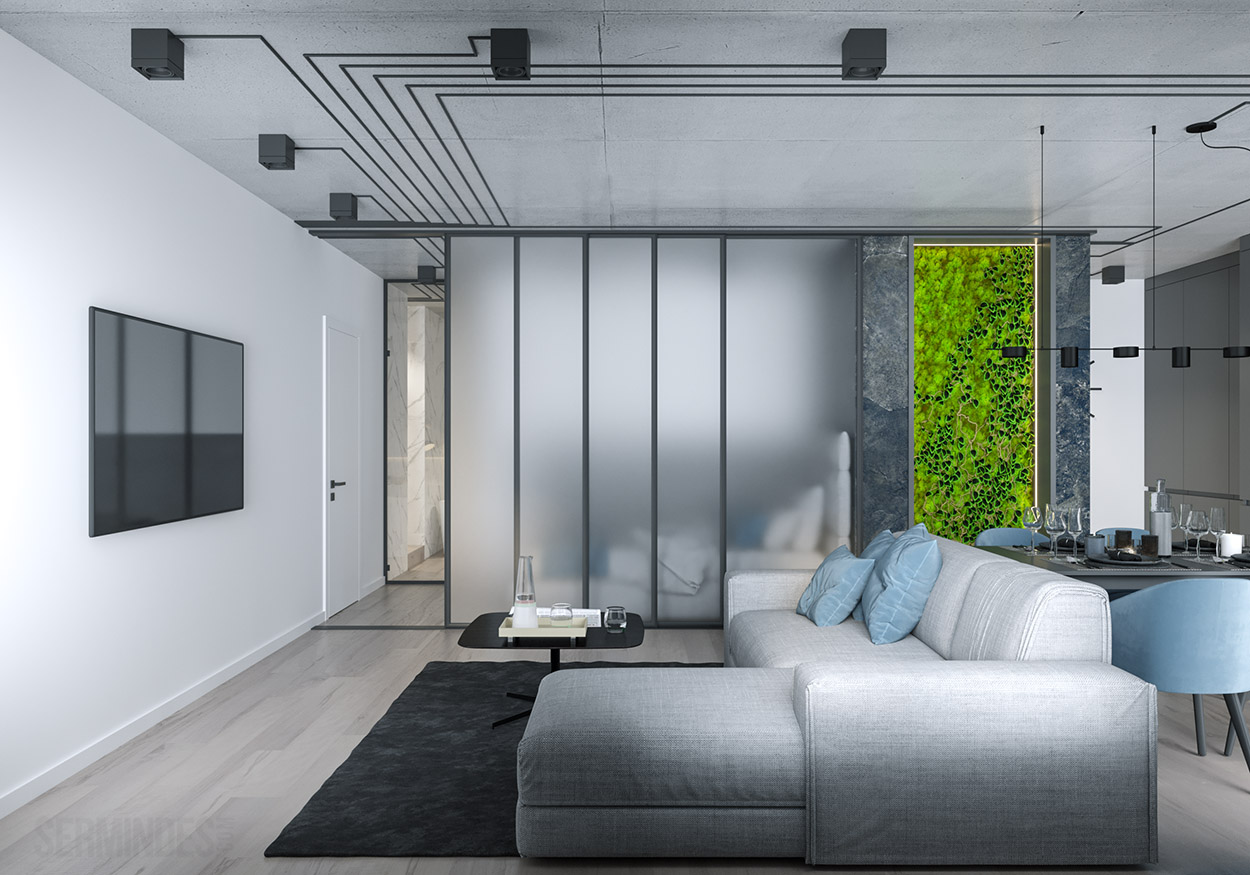 Interior design of a contemporary style apartment with an area of 65 square meters of floor. Studio apartment elaborated in gray colors and materials with natural textures, 2 types of marble and wood with natural concrete.