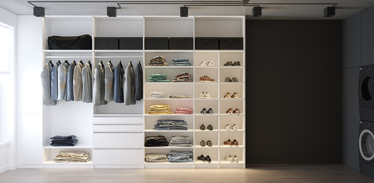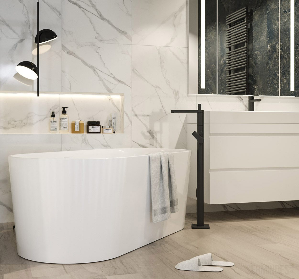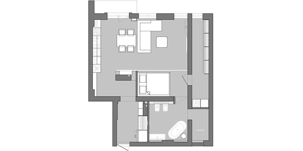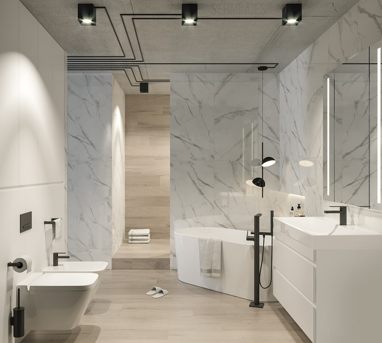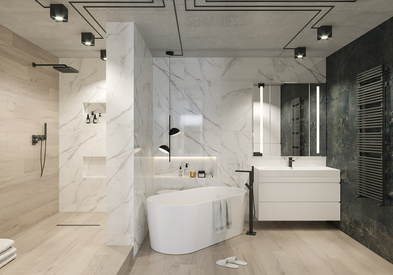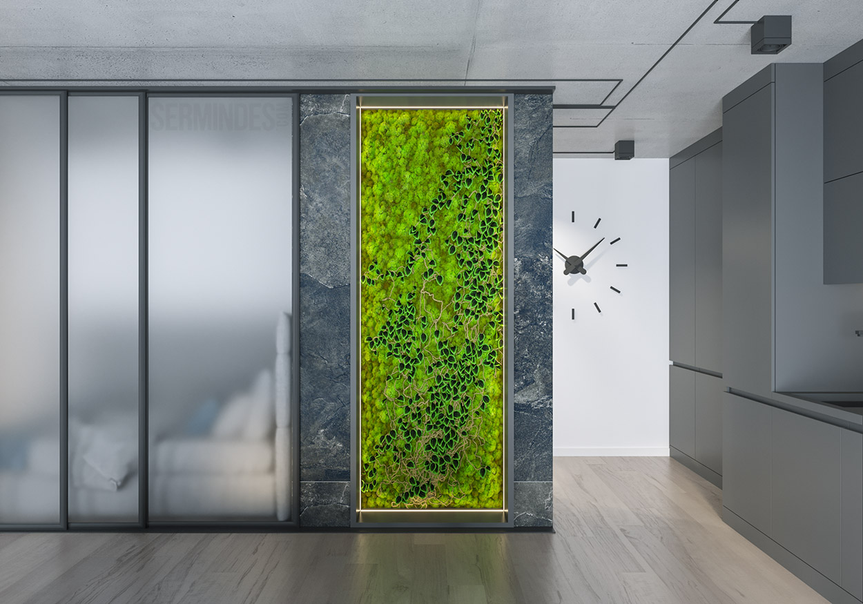 Interior design of a contemporary style apartment with an area of 65 square meters of floor. Studio apartment elaborated in gray colors and materials with natural textures, 2 types of marble and wood with natural concrete.