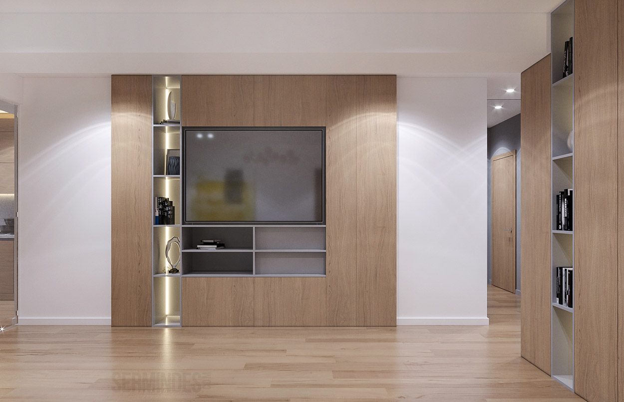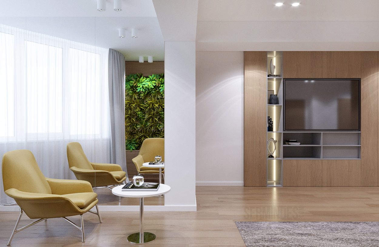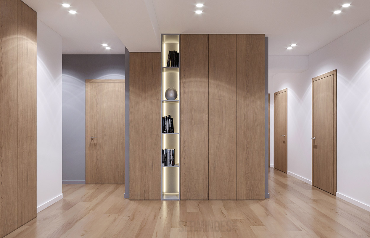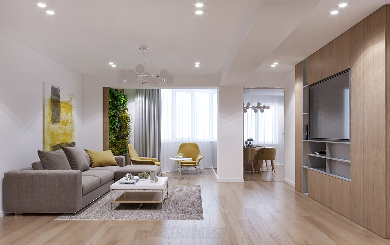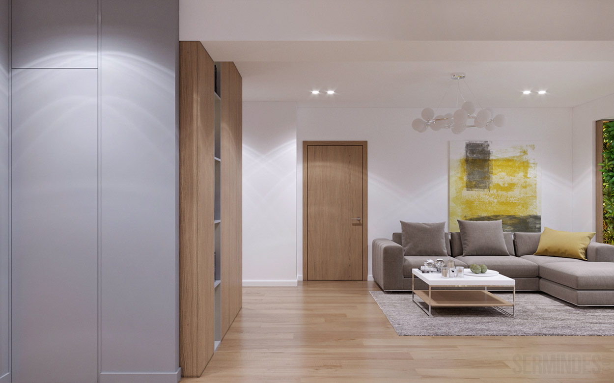 Design interior al unui apartament cu o suprafata de 124 metri patrati. Conceptul a fost elaborat in stil contemporan-minimalist. Materilalele principale, folosite la acest interior, sunt lemnul stejar, gresie-marmura, vopseaua alba si gri.