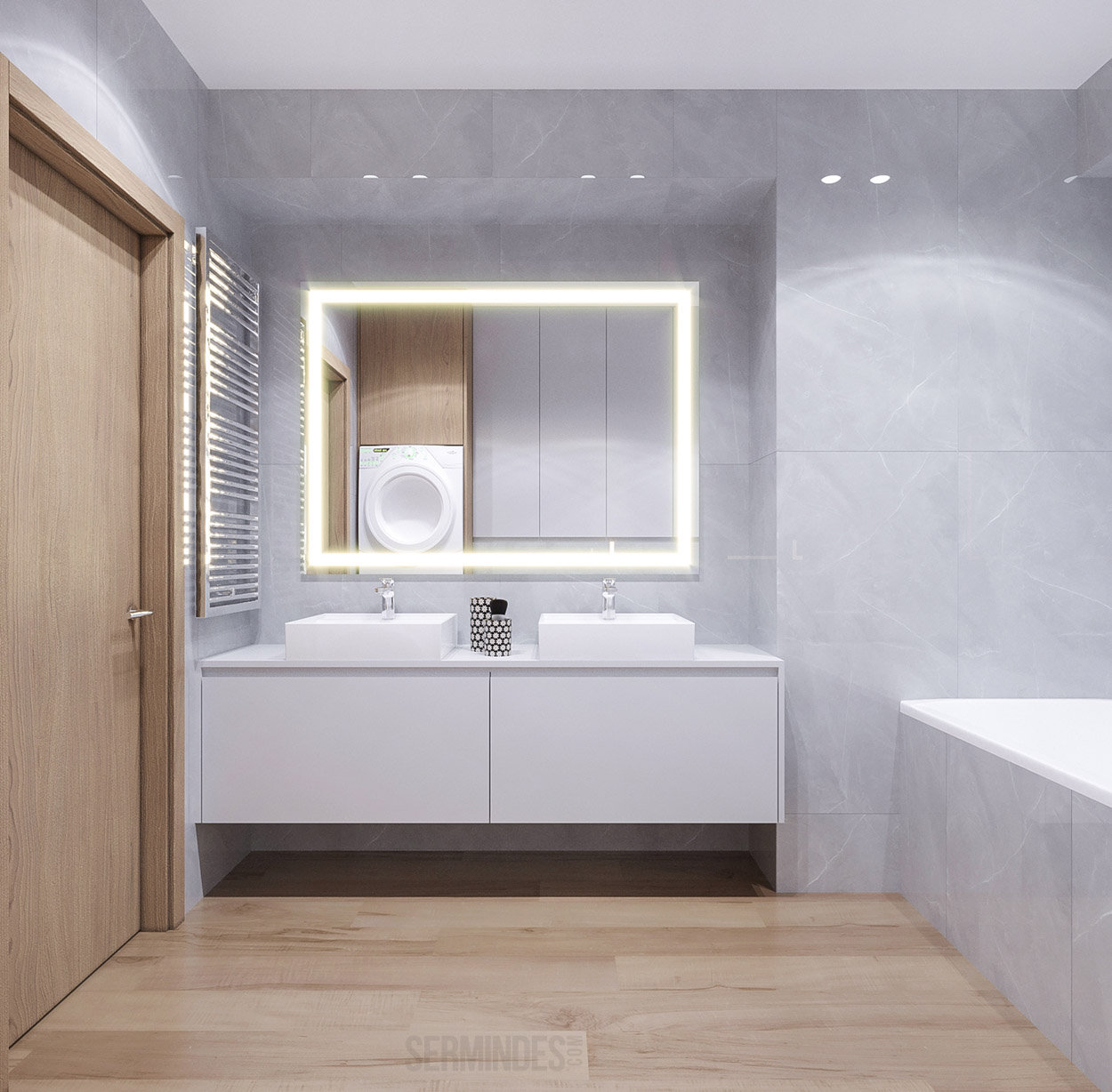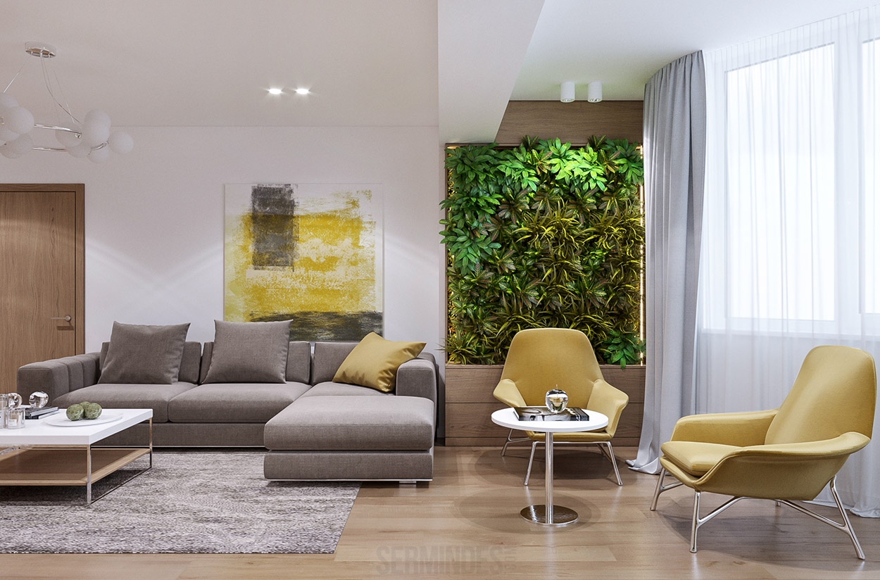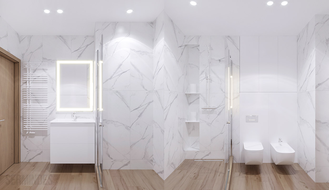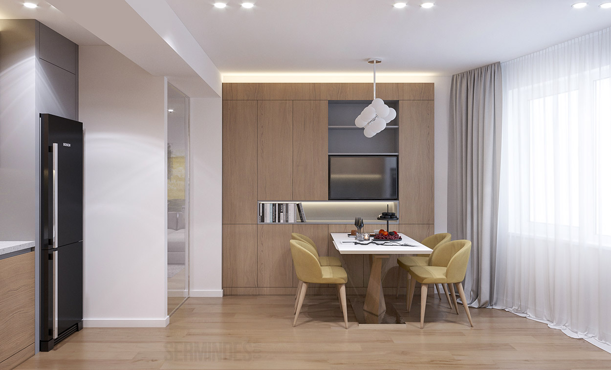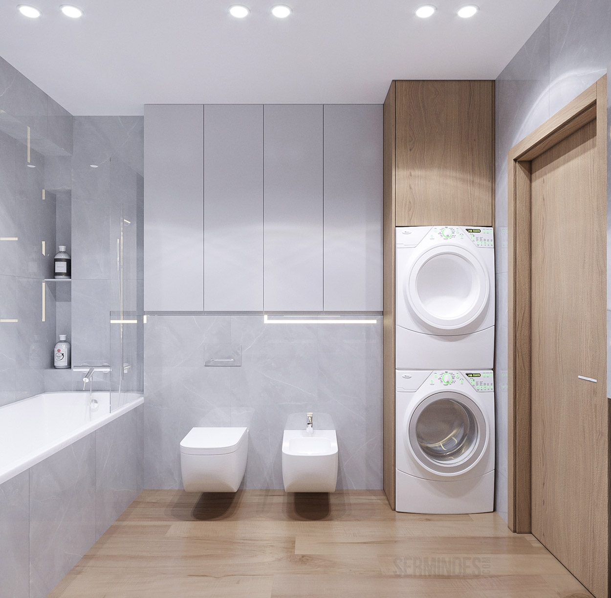 Design interior al unui apartament cu o suprafata de 124 metri patrati. Conceptul a fost elaborat in stil contemporan-minimalist. Materilalele principale, folosite la acest interior, sunt lemnul stejar, gresie-marmura, vopseaua alba si gri.