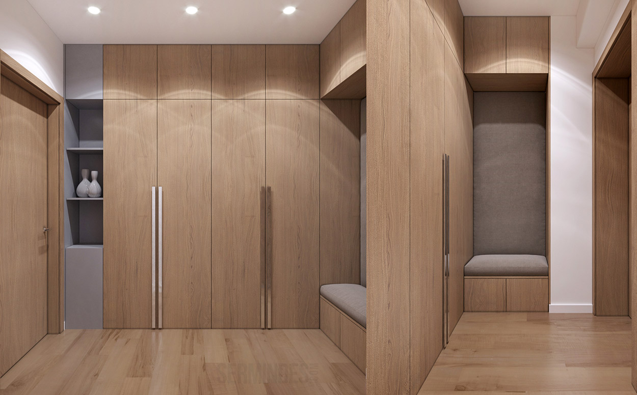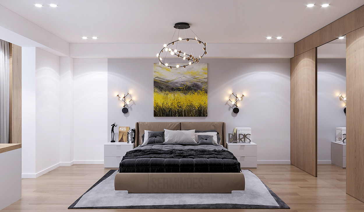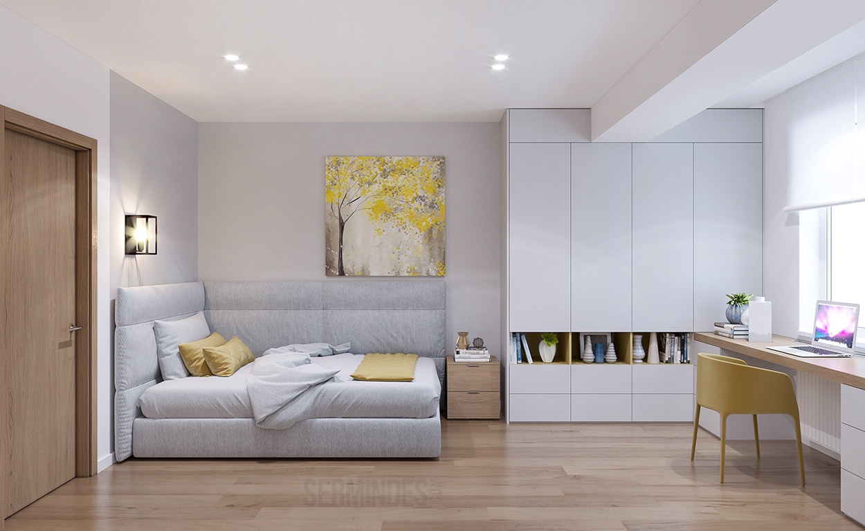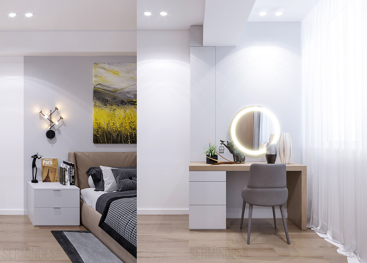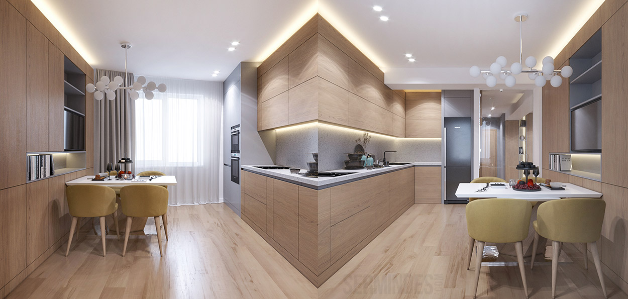 Design interior al unui apartament cu o suprafata de 124 metri patrati. Conceptul a fost elaborat in stil contemporan-minimalist. Materilalele principale, folosite la acest interior, sunt lemnul stejar, gresie-marmura, vopseaua alba si gri.