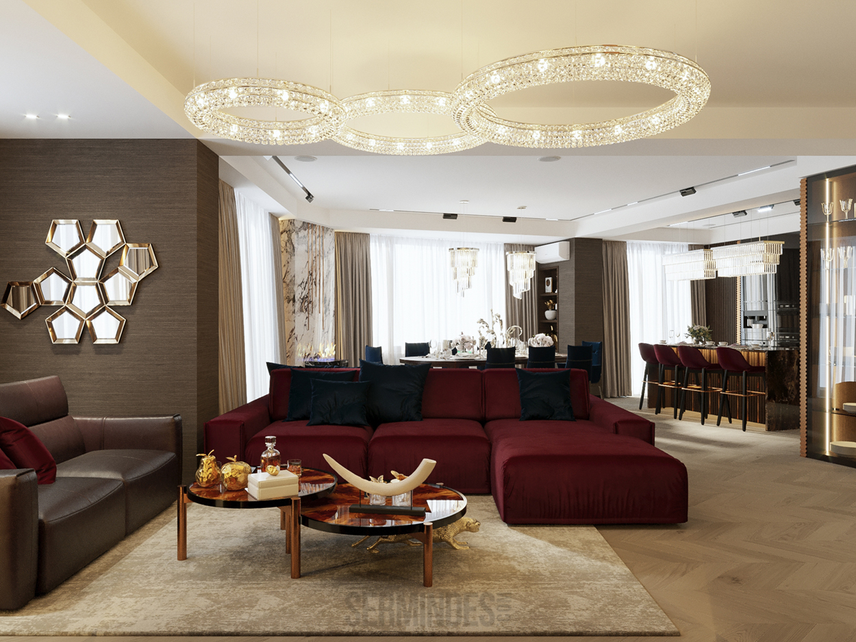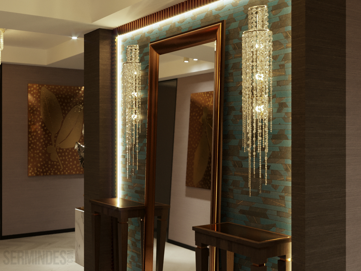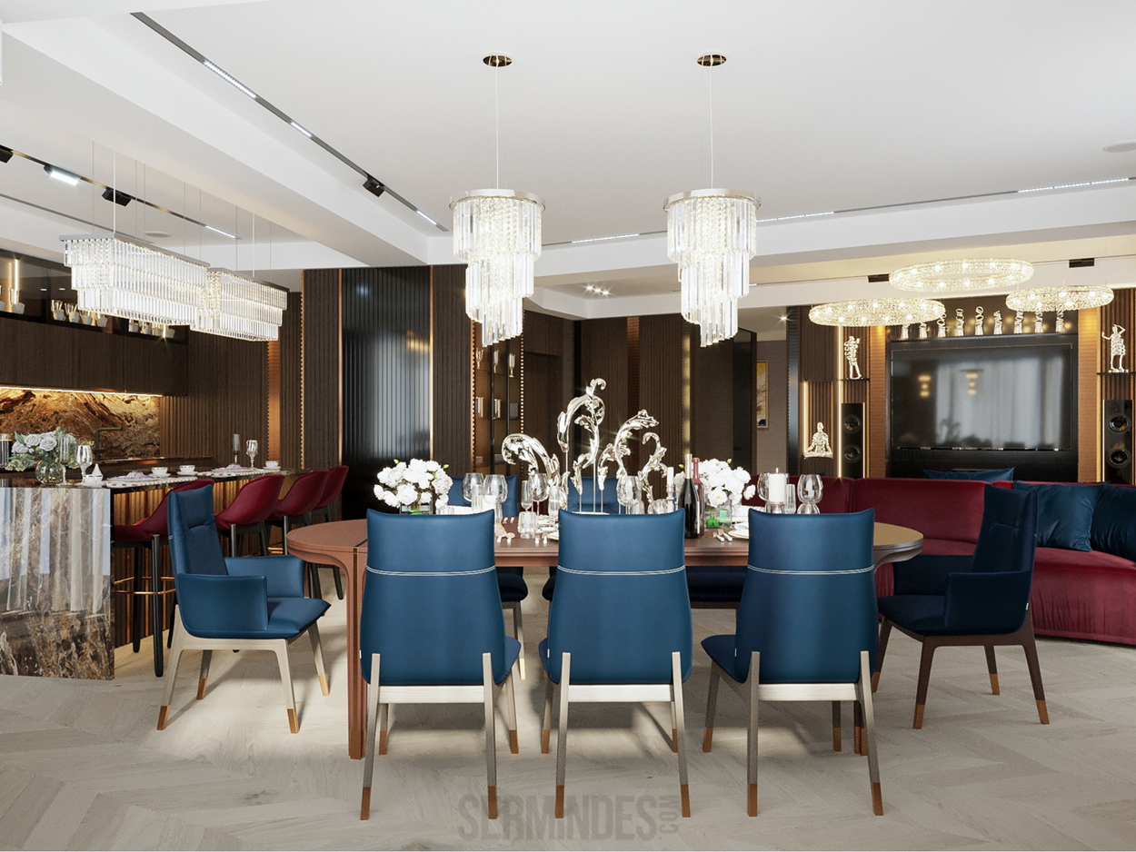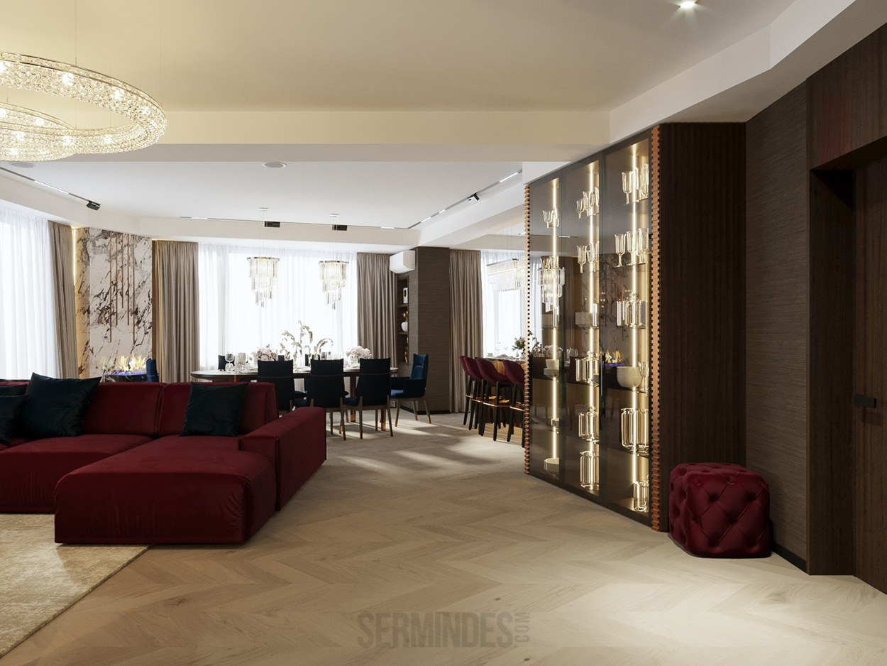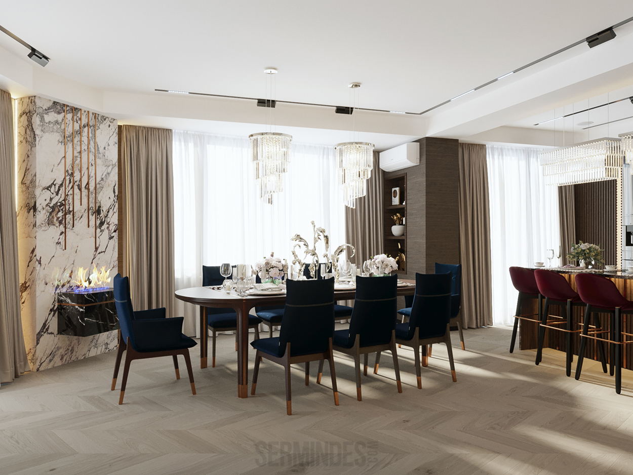 Дизайн интерьера квартиры в комплексе ОАЗИС площадью 250 кв. Выполнены в стилях Contemporary Art Deco - экстравагантно, элегантно, благородно, с характером. Шеврон, елочка, латексные принты часто встречаются в интерьерах в стиле ар-деко. Богат элементами декора, цветами, геометрией.