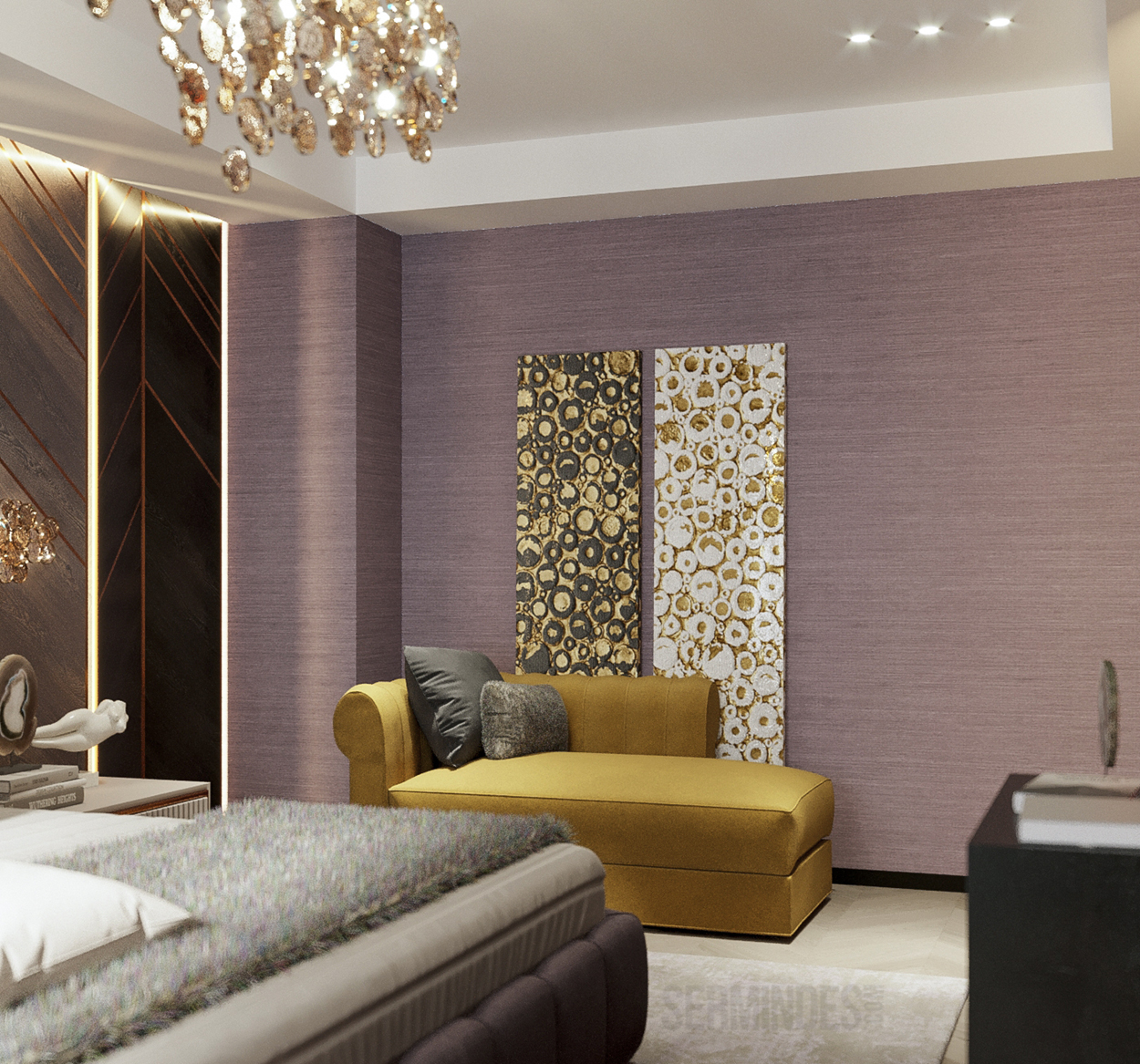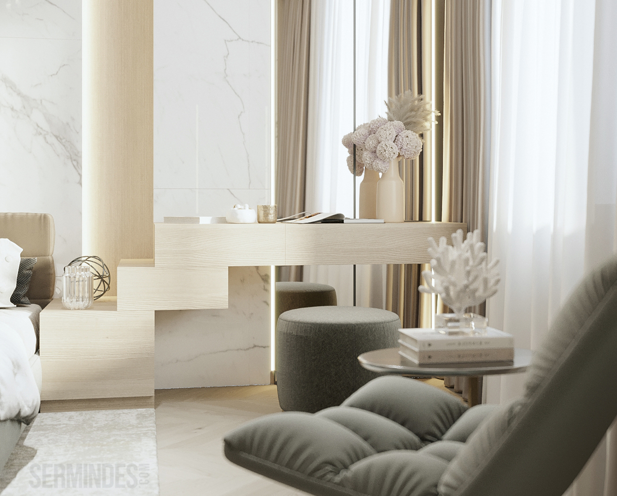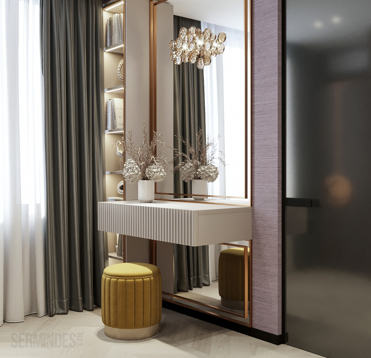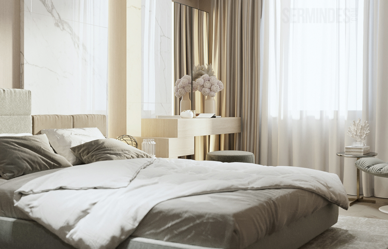 Дизайн интерьера квартиры в комплексе ОАЗИС площадью 250 кв. Выполнены в стилях Contemporary Art Deco - экстравагантно, элегантно, благородно, с характером. Шеврон, елочка, латексные принты часто встречаются в интерьерах в стиле ар-деко. Богат элементами декора, цветами, геометрией.