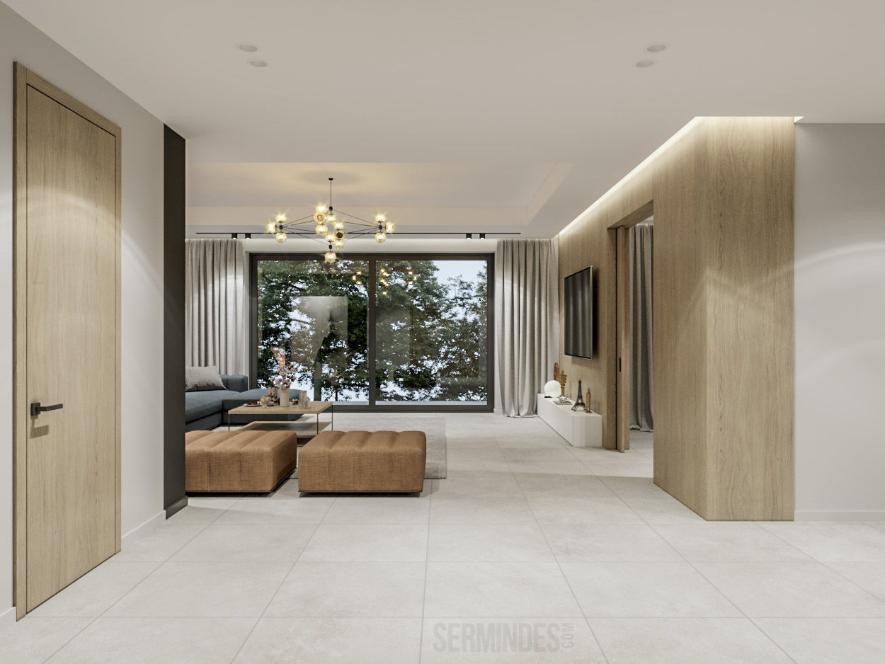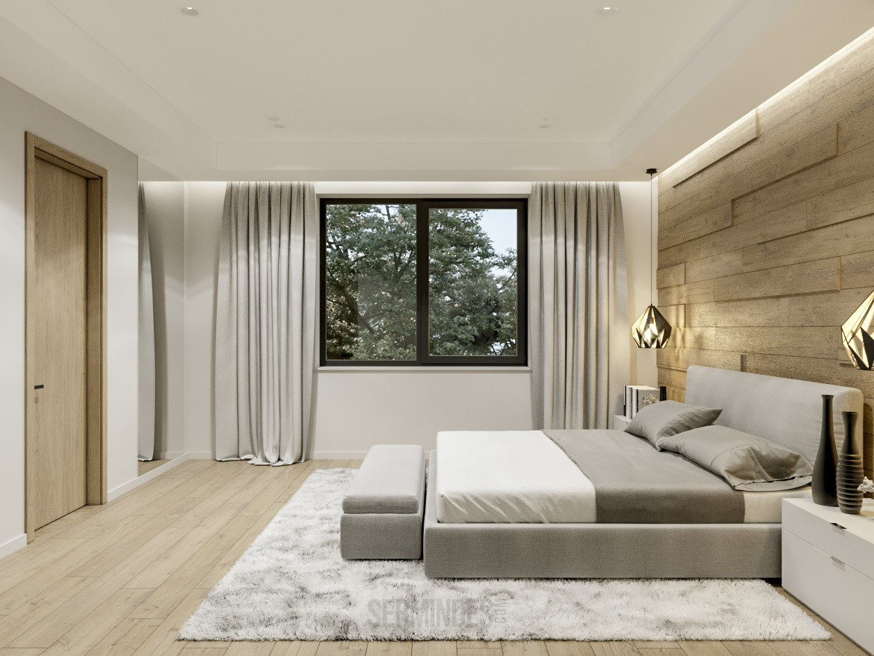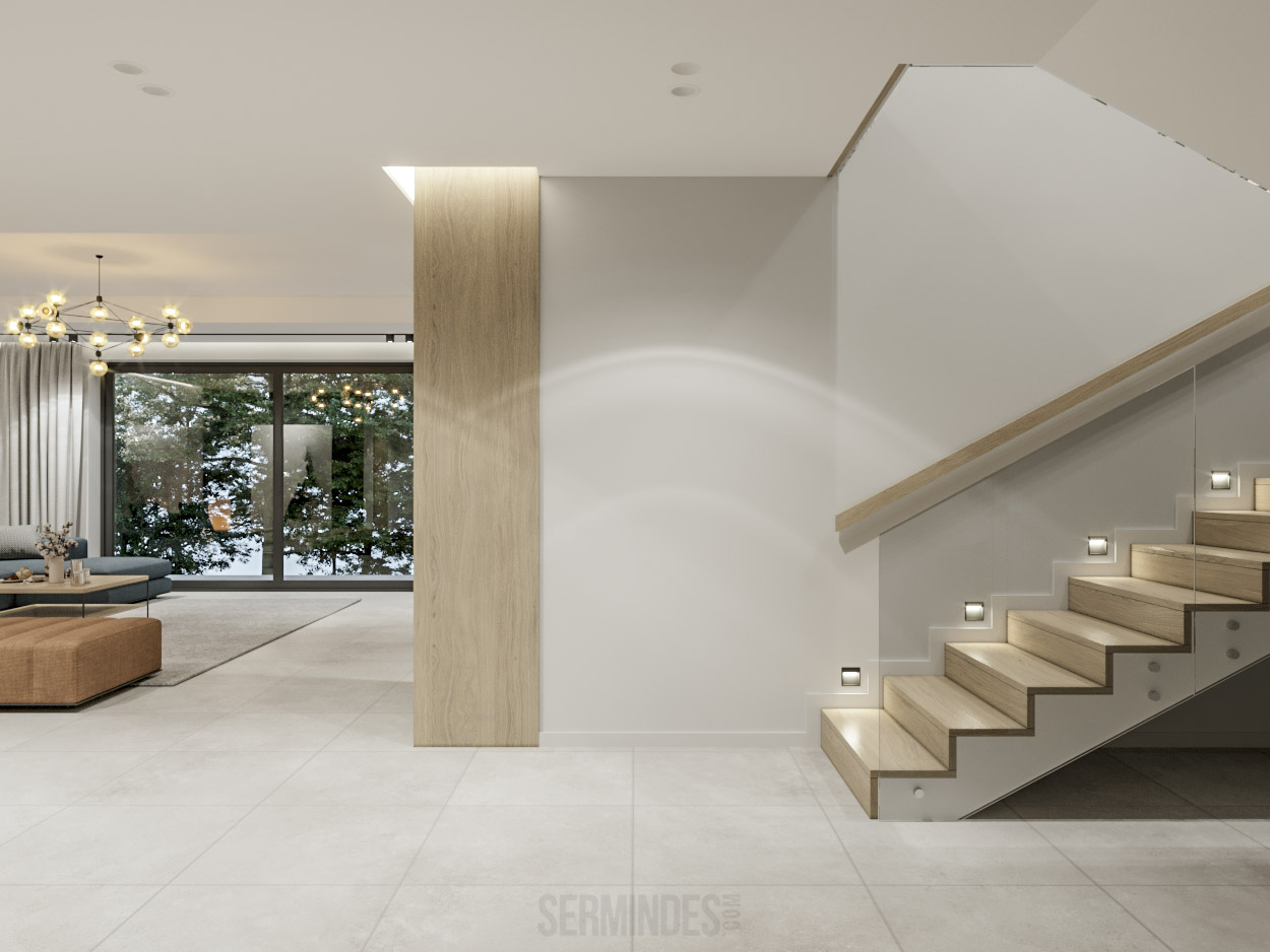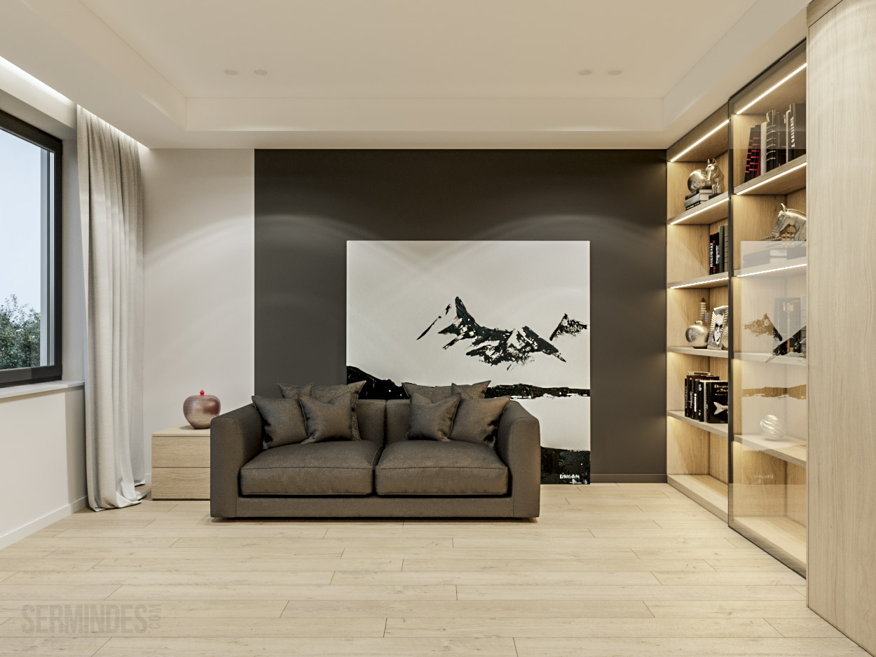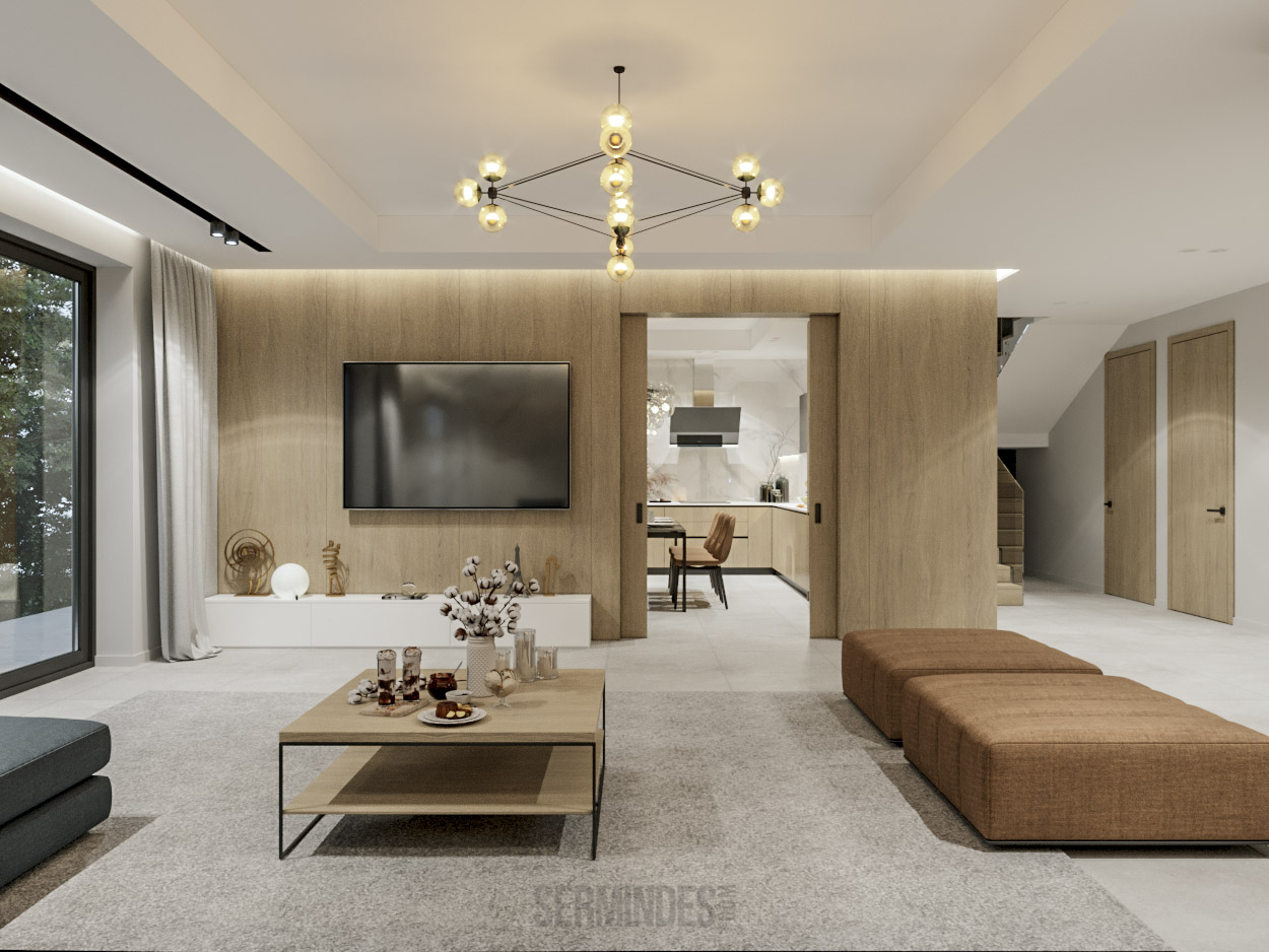 Дизайн интерьера дома. Расположен в Кишиневе, Республика Молдова. Дом состоит из цокольного и первого этажа, с просторной гостиной с выходом на террасу, тремя спальнями, кабинетом, тремя санузлами, кухней-гостиной. Интерьер выполнен в минималистично-современном стиле с простыми формами, иногда с акцентами. Базовые текстуры — дерево, теплый бетон и мрамор, остальные — просто краска от белого до антрацита. Достигнута цель большого пространства, с крупным зонированием в качестве акцента-контраста. Дизайн интерьера Пояна Домняска.