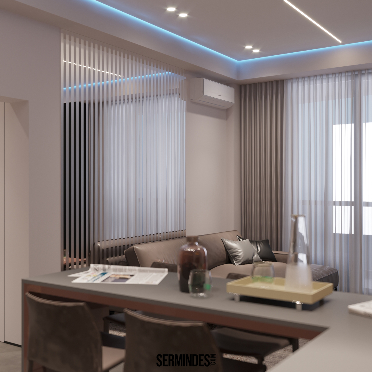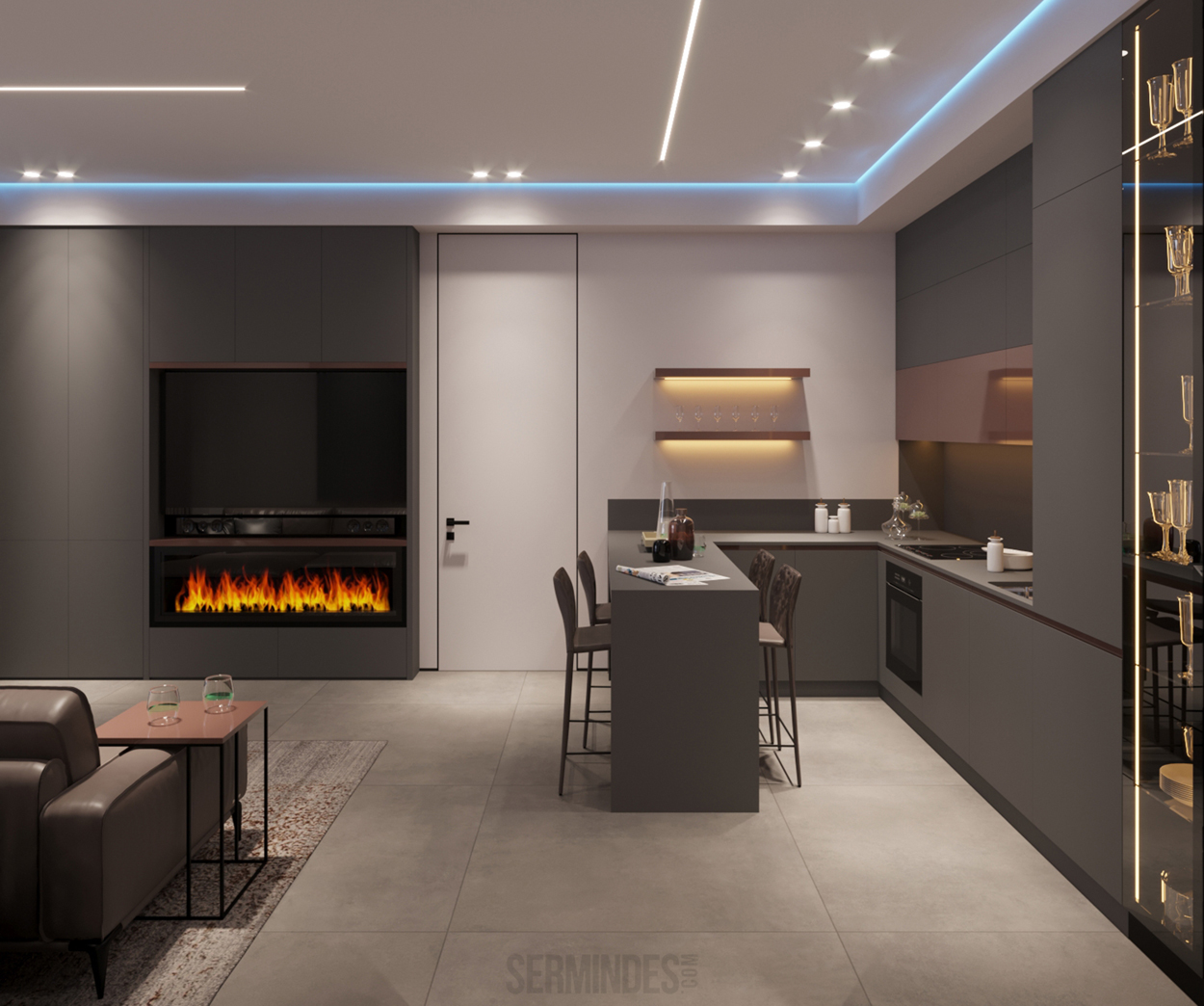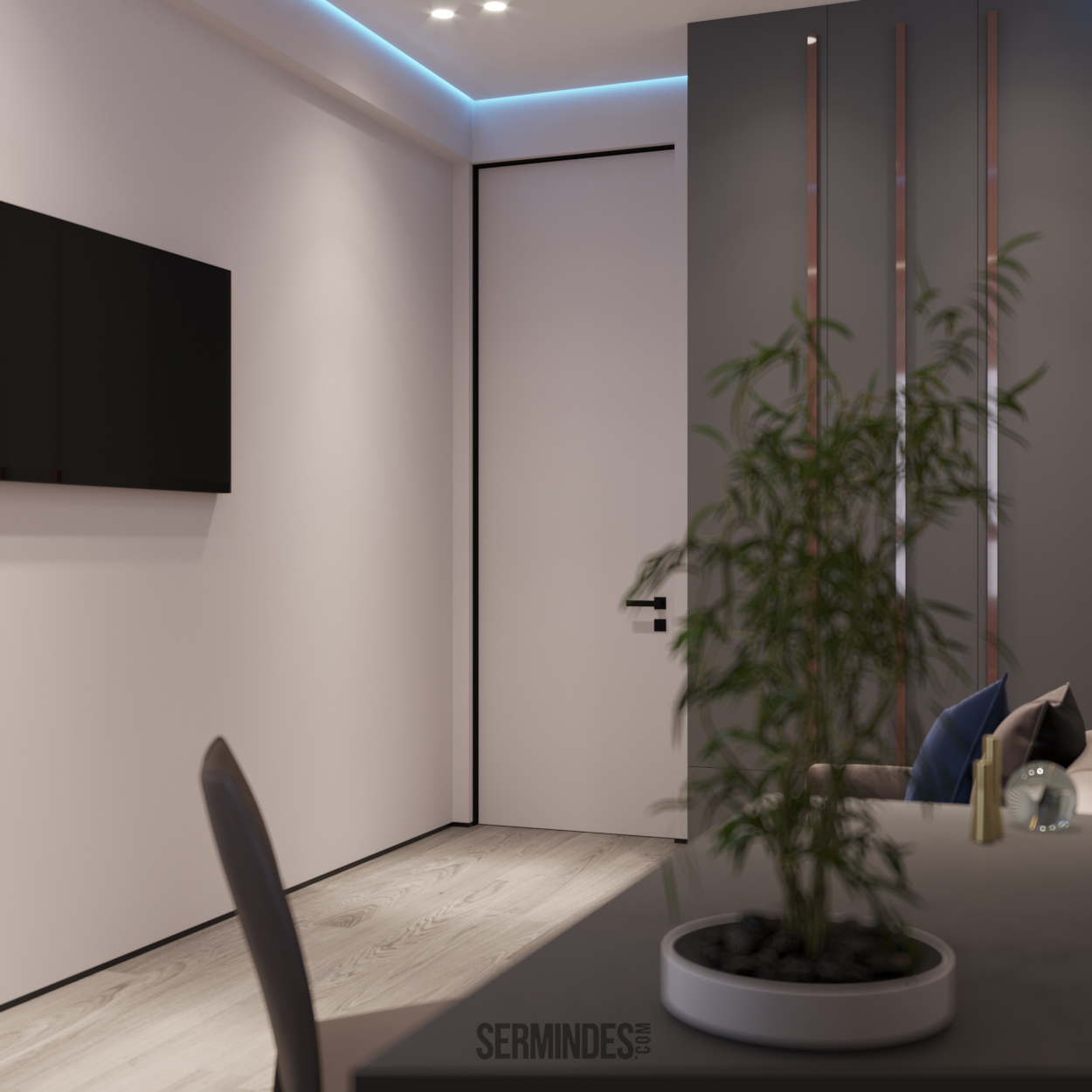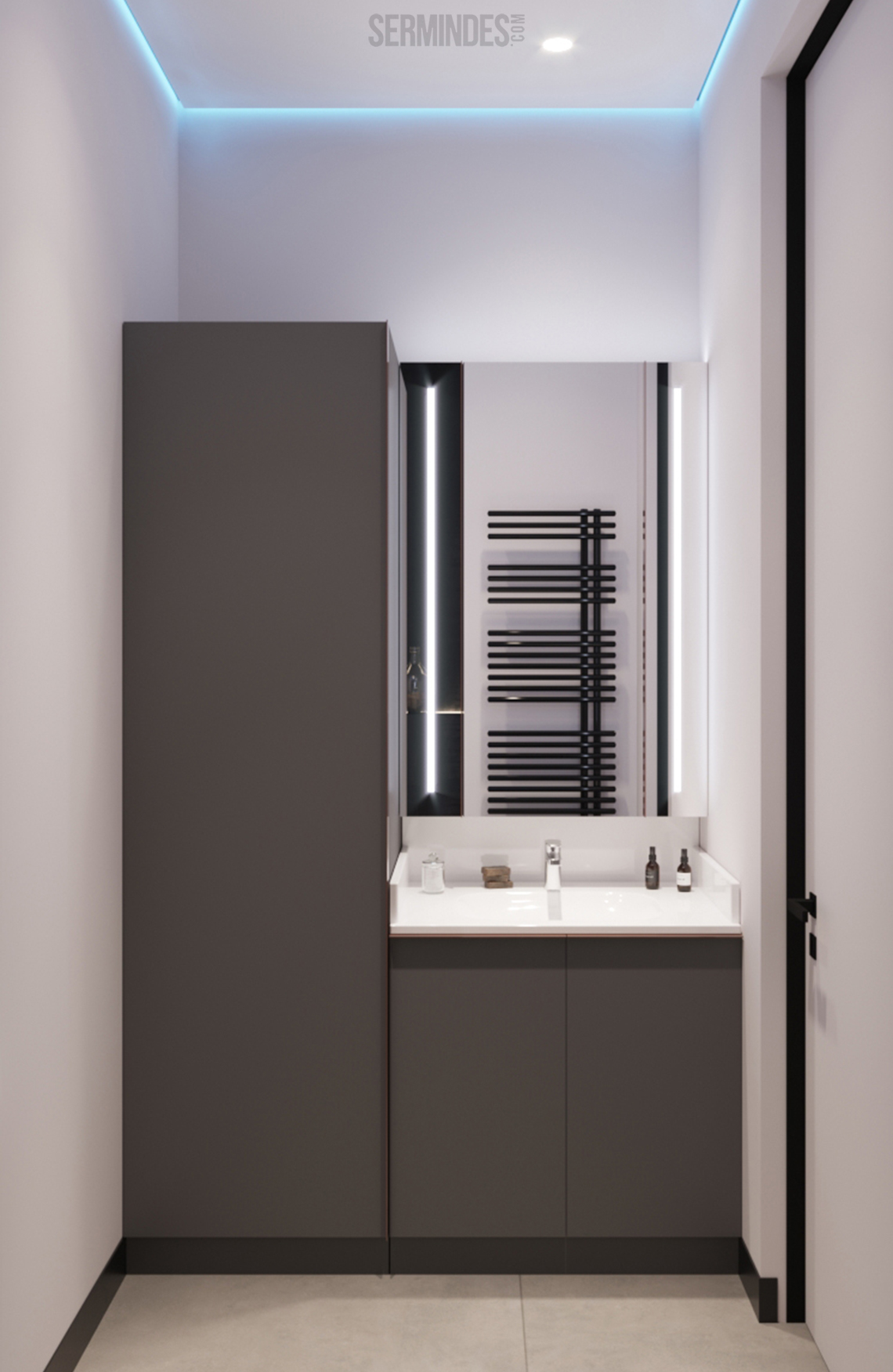 Комплексный дизайн интерьера Оазис. Внутренняя планировка квартиры площадью 71 м.кв. Дизайн интерьера выполнен в стиле модерн-минимализм, монохромная цветовая граница и контраст.