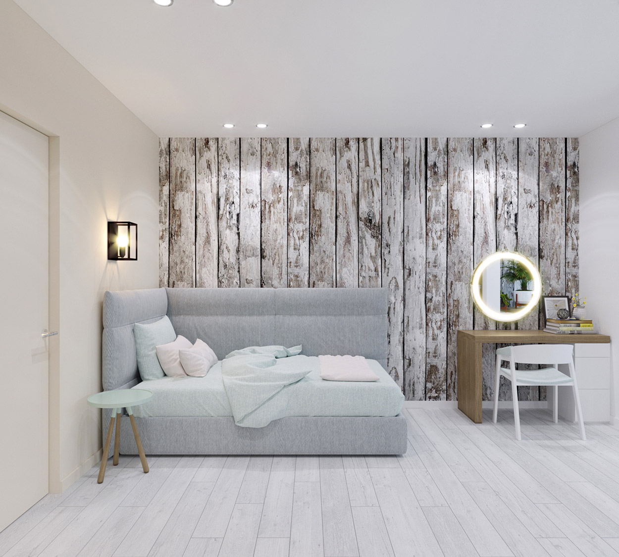 Комната младшей дочери также выполена в светлых тонах, стены, пол и потолок белого цвета. Разбавляет и придает насыщенности одна из стен , отделанная фотообоями, имитирующими( БЕЛОЕ ДЕРЕВО). Мы разместили на столе девочке косметическое зеркало с подсветкой. На сегоднящний день такие зеркала стали популярным предметом. Подсветка помогает детально рассмотреть все ньюансы и сделать качественный макияж, при этом значительно снимает напряжение глаз.