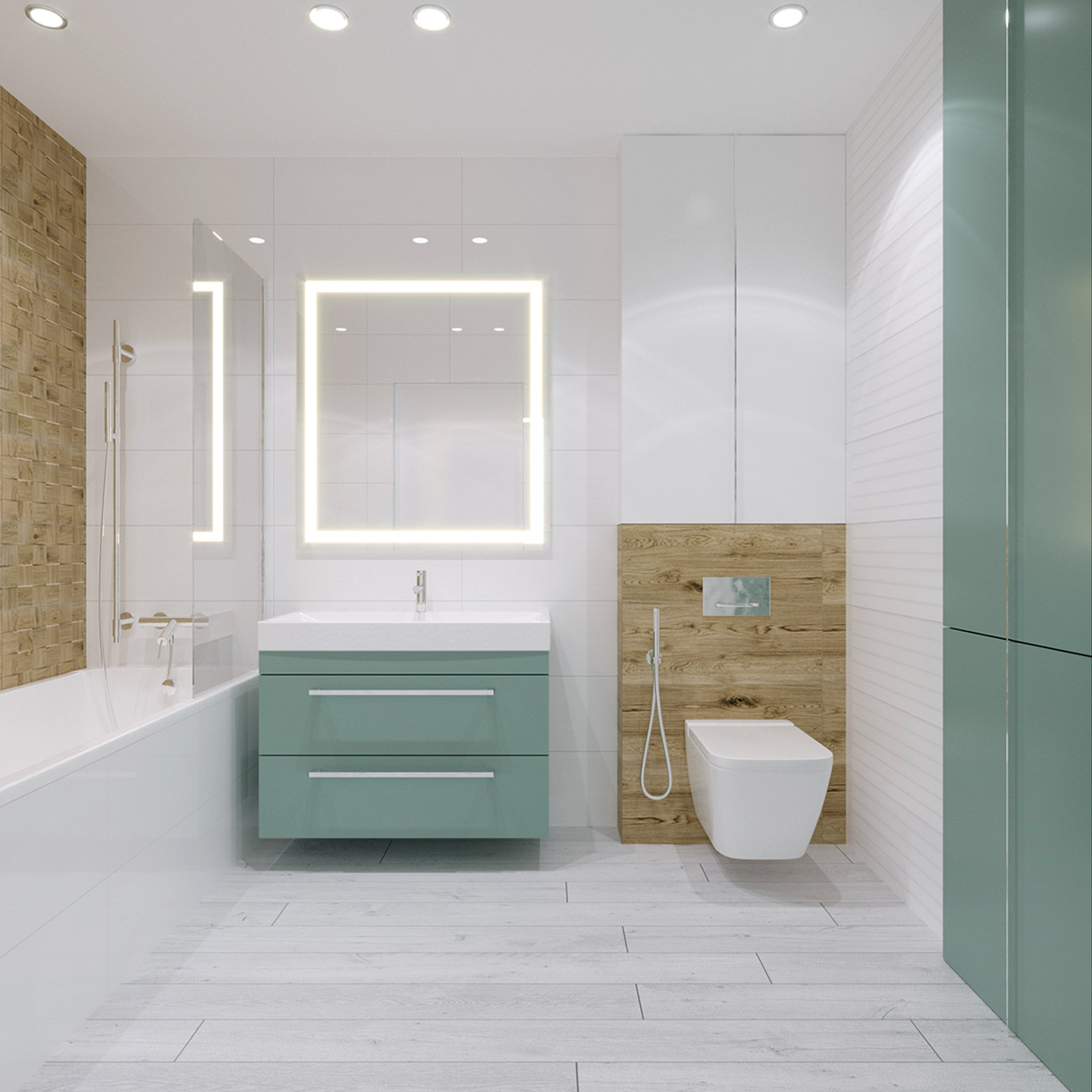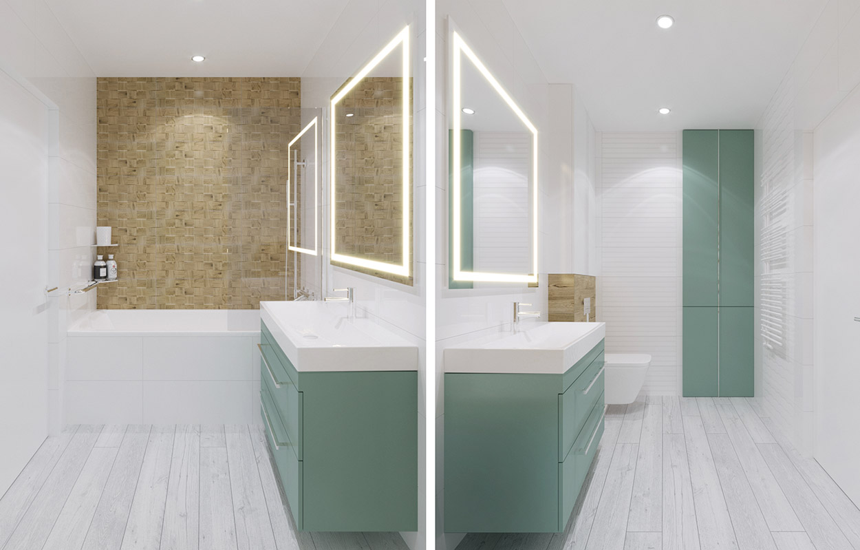 Тумба для ванны сделана из МДФ салатового цвета. Мы минимализировали наличие аксессуаров, мебели и видимой техники, удачно спрятав стиральную машинку в строенный шкаф в ванной.