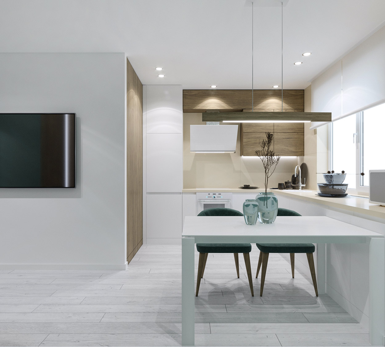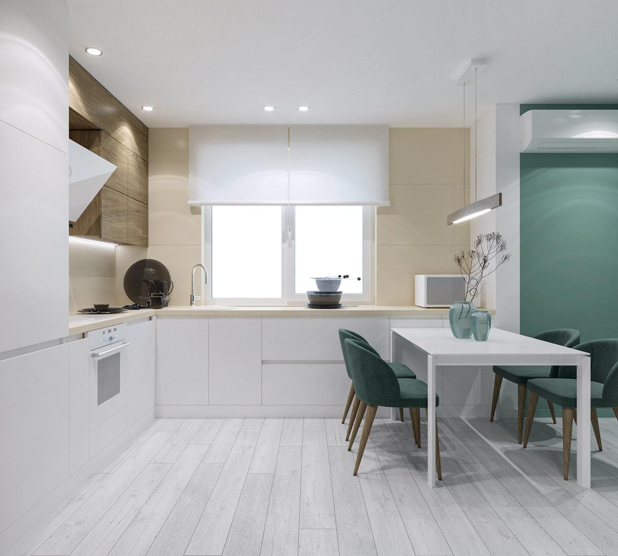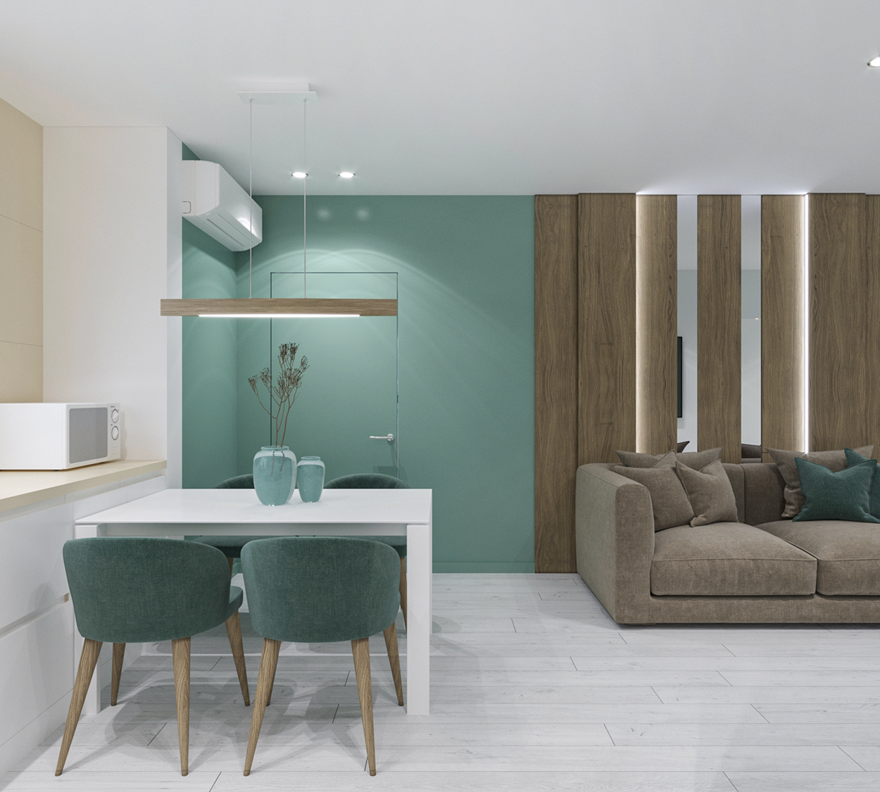 Одной из наших задач было грамотно обыграть объединенные кухонную зону и зал. Чтобы гармонично сочетать цвета, мы выбрали нежный салатовый со светлыми оттенками и смелый насыщенный цвет дерева.