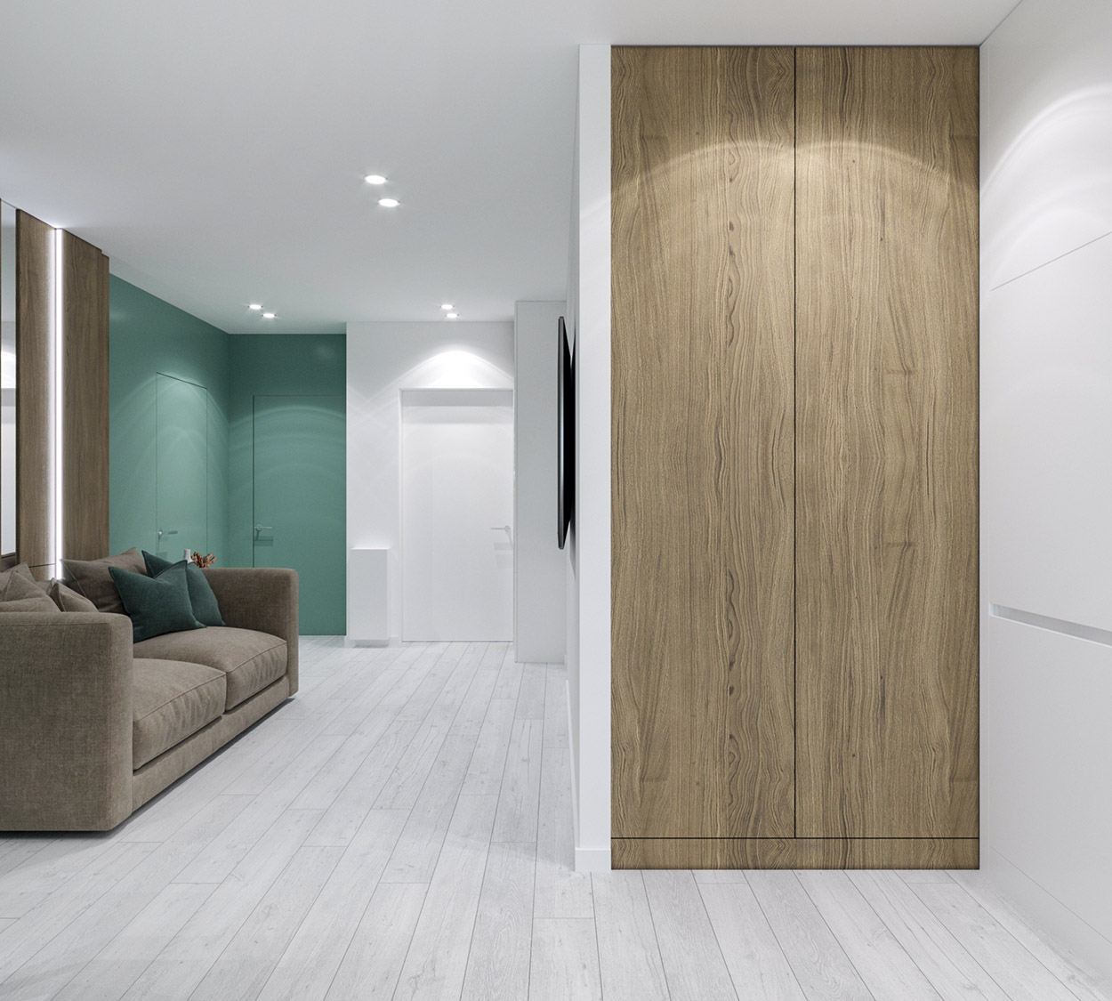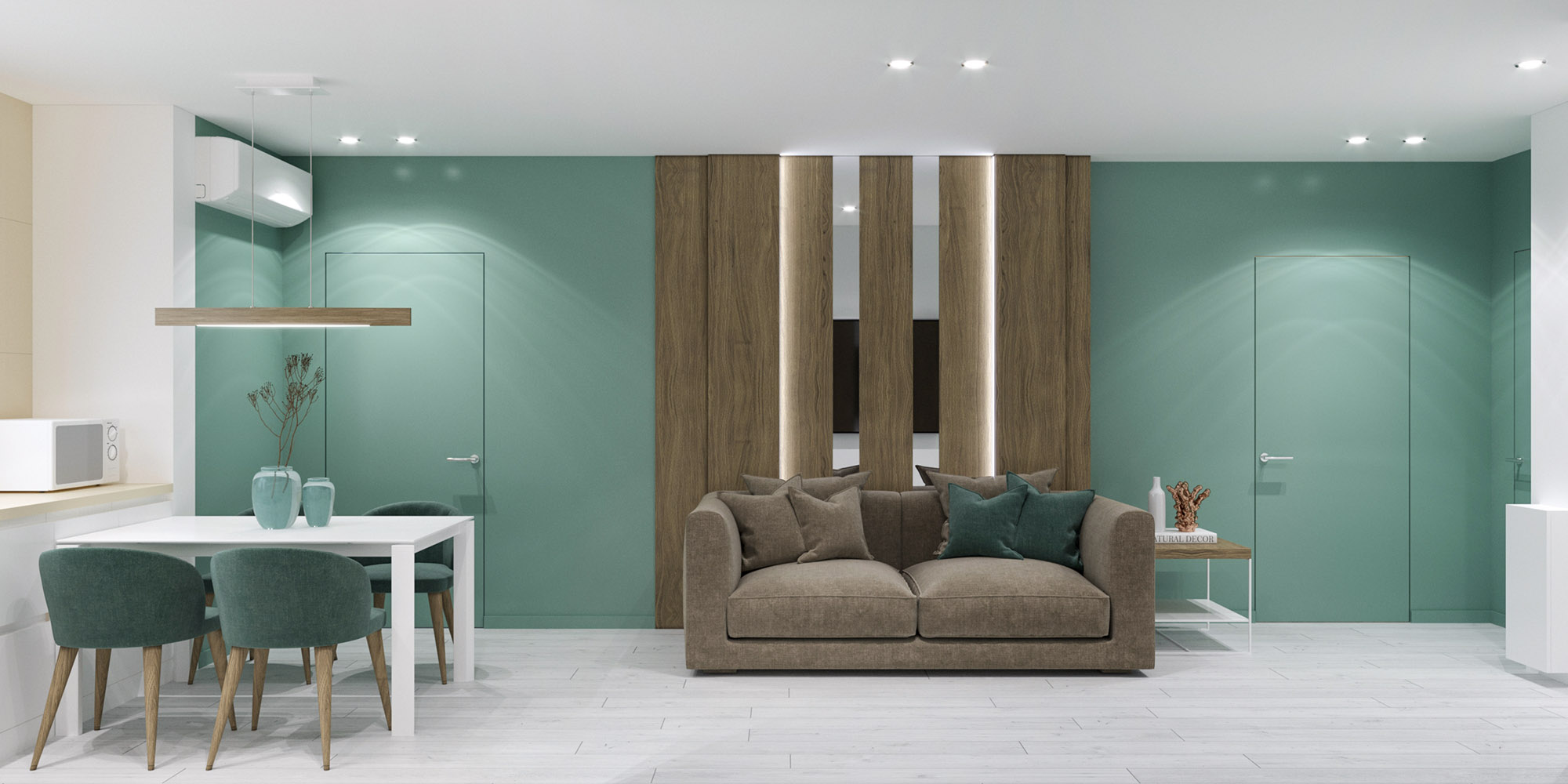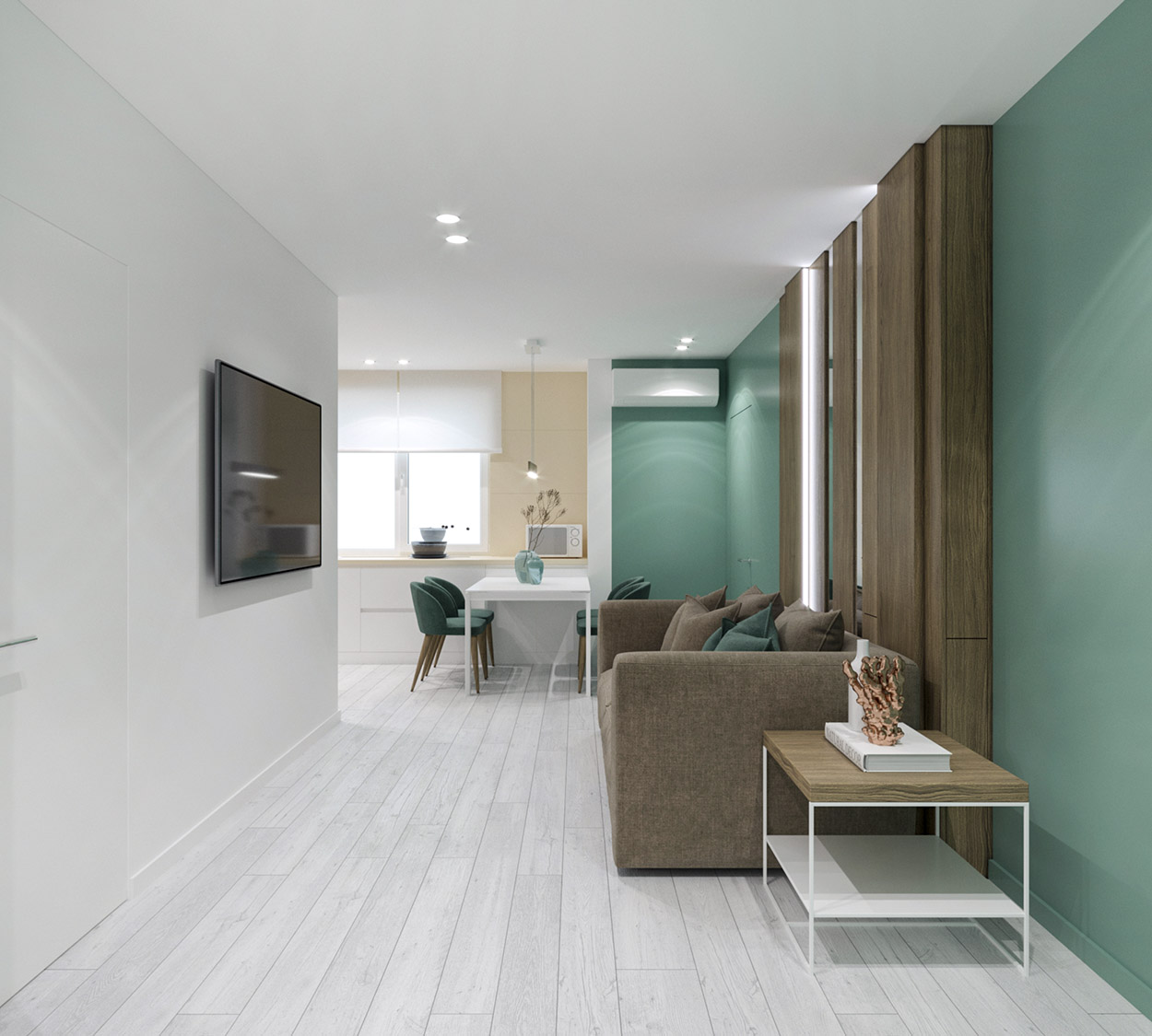 Одной из наших задач было грамотно обыграть объединенные кухонную зону и зал. Чтобы гармонично сочетать цвета, мы выбрали нежный салатовый со светлыми оттенками и смелый насыщенный цвет дерева.