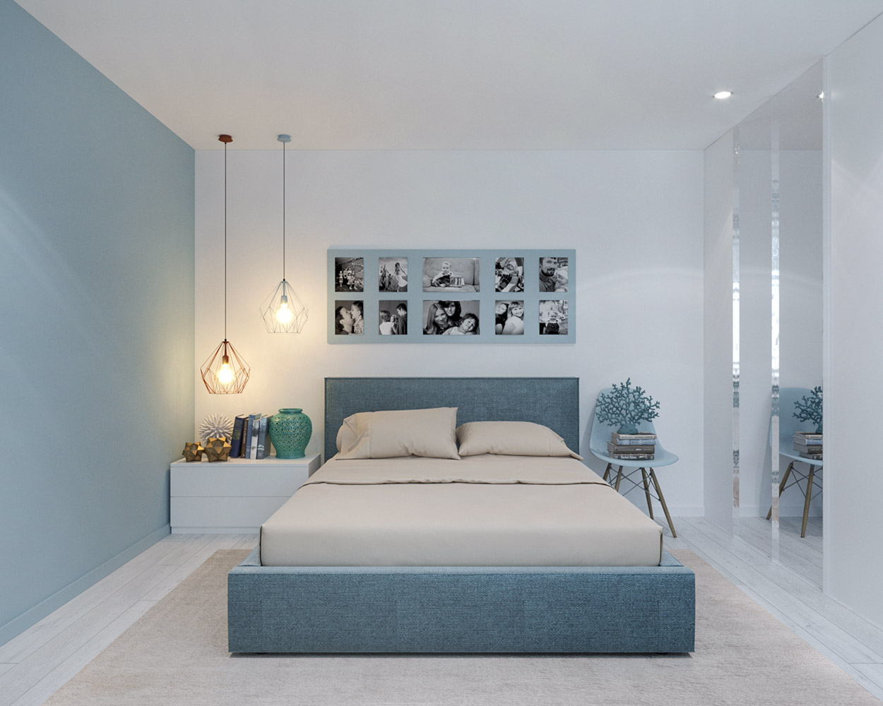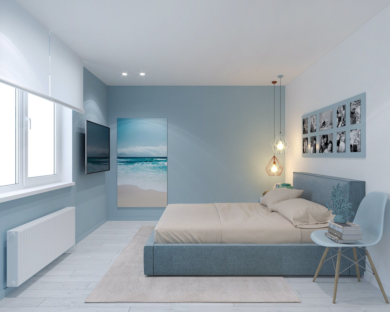 Спальня родителей выполенна в сочетании 2=х цветов: белый + голубой- морской. Тут же морскую атмосферу добавляет тематическая картина с морским берегом.