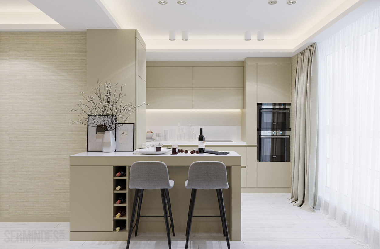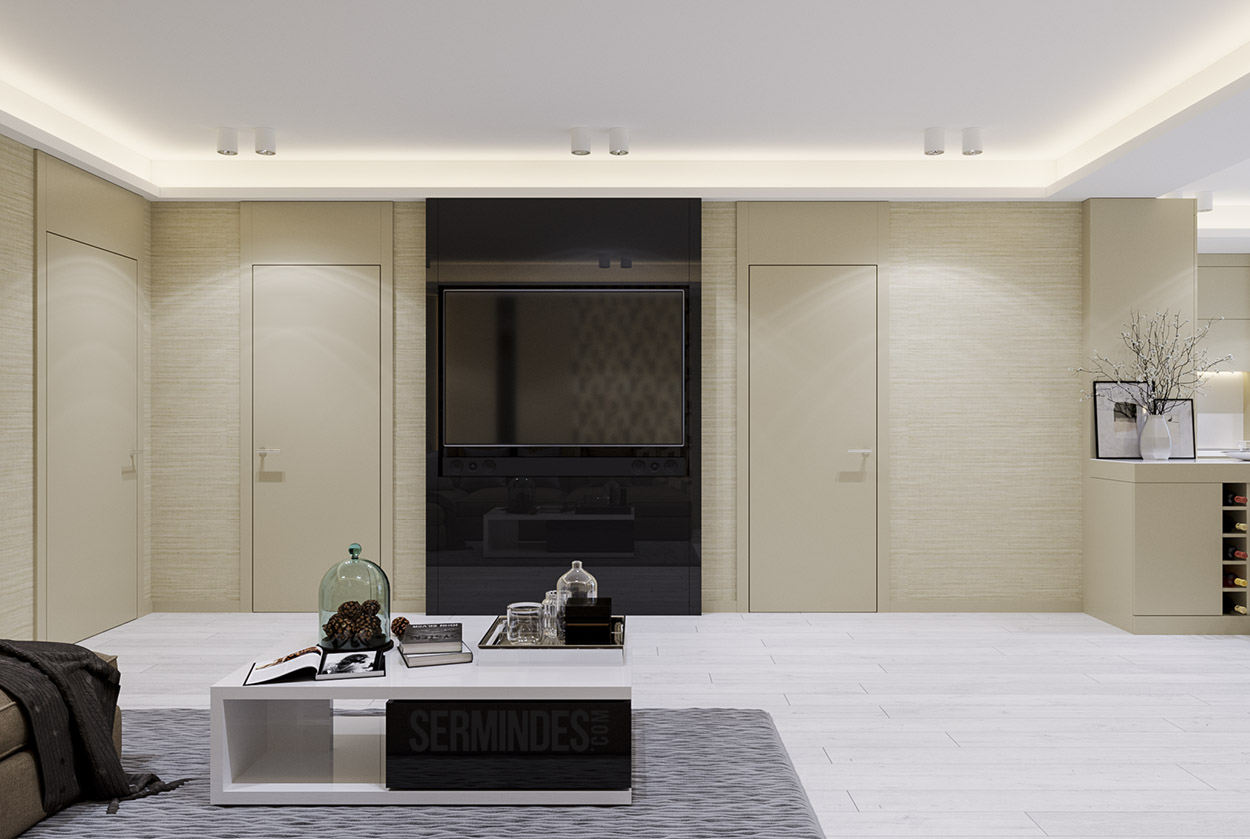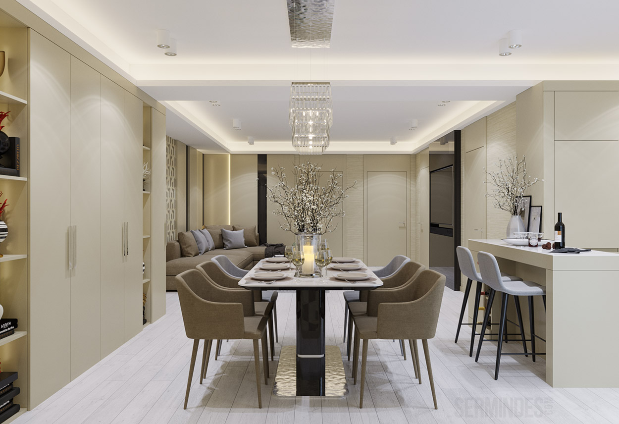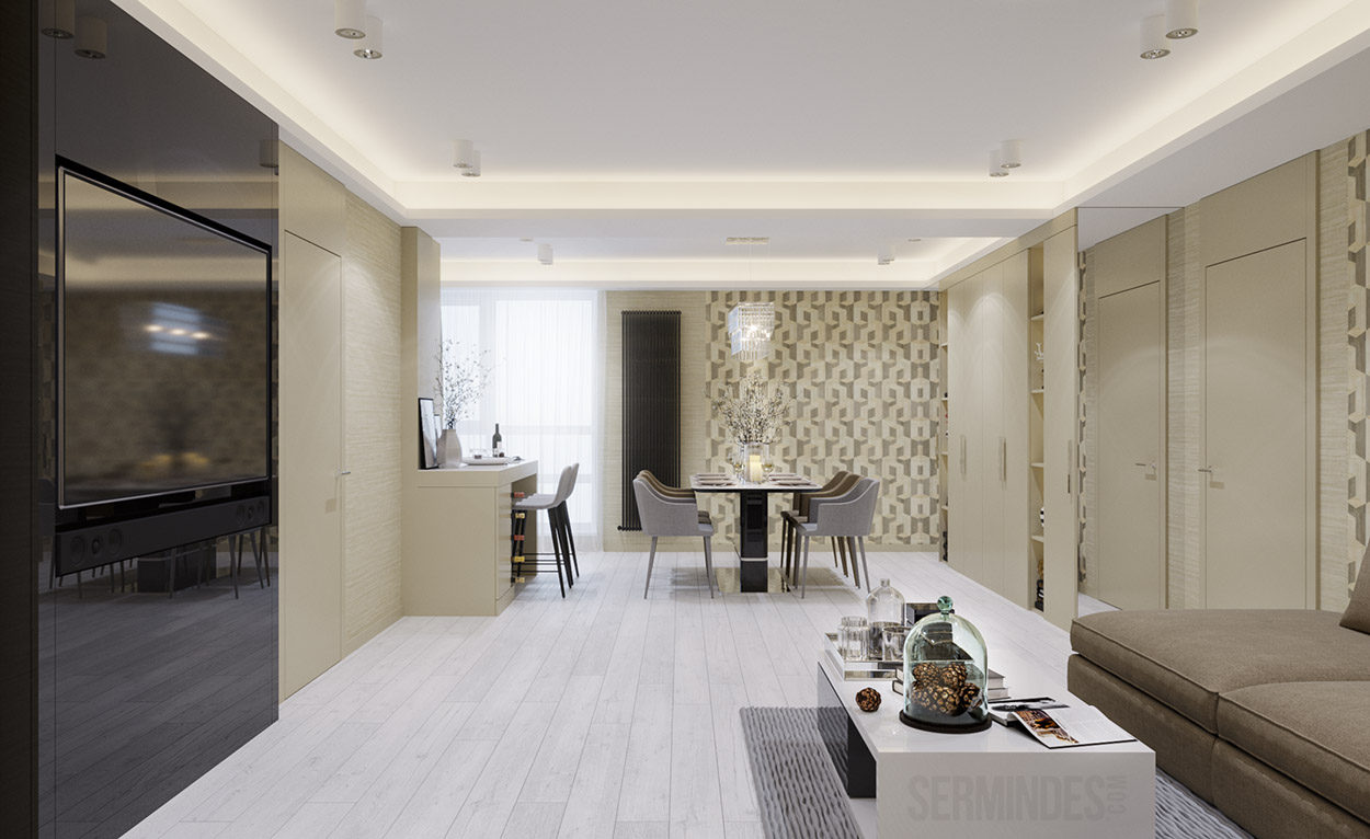 Квартира расположена в городе Кишиневе, Республика Молдова. Дизайн интерьера выполнен в современном минималистском стиле. Квартира с двумя спальнями, гостиной + гостиной + кухней + бар.