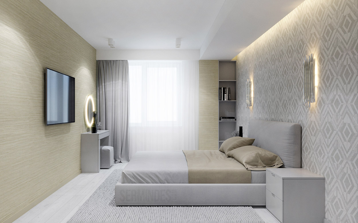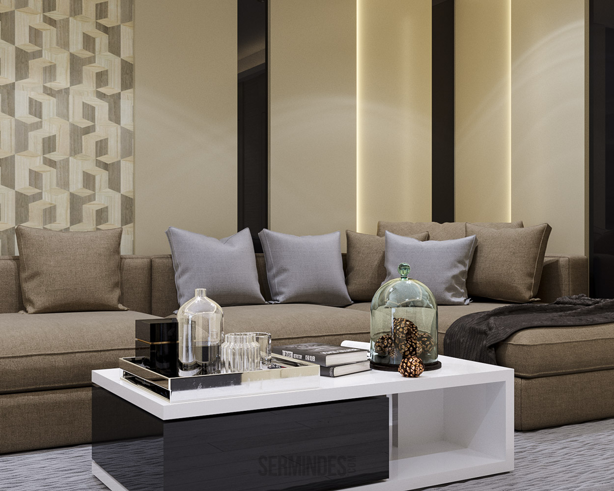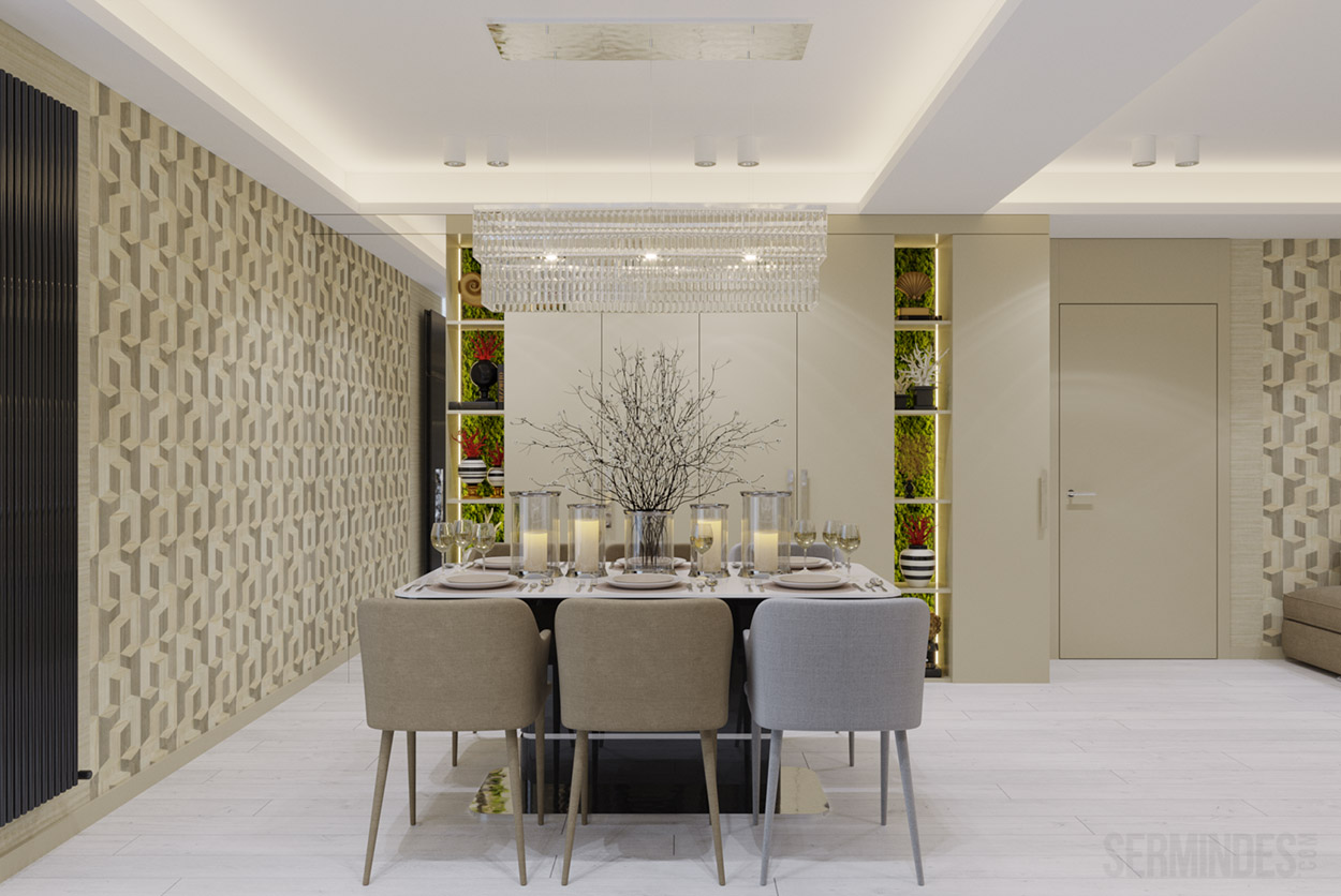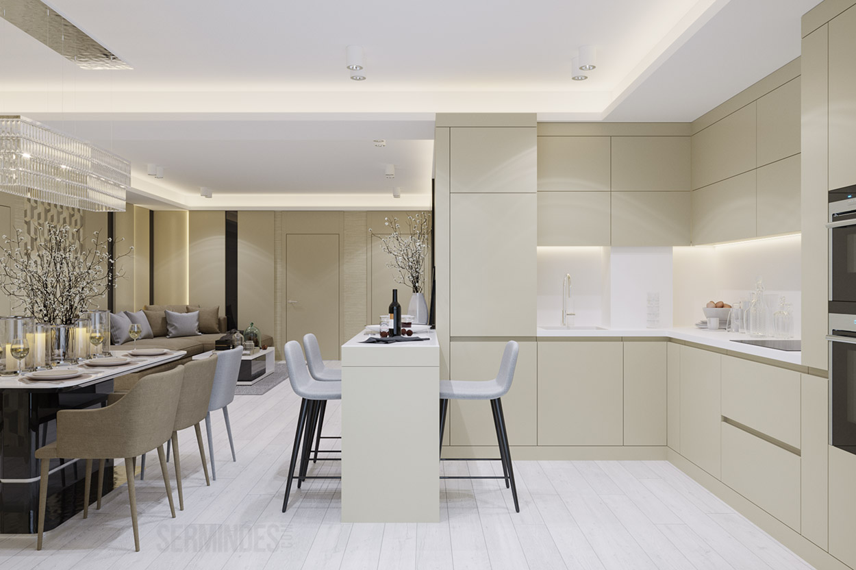 Квартира расположена в городе Кишиневе, Республика Молдова. Дизайн интерьера выполнен в современном минималистском стиле. Квартира с двумя спальнями, гостиной + гостиной + кухней + бар.
